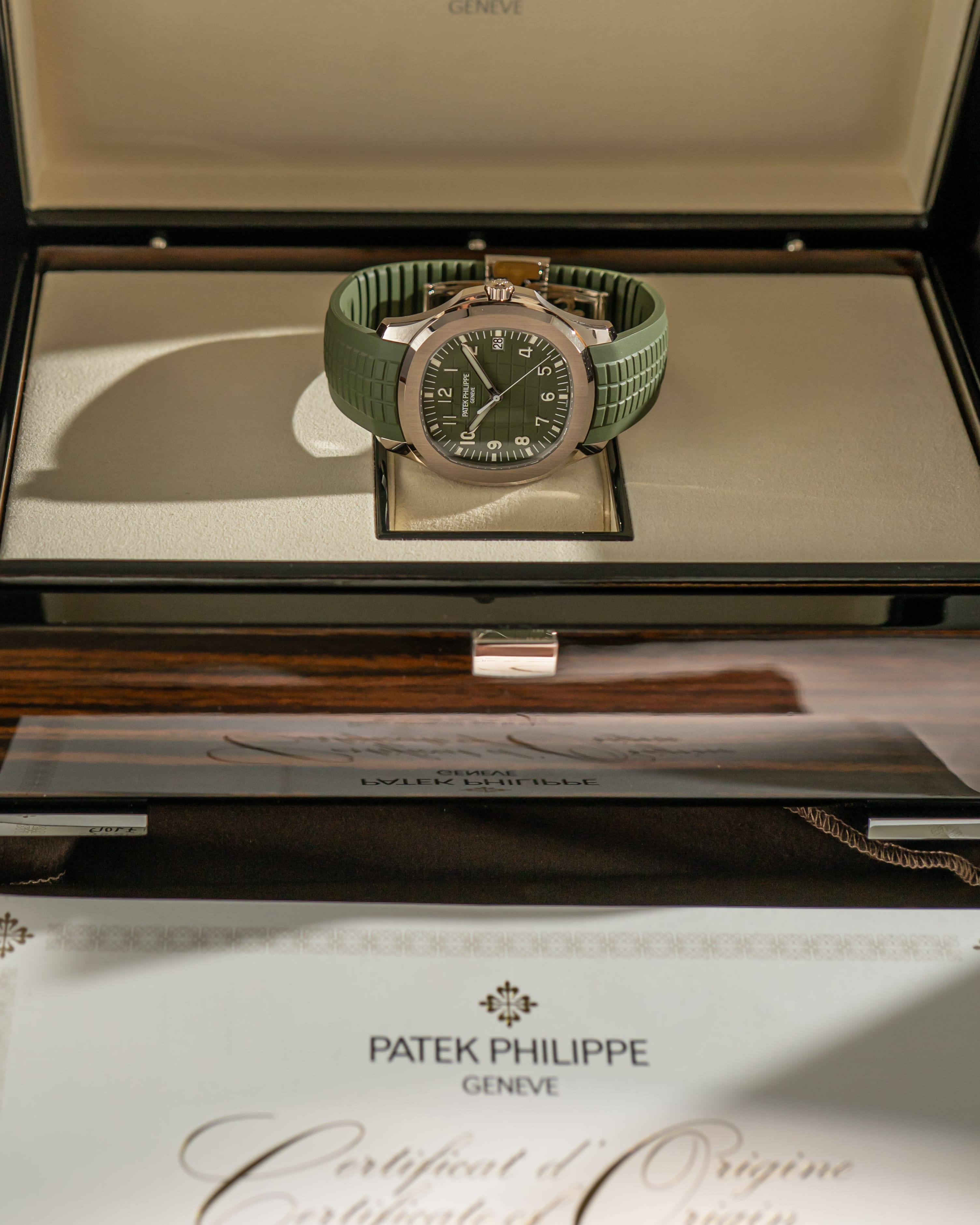 A contemporary take on a modern classic, the Patek Philippe Aquanaut 5168G in white gold pairs a bold khaki green dial with a matching composite strap, offering a refined yet sporty aesthetic with unmistakable presence.