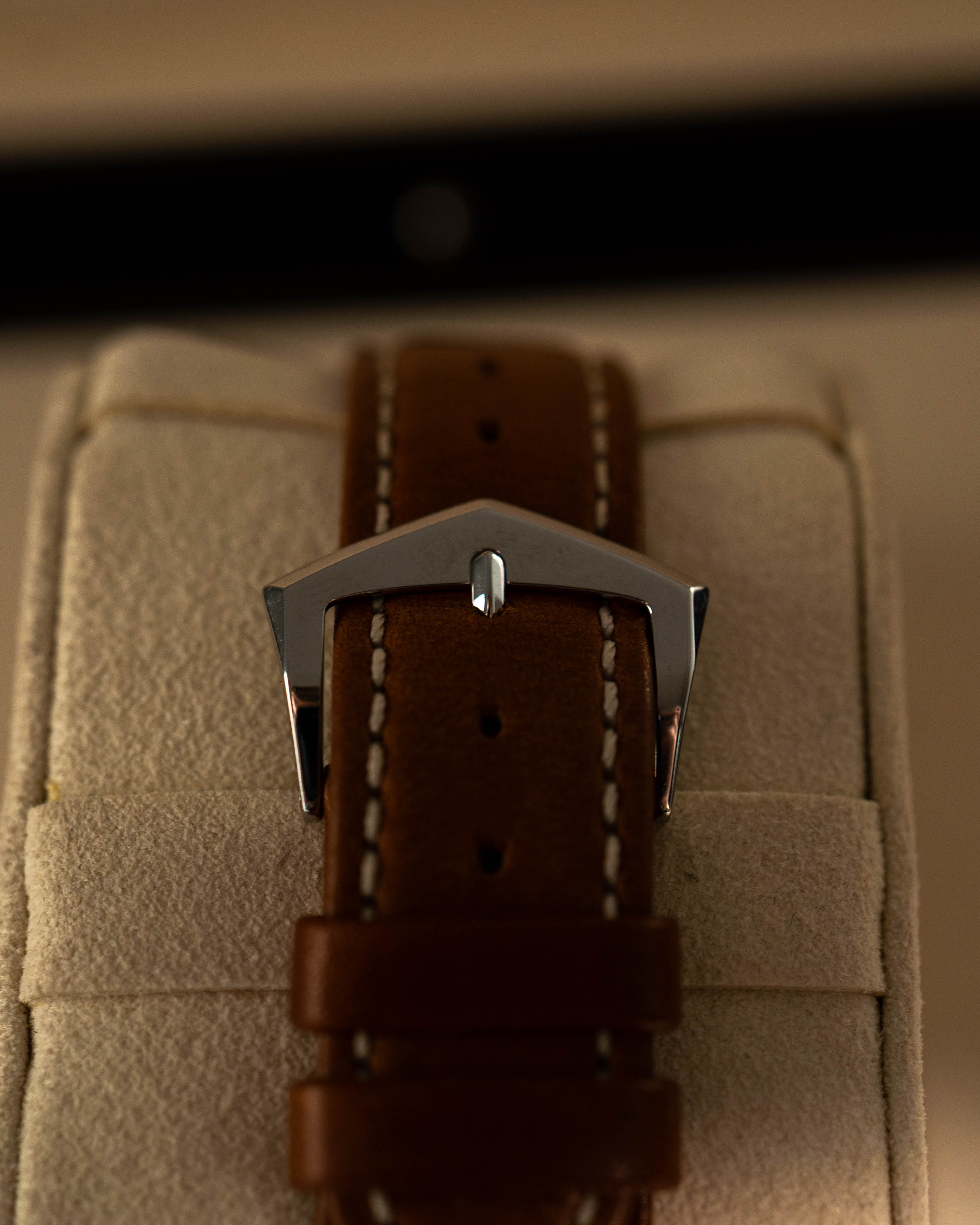 • Strap: Brown calfskin strap with stainless steel pin buckle
