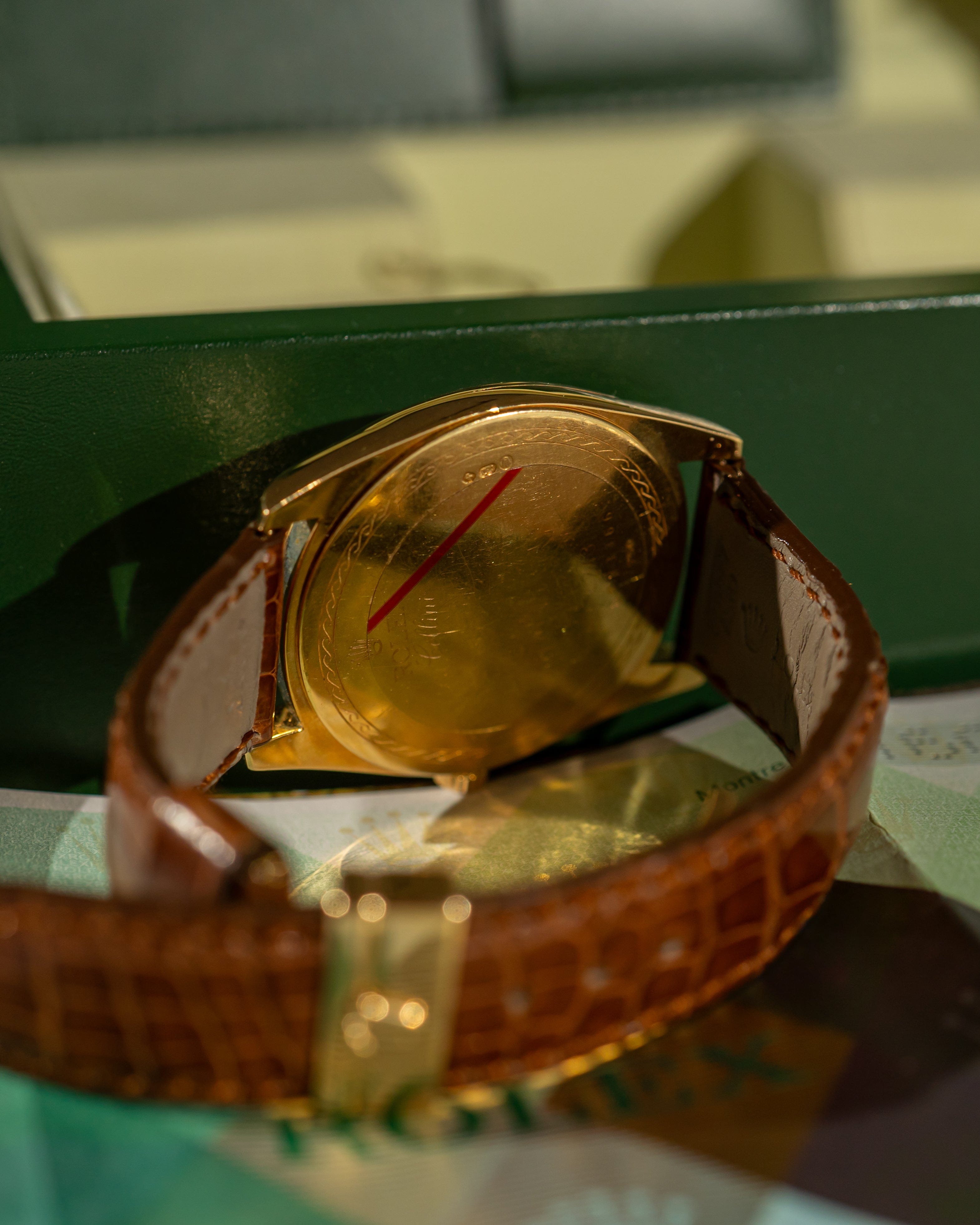 Strap: Brown alligator leather strap with 18k yellow gold Rolex pin buckle