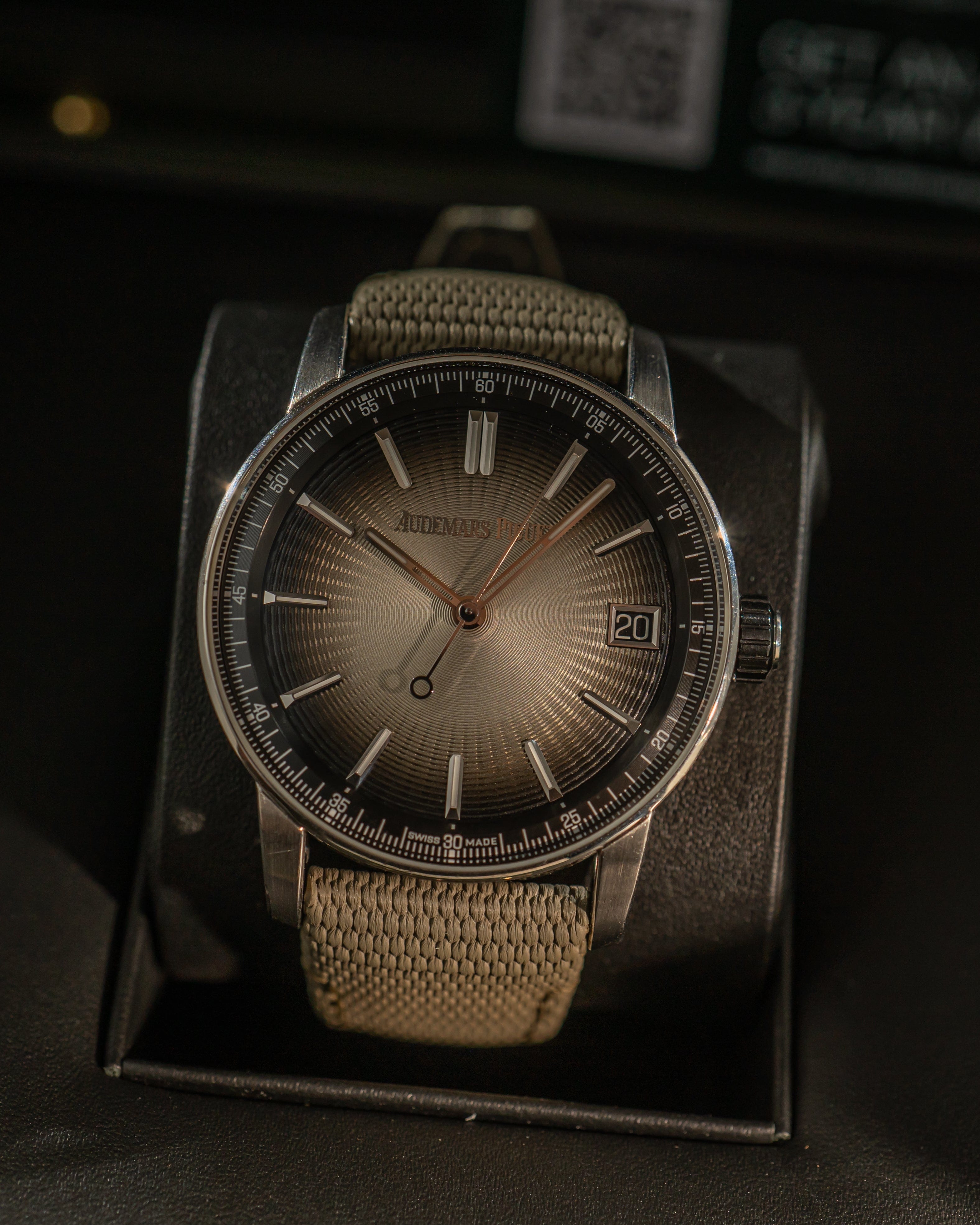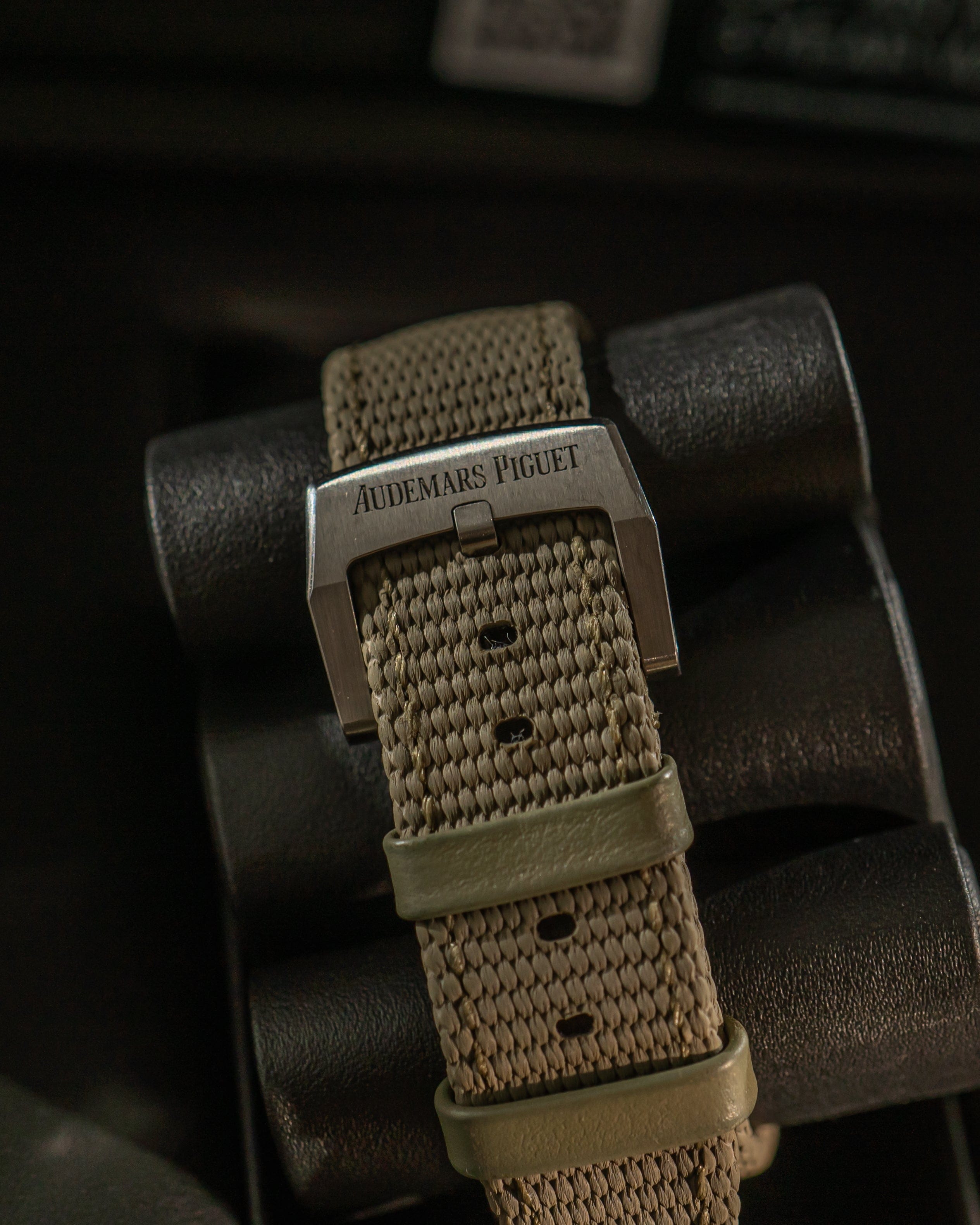 • Strap: Beige textile strap with Audemars Piguet pin buckle
