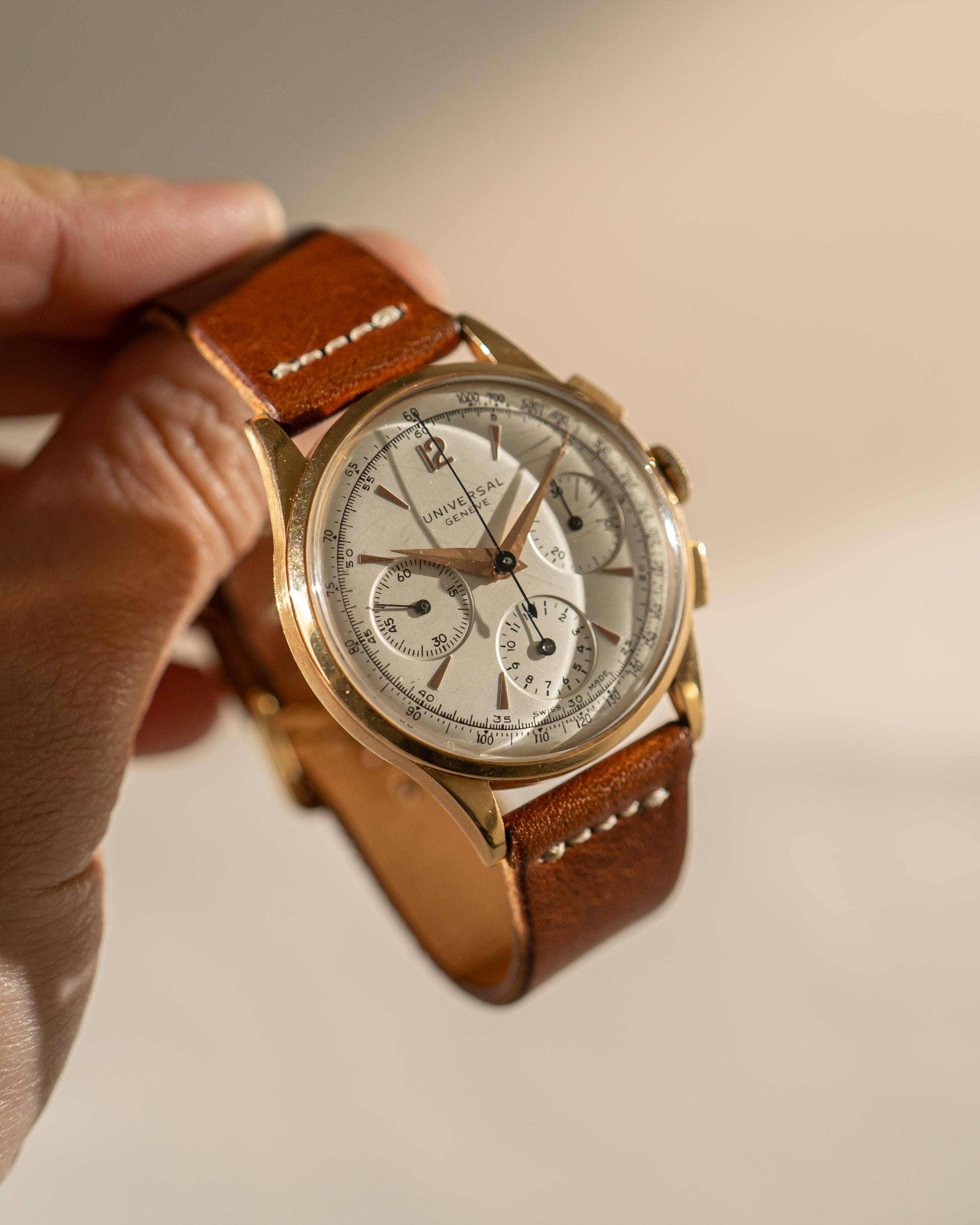 The Compax line represents the golden era of Universal Genève chronographs, and this 37mm rose gold example stands out for its balanced proportions, timeless design and enduring collector appeal.