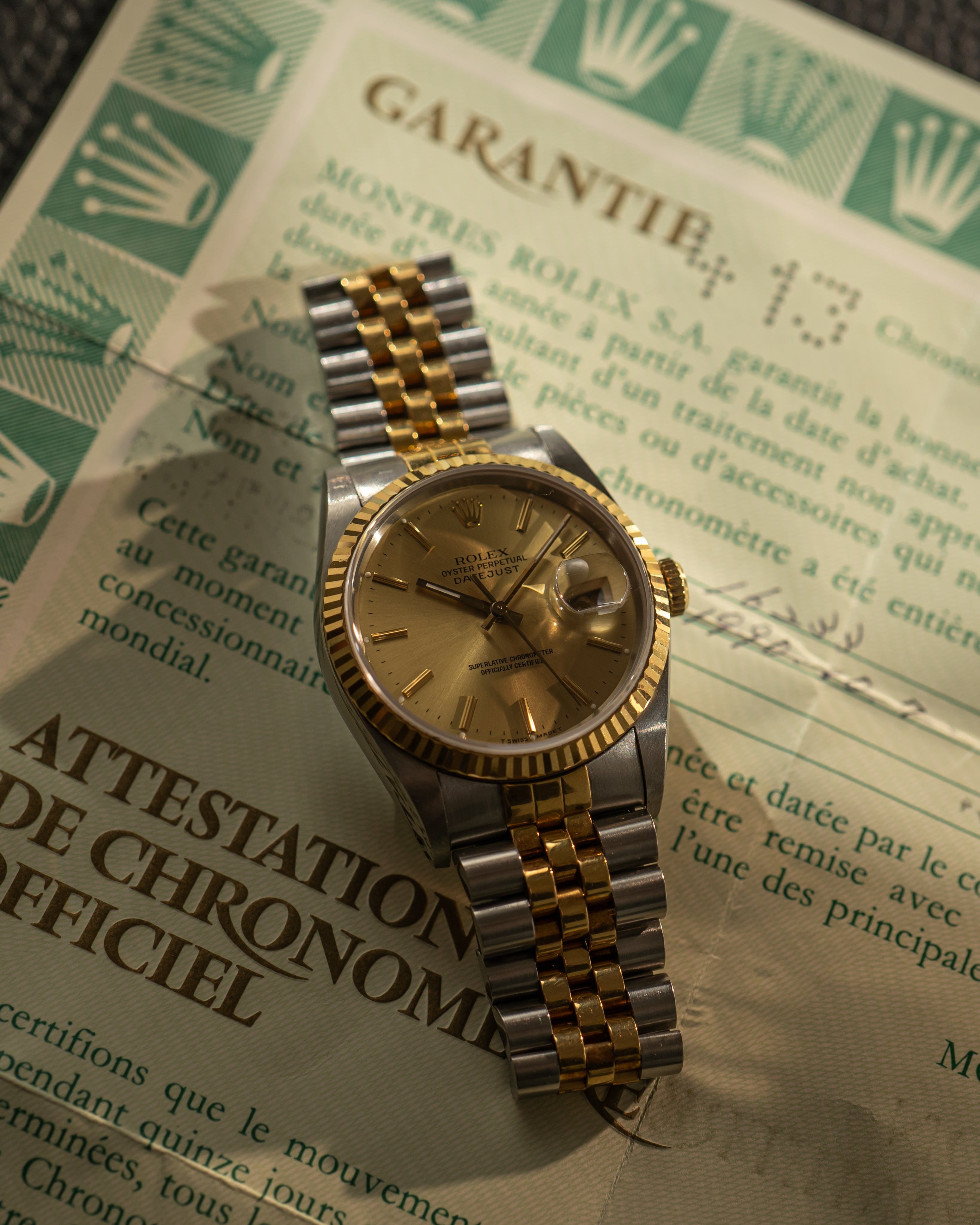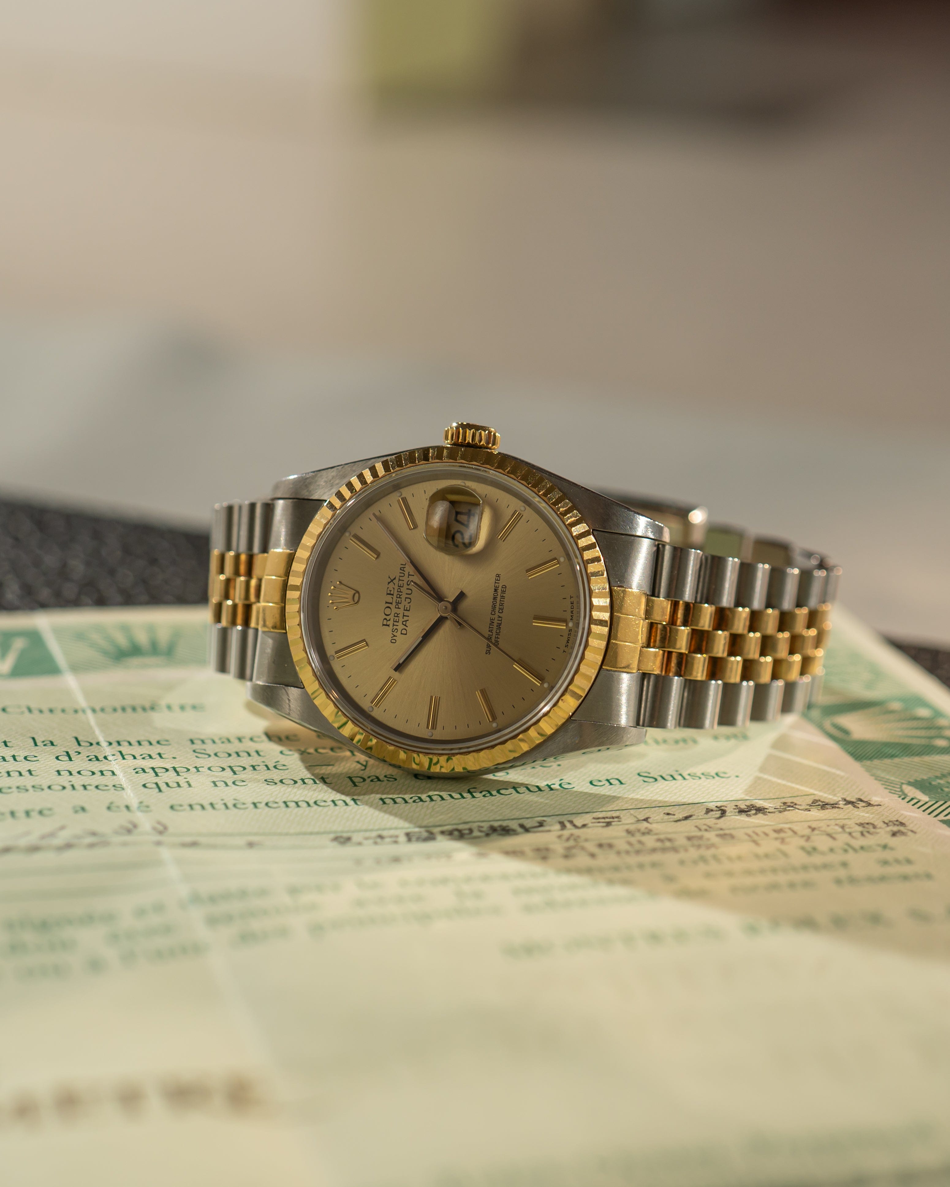 A classic two-tone Rolex Datejust 16233 in stainless steel and yellow gold, featuring the timeless champagne dial and fluted yellow gold bezel. An icon of Rolex design that perfectly balances everyday wearability with enduring elegance.