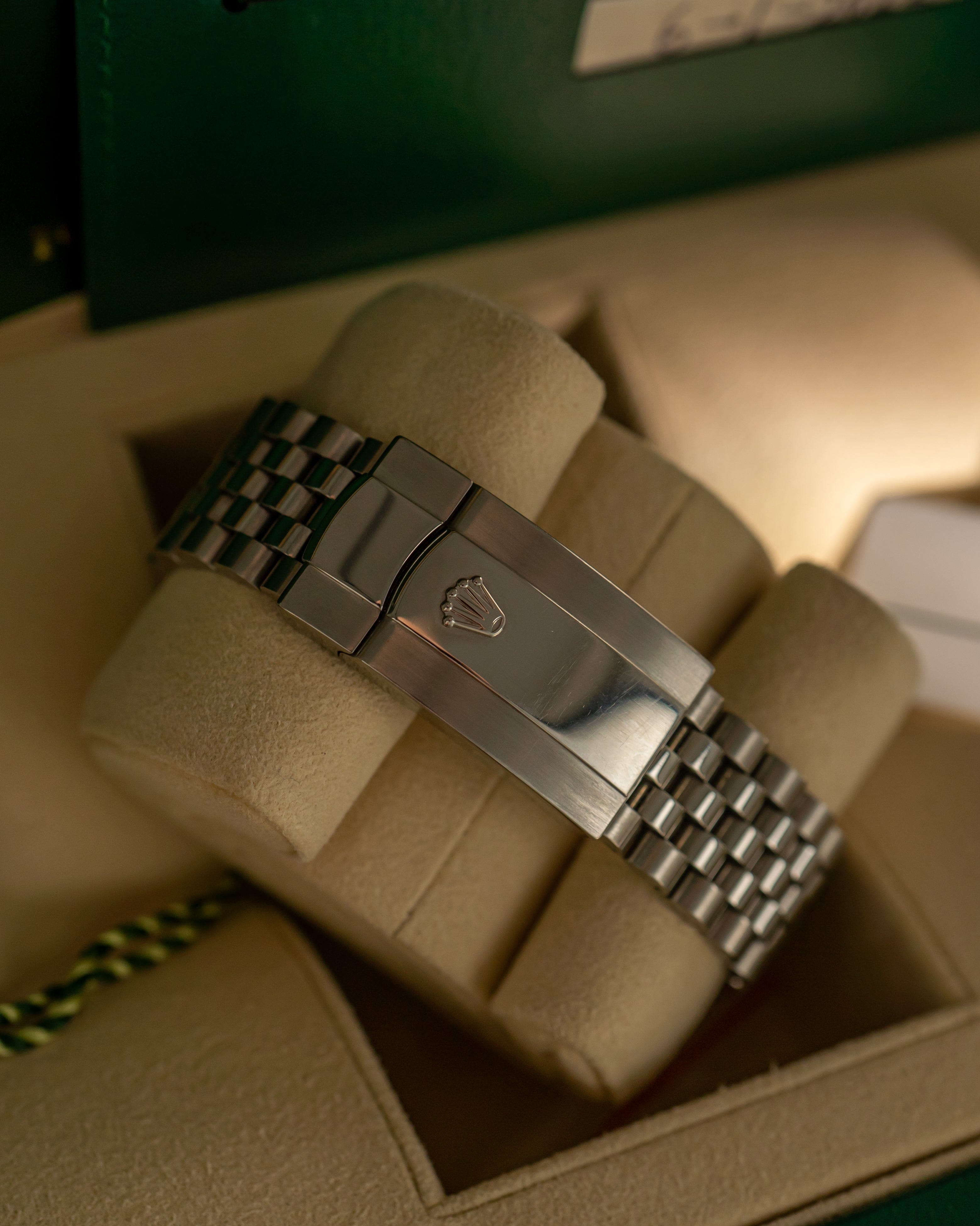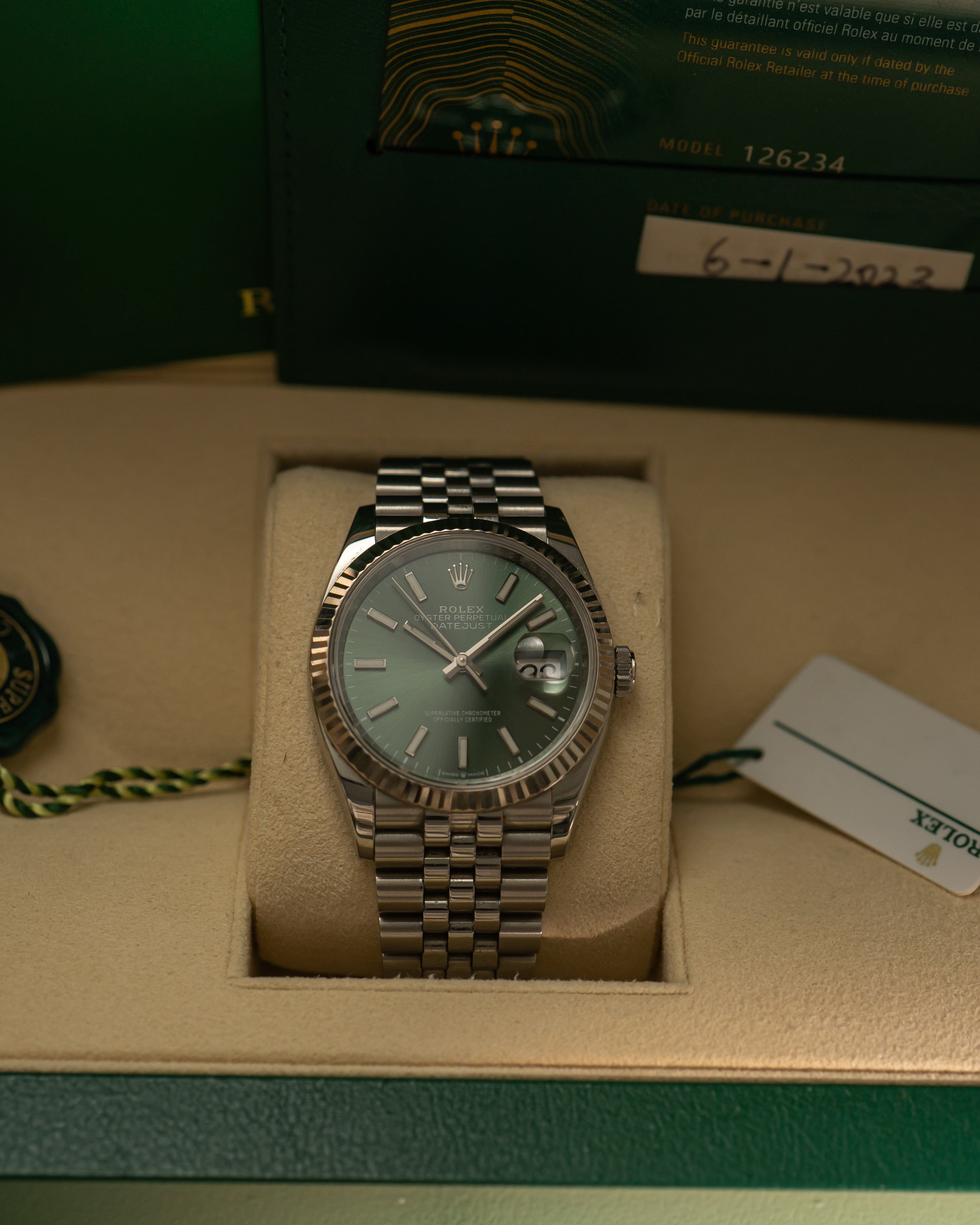 The Datejust 126234 with green dial offers a refined balance of sport and elegance, powered by the modern Caliber 3235 and presented in one of the most desirable contemporary dial colors.