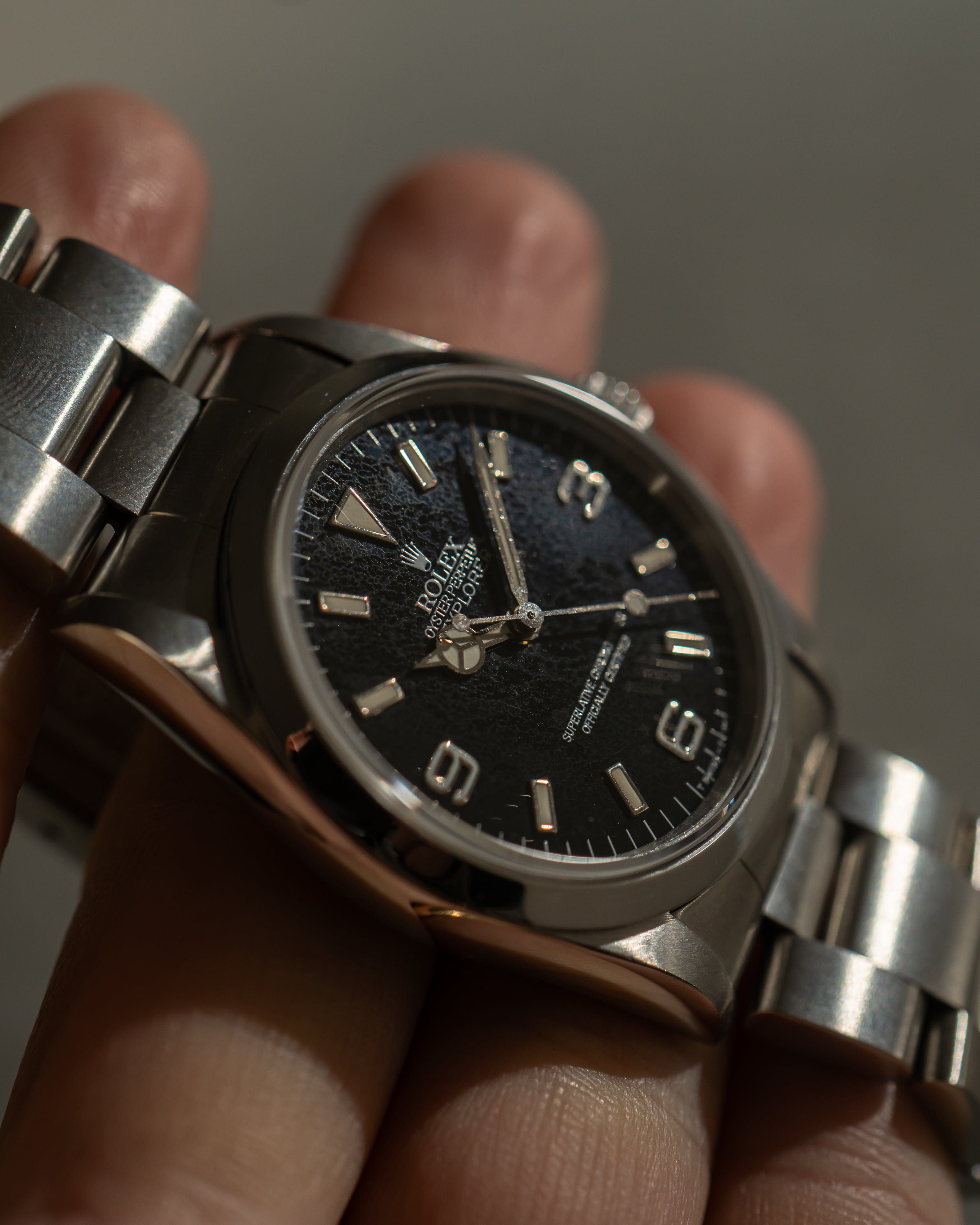 A classic mid-1990s Rolex Explorer I featuring a desirable spider dial, where the glossy black lacquer has developed an even web-like cracking over time. The 14270 represents the perfect balance between vintage charm and modern reliability, and this T-serial example from 1996 showcases that character beautifully.