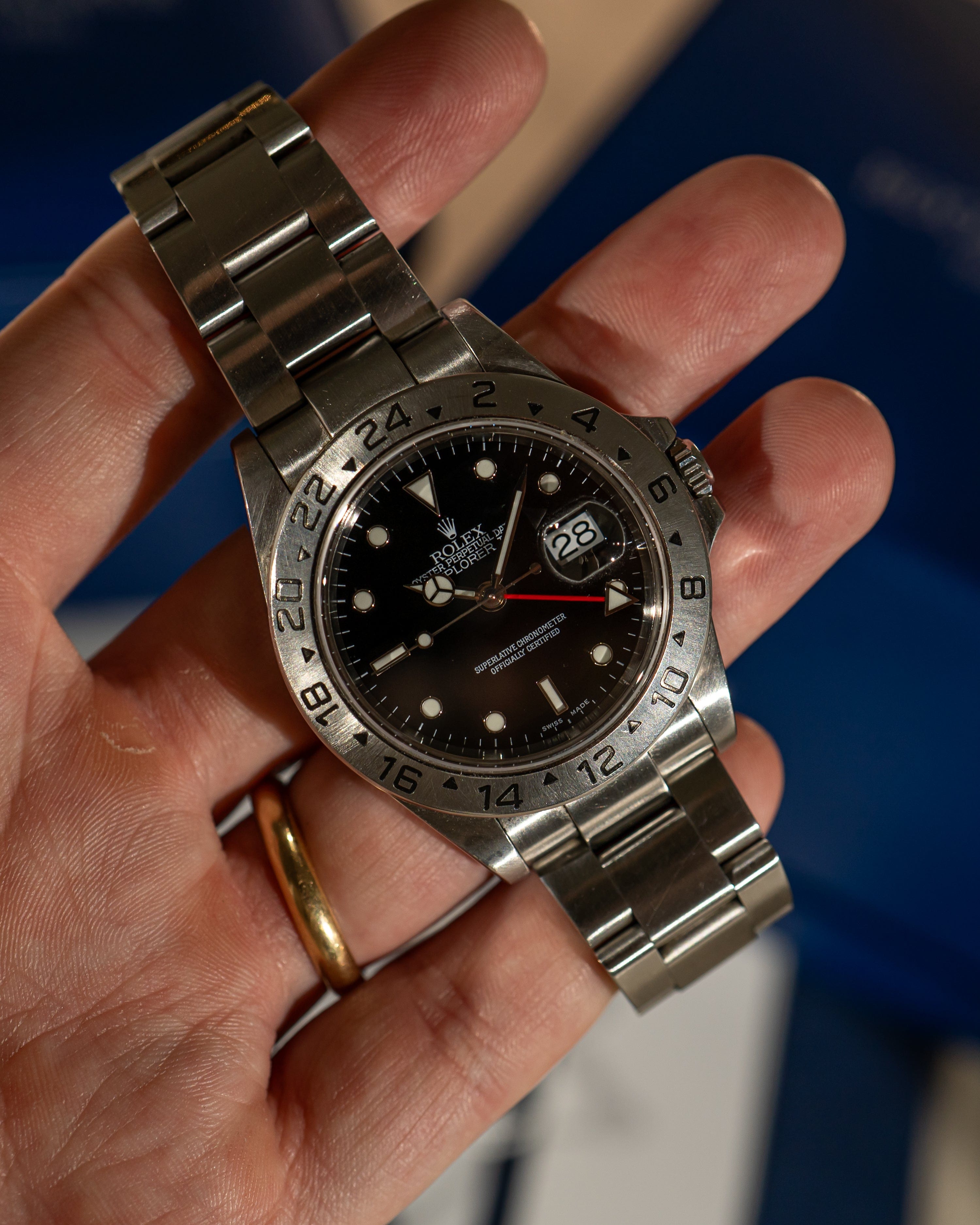 This classic 16570 Explorer II is a versatile and durable companion for everyday wear, distinguished by its understated black dial and iconic red GMT hand.