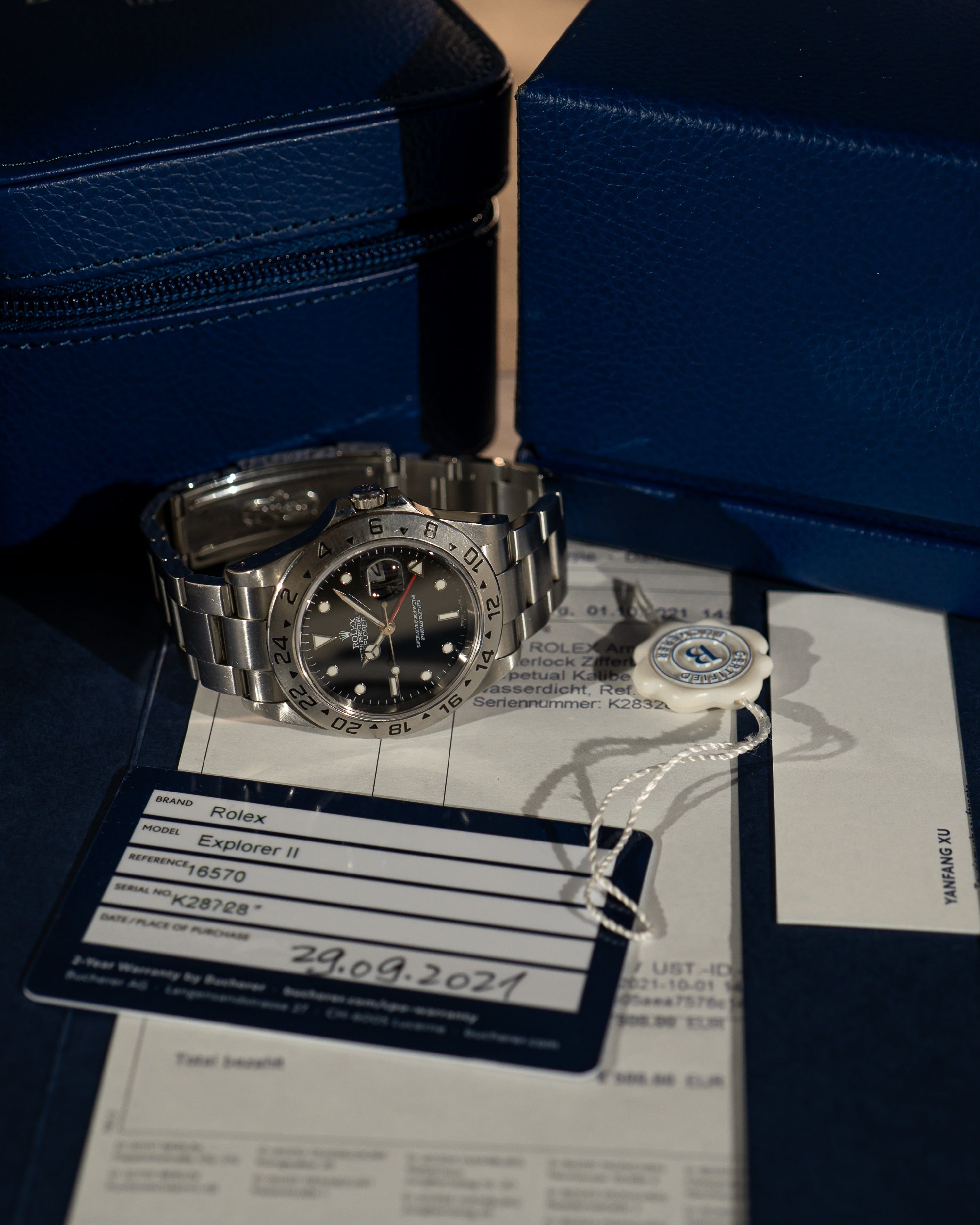 A robust tool watch with dual time zone functionality, the Rolex Explorer II 16570 in black dial configuration offers classic aesthetics and proven reliability—here presented as a Bucherer Certified Pre-Owned piece.