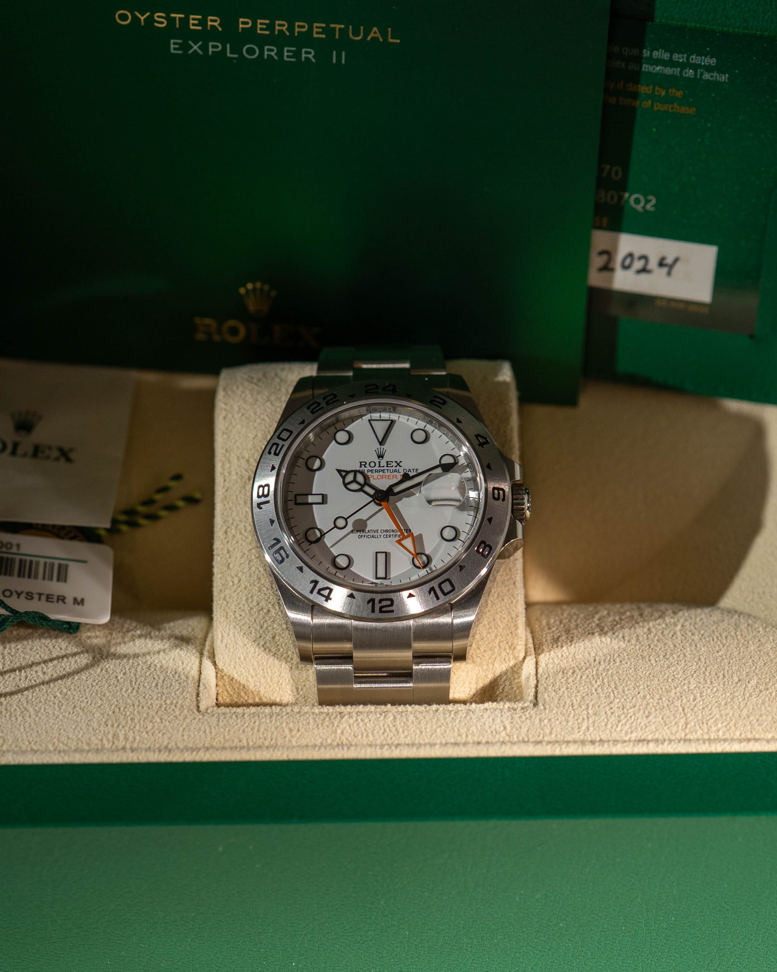 The Explorer II 226570 is Rolex's definitive tool watch for those who demand legibility and precision in any environment - the bright white "Polar" dial paired with the bold orange GMT hand making it one of the most visually striking references in the current lineup. Introduced in 2021, the 226570 brought a larger 42mm case and the modern Caliber 3285 to a reference with a direct lineage to cave explorers and polar expeditions.