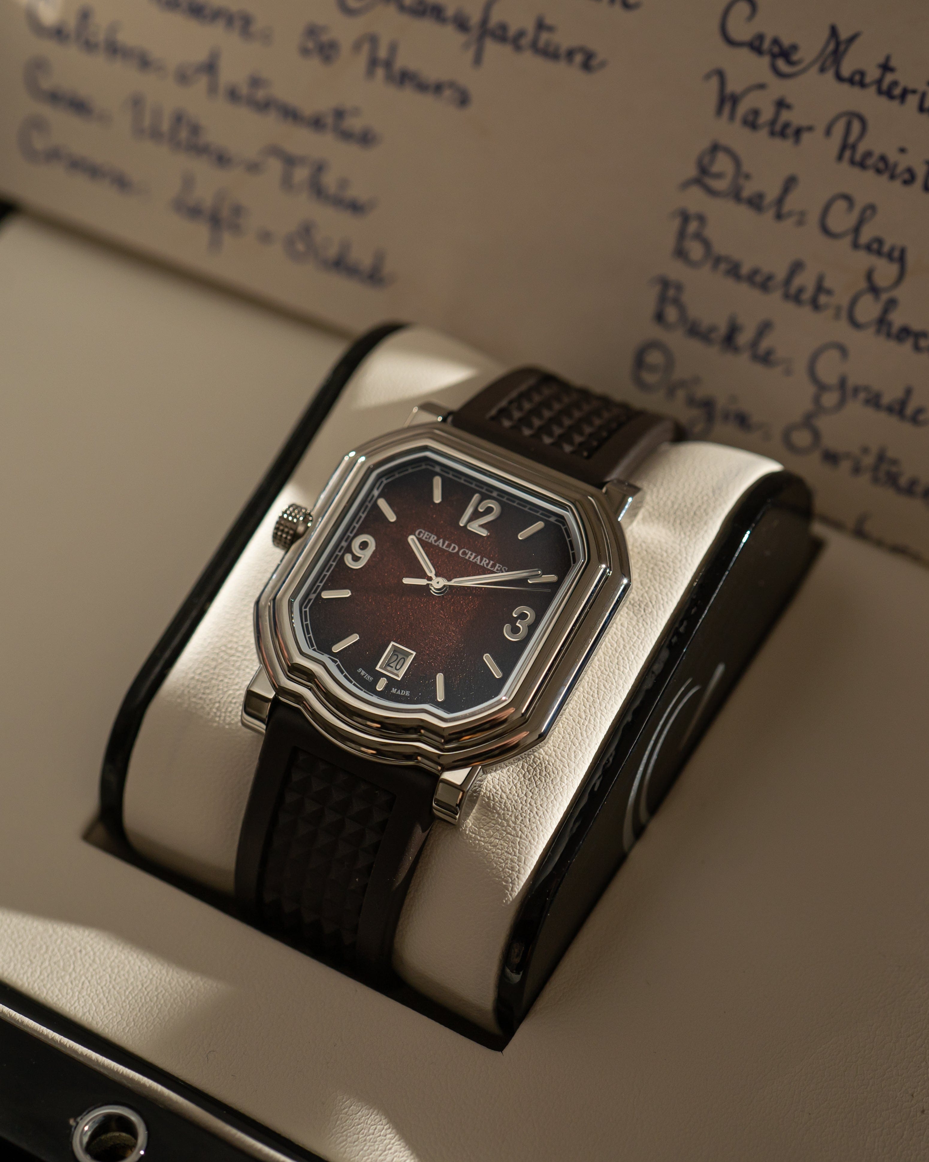 A modern Gerald Charles GC Sport featuring the distinctive Maestro-inspired case design and a rich textured brown dial, paired with a sporty rubber strap. A contemporary luxury sports watch that blends elegance with everyday versatility.