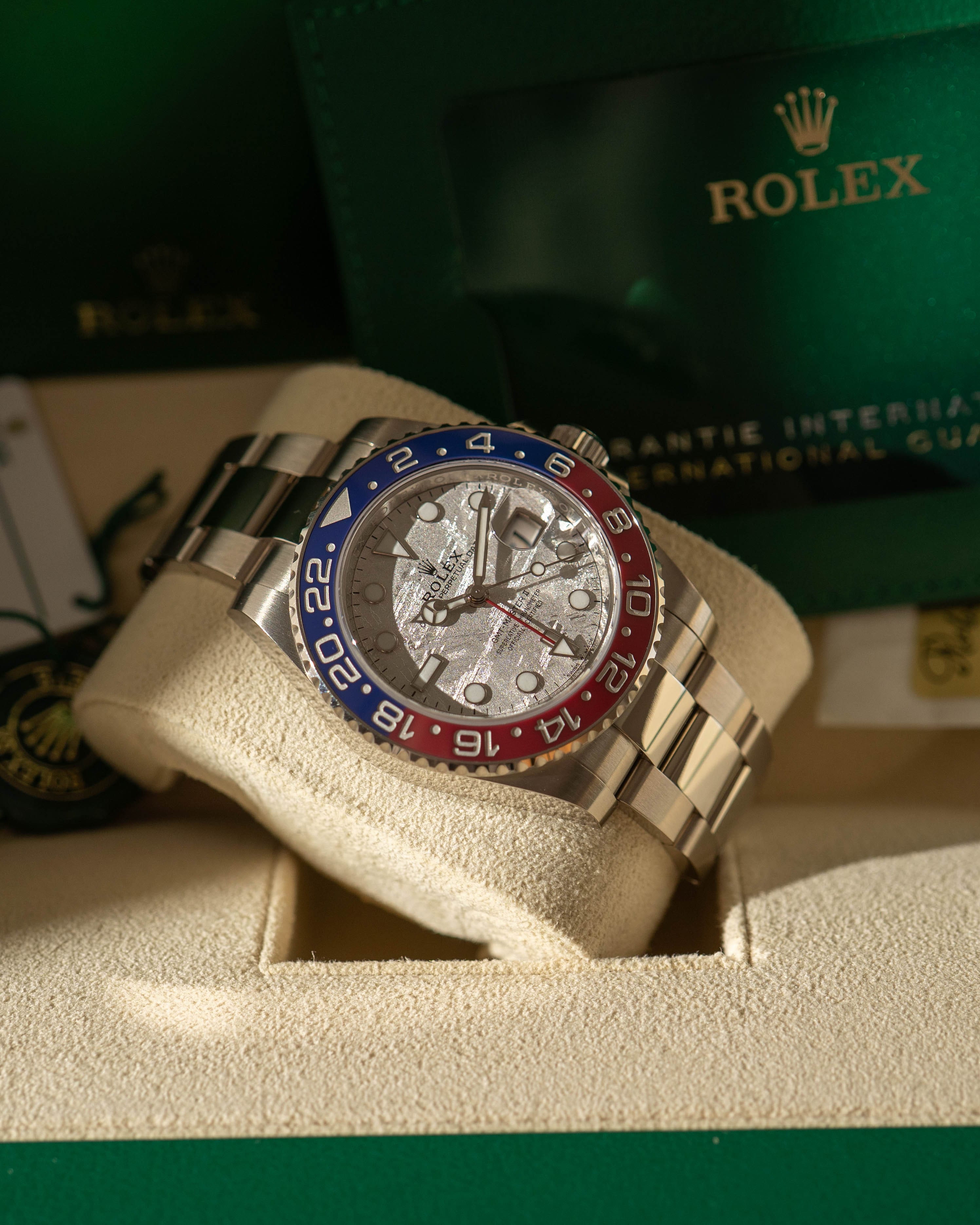An exceptional and highly collectible GMT-Master II in 18k white gold, featuring the striking and rare meteorite dial paired with the iconic blue and red Pepsi bezel. A perfect blend of precious metal exclusivity and legendary GMT functionality.