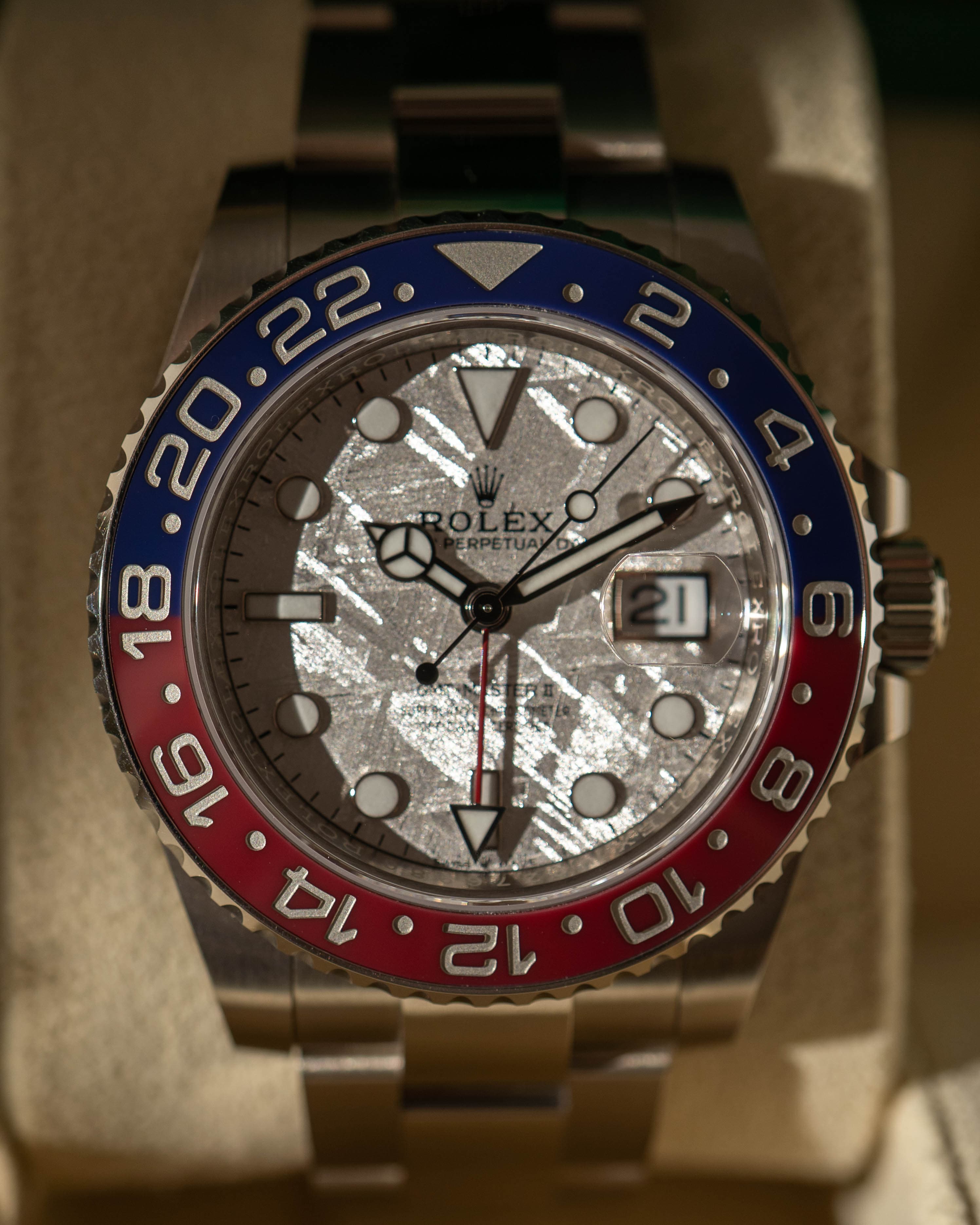 The 126719BLRO with meteorite dial is one of the most distinctive modern GMT-Master II references, combining the weight and presence of white gold with a naturally unique dial - no two meteorite patterns are ever the same.