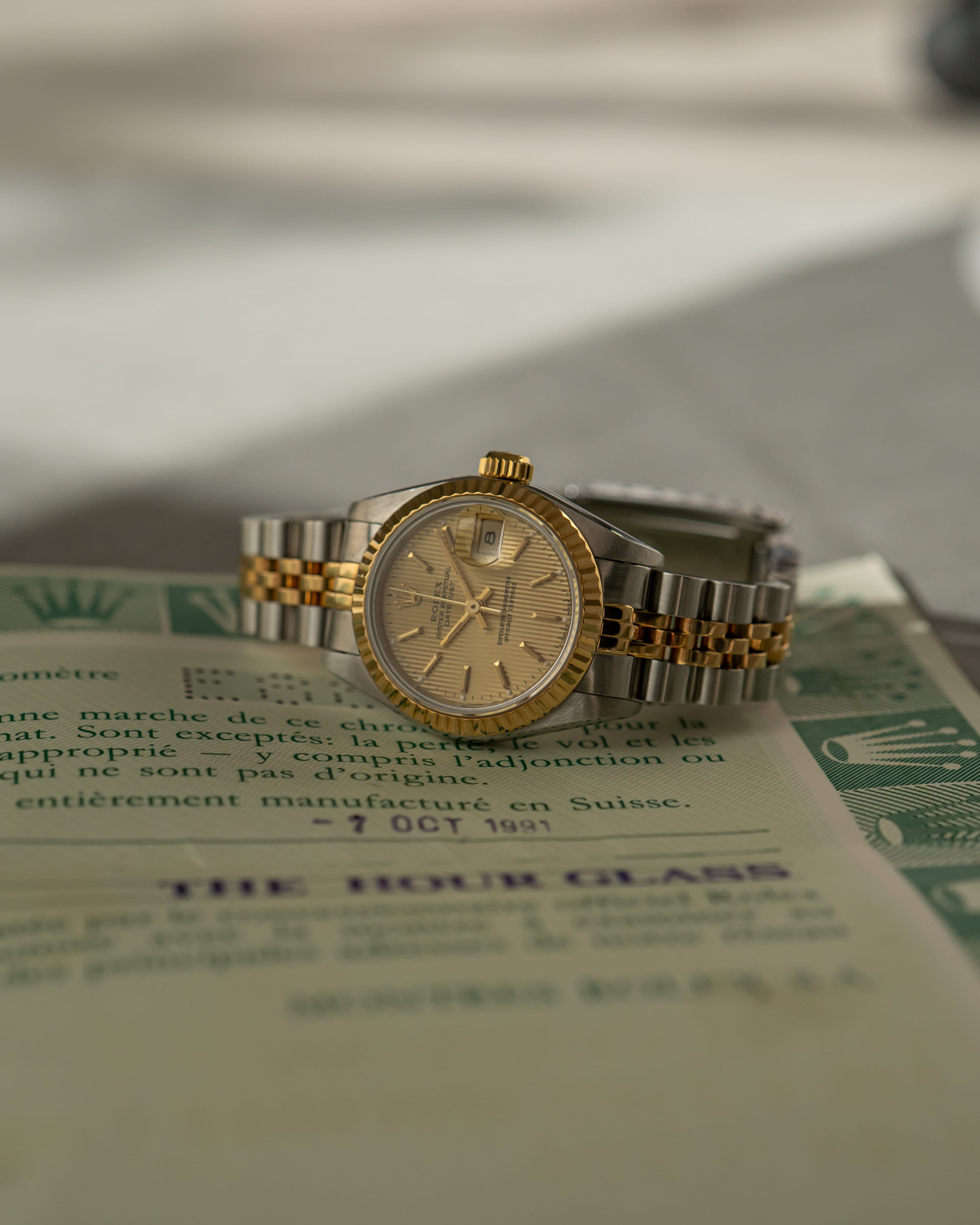A beautifully classic Rolex Datejust 26 featuring the distinctive champagne tapestry dial, adding depth and vintage charm to this timeless two-tone configuration. Paired with the iconic Jubilee bracelet and fluted bezel, this piece captures the essence of early 90s Rolex elegance.
