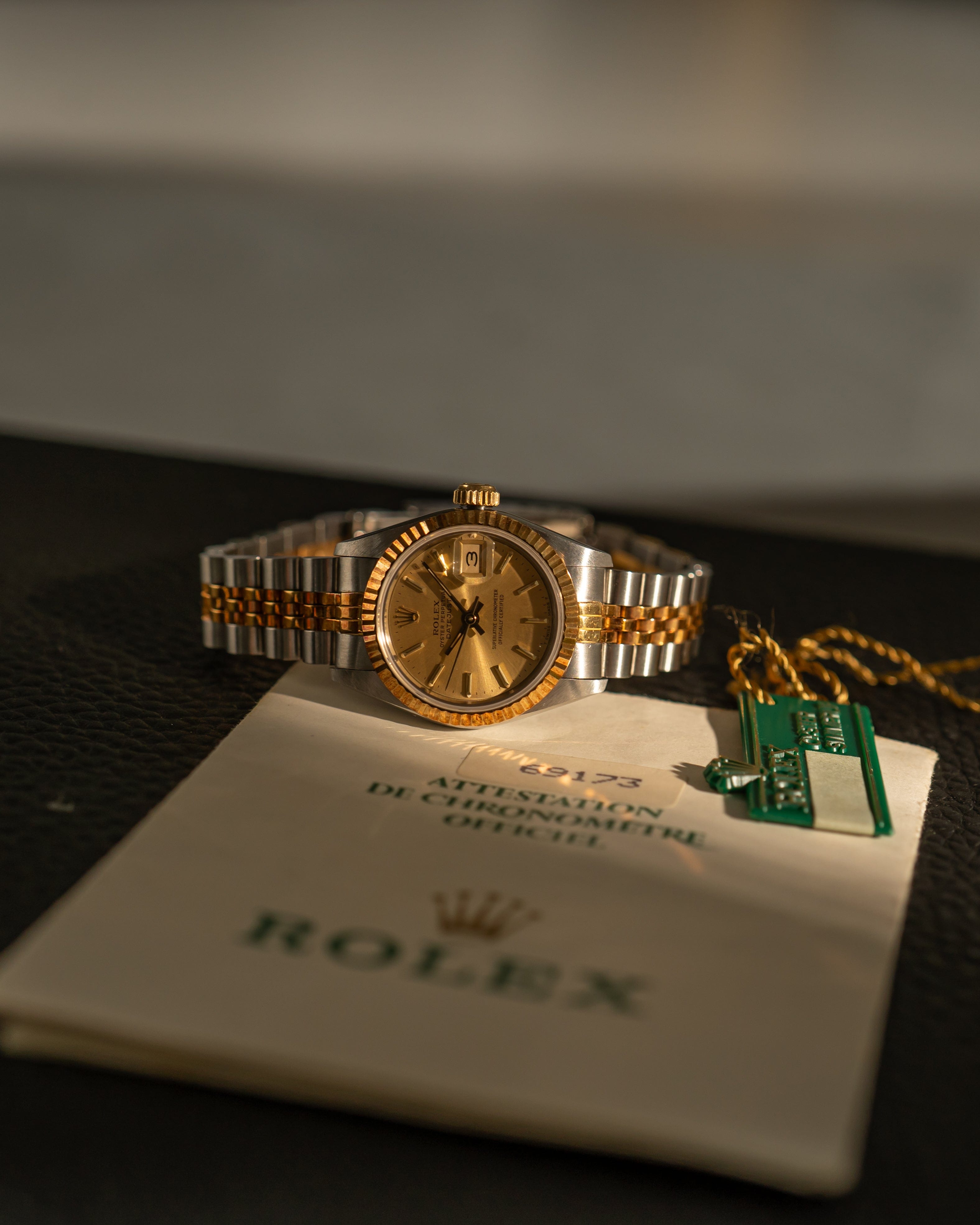 An elegant and timeless Lady-Datejust in classic two-tone configuration, featuring a champagne dial and fluted yellow gold bezel. The ref. 69173 perfectly captures Rolex’s signature blend of refinement and everyday durability in a versatile 26mm case.