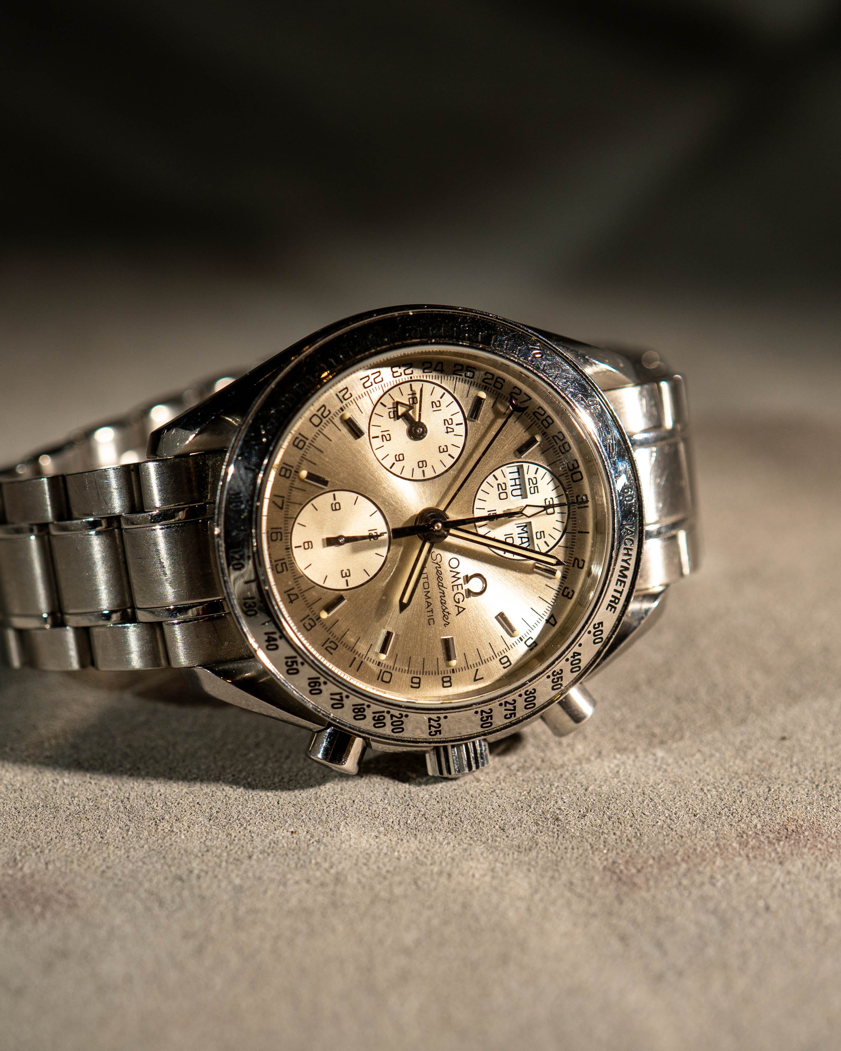 The Speedmaster Day-Date is the lesser-known but more complicated sibling of the classic Speedmaster, combining a full chronograph with a triple-calendar display in a wrist-friendly 39mm case. The warm champagne dial with matching subdials gives this reference a cohesive, dressed-down character that sits equally well in and out of the office.
