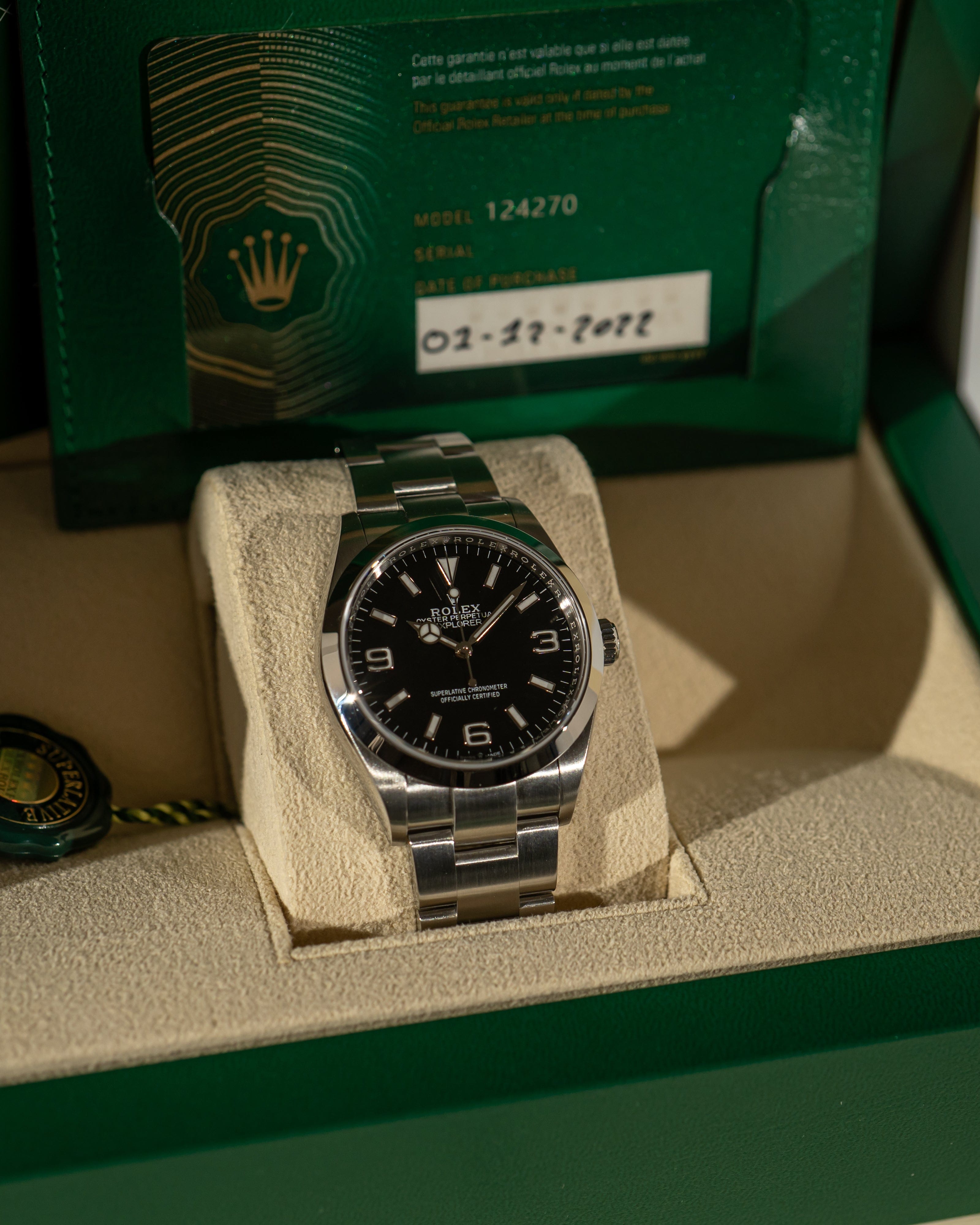 A pristine example of the modern 36mm Rolex Explorer, reference 124270 — a return to the classic proportions that made the Explorer an icon. This 2022 full set is in excellent condition with light signs of normal wear, featuring the clean black dial with 3–6–9 layout and Rolex’s latest movement technology.