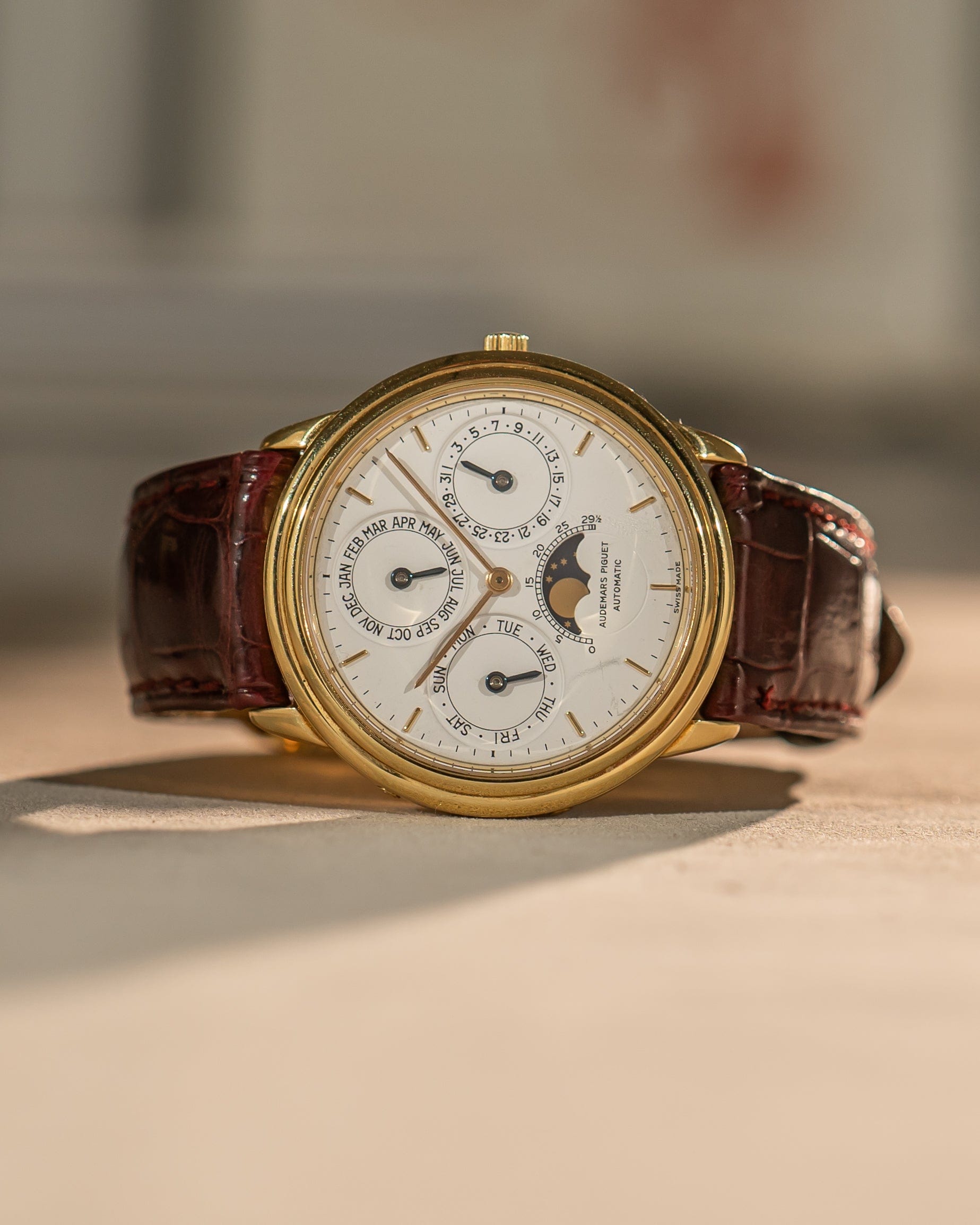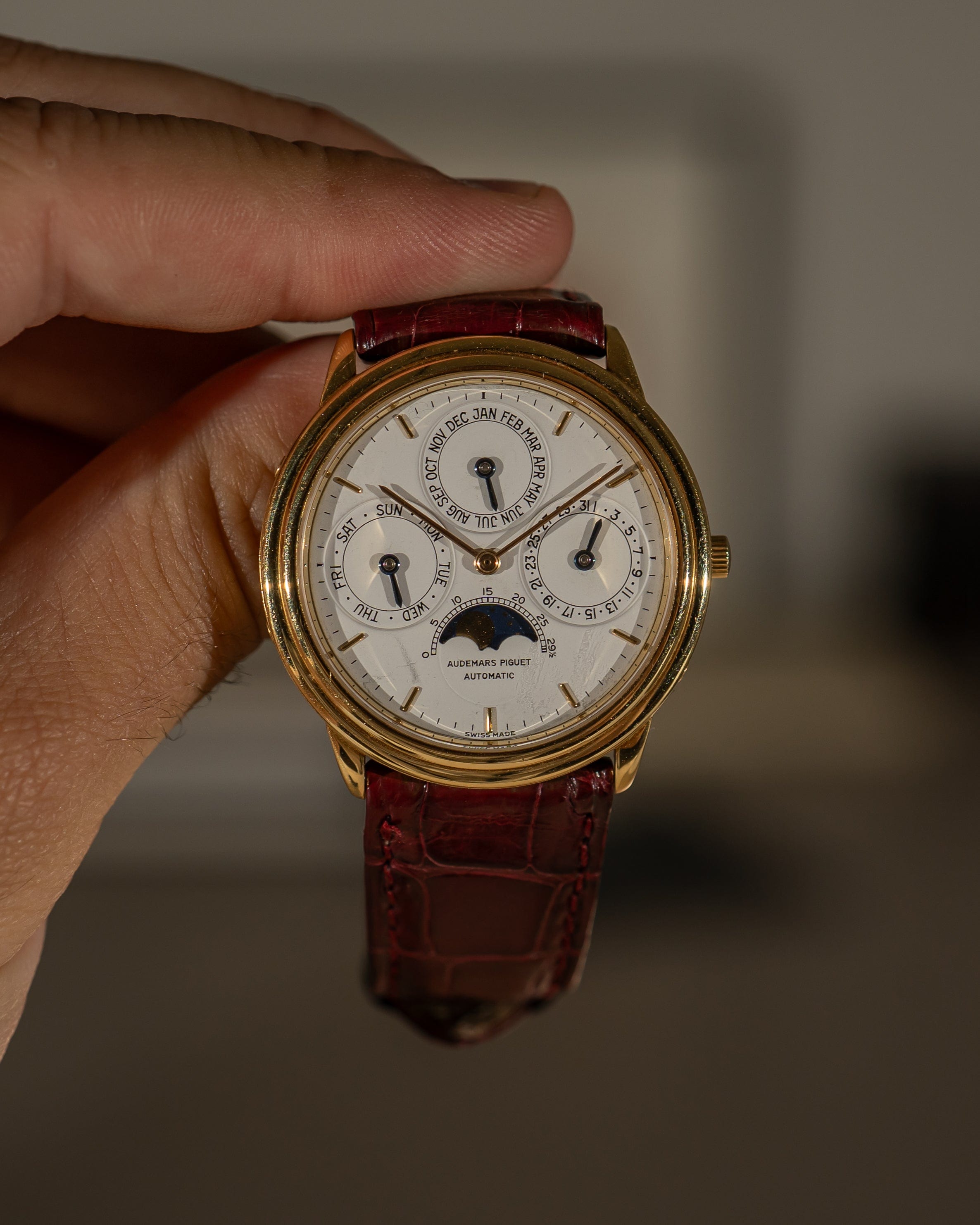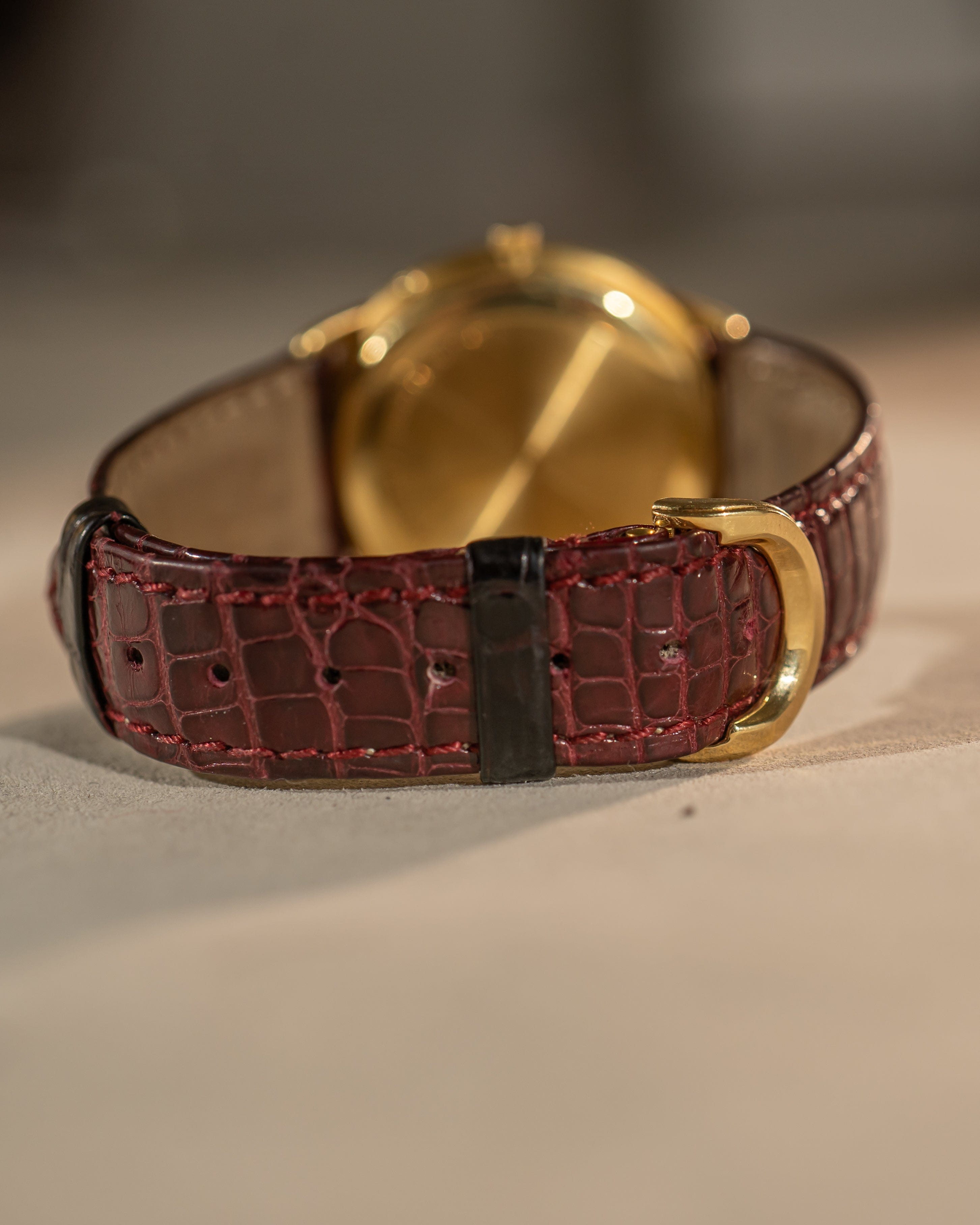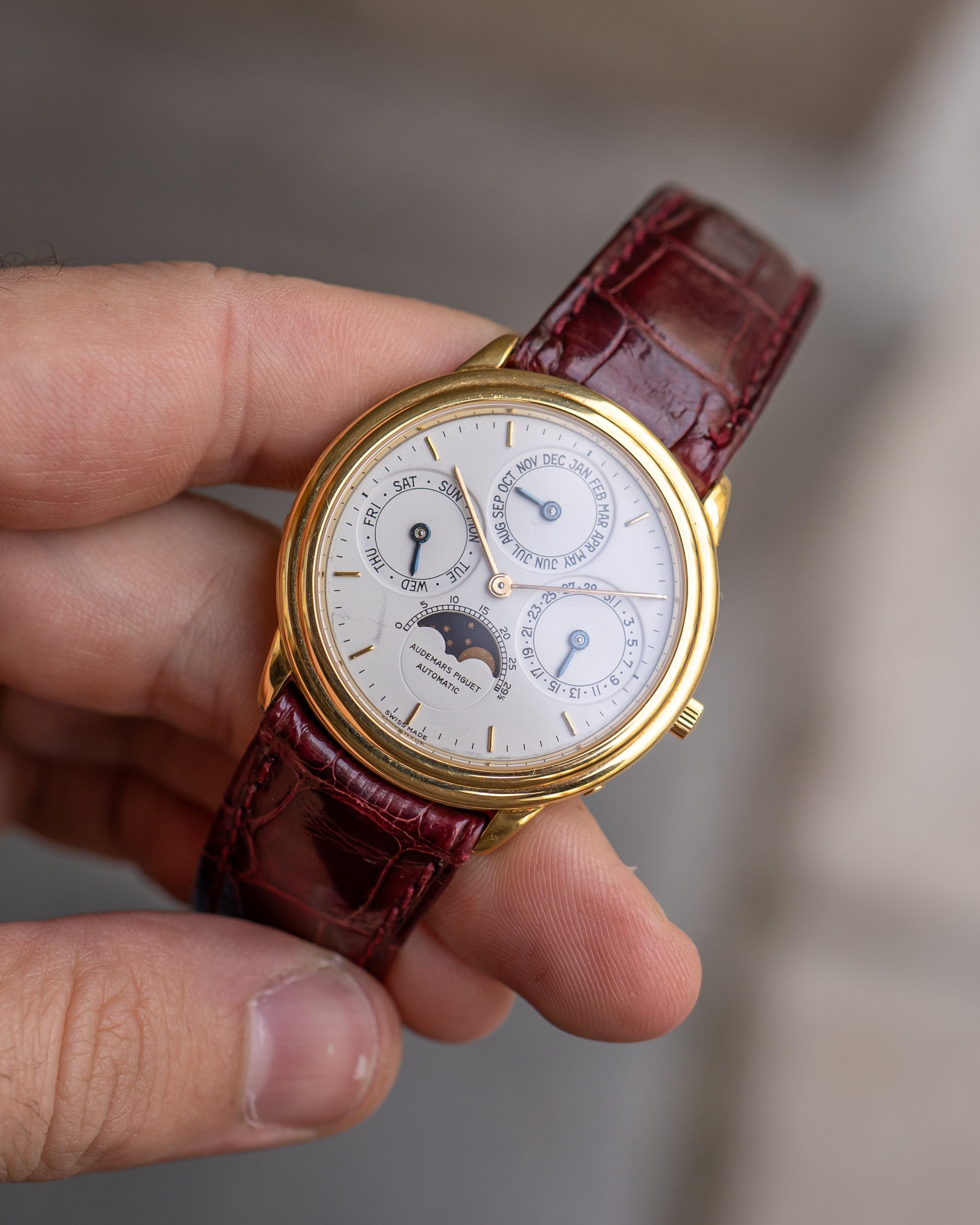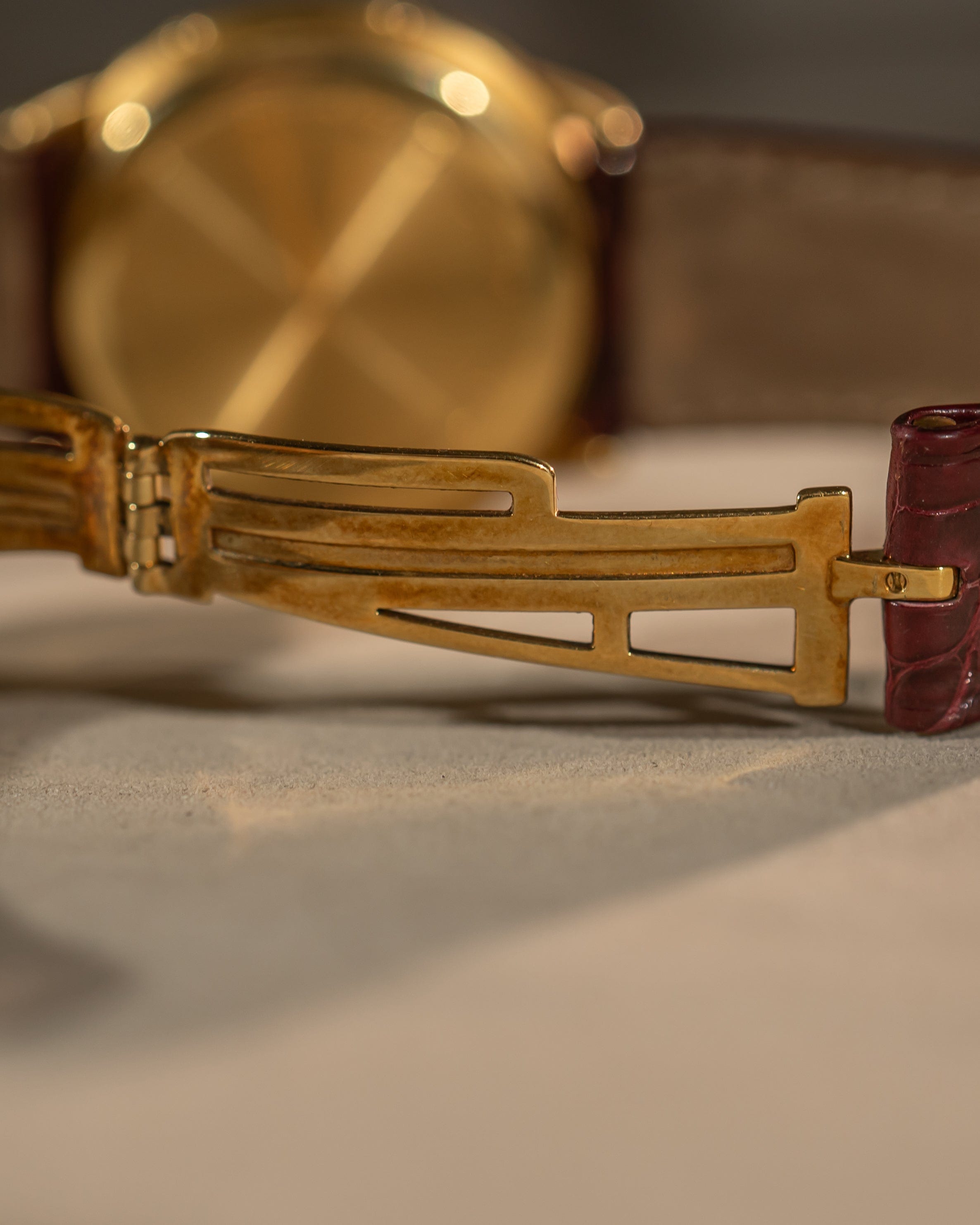 • Bracelet: Burgundy alligator strap with original 18k yellow gold AP deployant clasp
