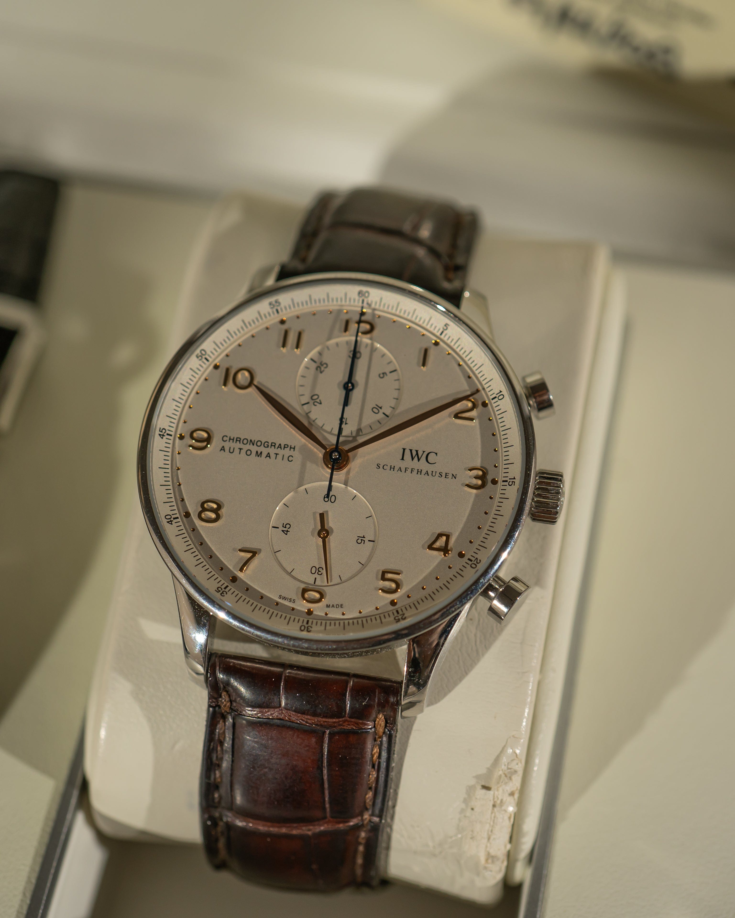 An elegant icon of the IWC lineup, the Portugieser IW371401 features a clean silver dial with applied Arabic numerals and classic chronograph symmetry—blending timeless design with mechanical precision.