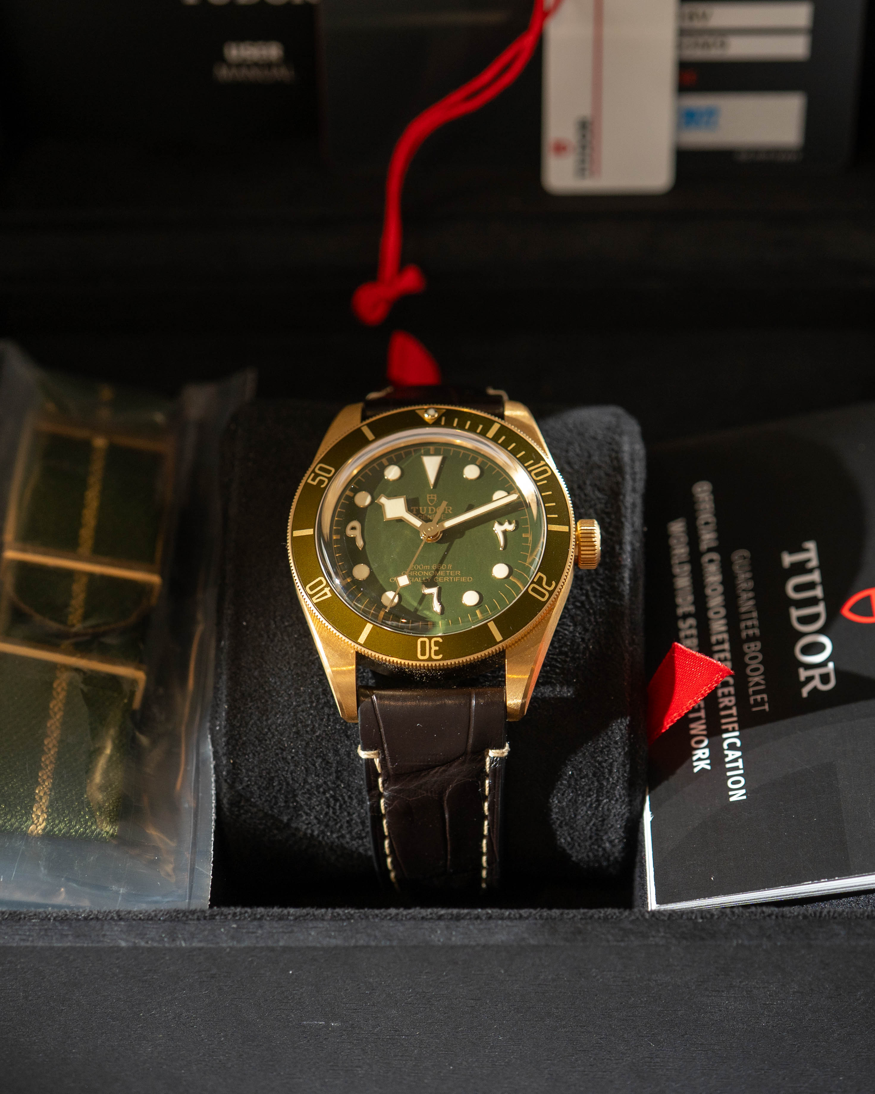 A highly exclusive and striking iteration of the Black Bay Fifty-Eight, the Abu Dhabi Edition stands out with its solid 18kt yellow gold case and rich green dial featuring Arabic numerals. Produced for a limited market, each piece is individually limited, combining Tudor’s vintage dive heritage with precious metal execution and modern performance.