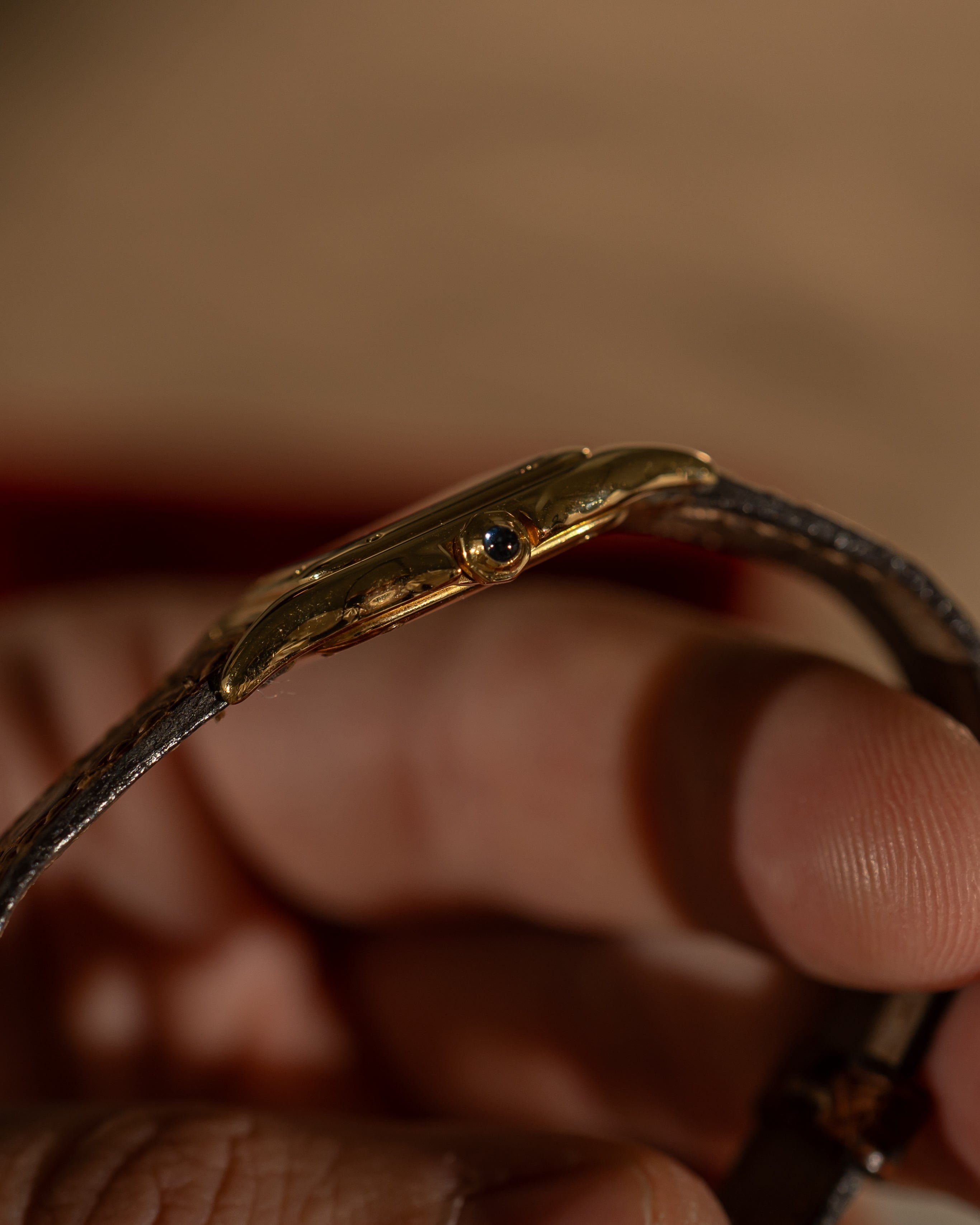 Renowned for its refined square case, Roman numeral dial, and blue cabochon crown, the Panthère is a quintessential ladies' dress watch with unmistakable Cartier flair.
