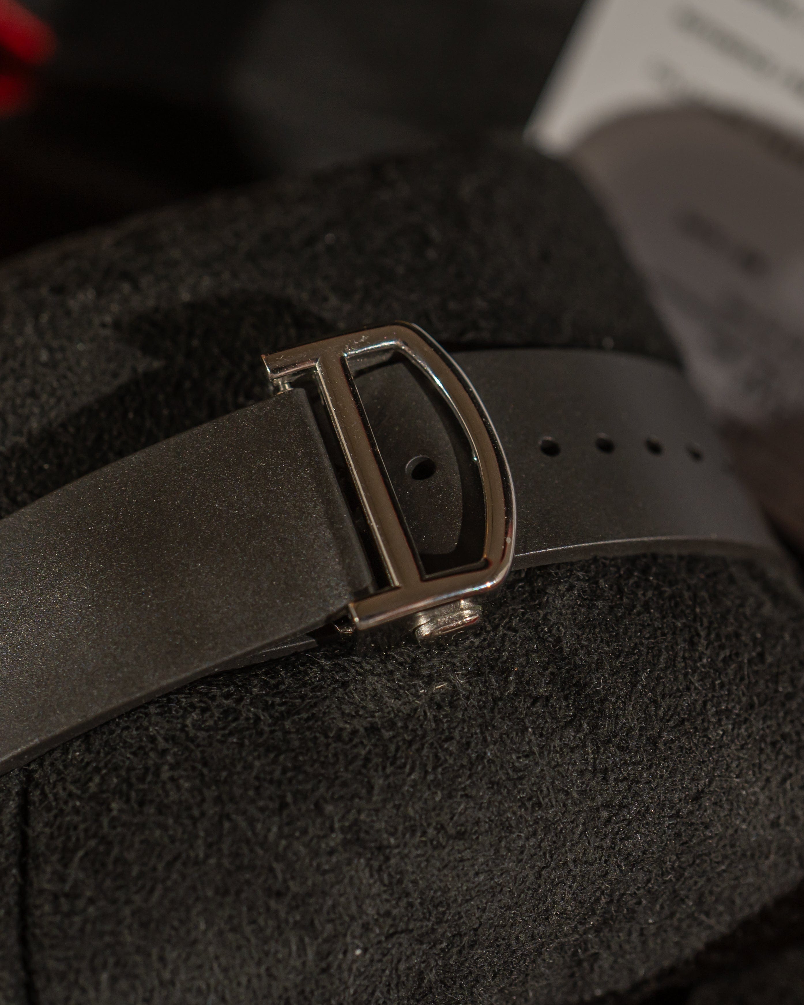 Strap: Black rubber strap with ADLC steel deployant buckle