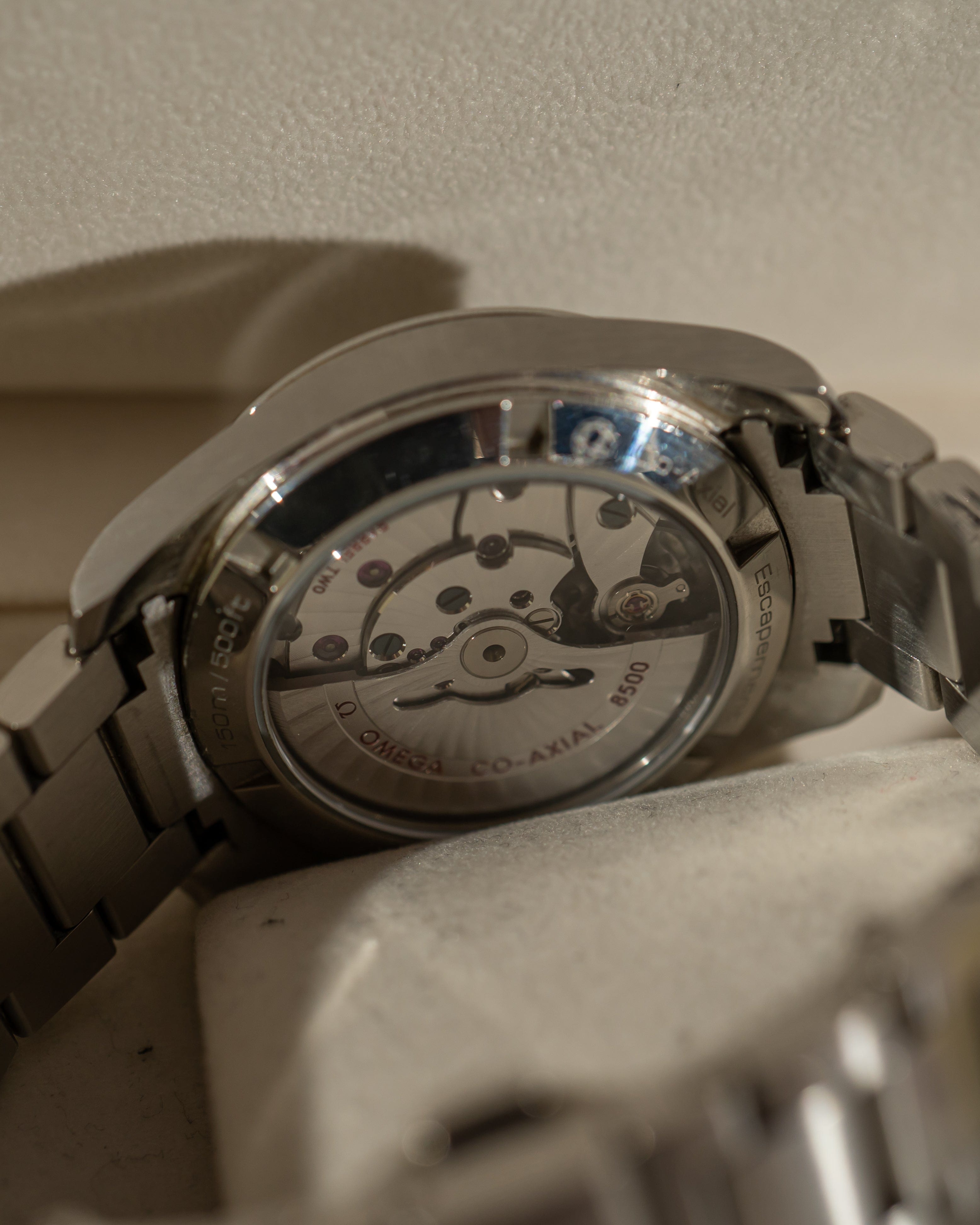 The Caliber 8500 movement with Co-Axial escapement delivers robust performance and impressive precision—an ideal blend of form and function in the Aqua Terra line.