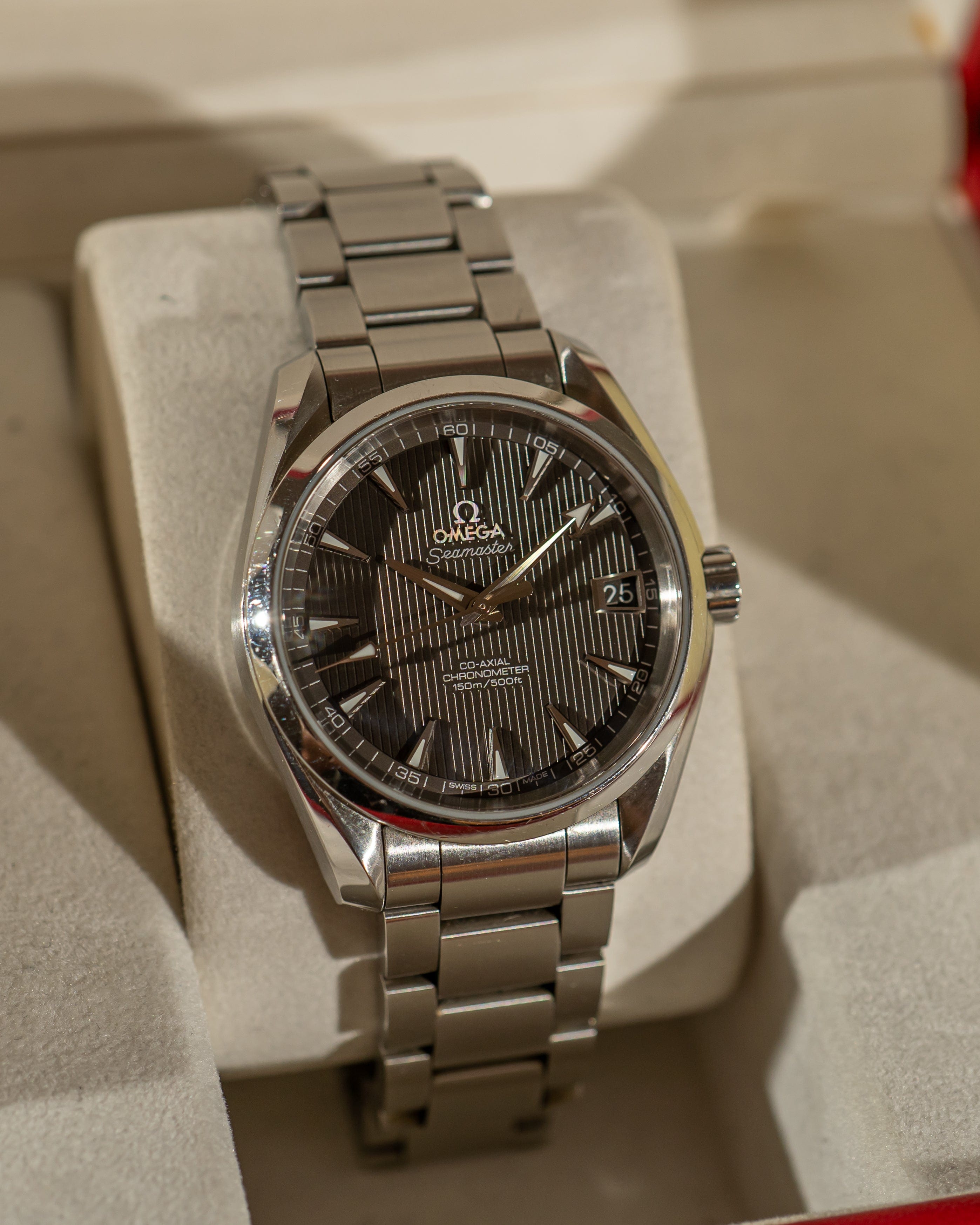 A versatile and refined Omega Seamaster Aqua Terra with teak-pattern dial, blending everyday elegance with rugged capability.