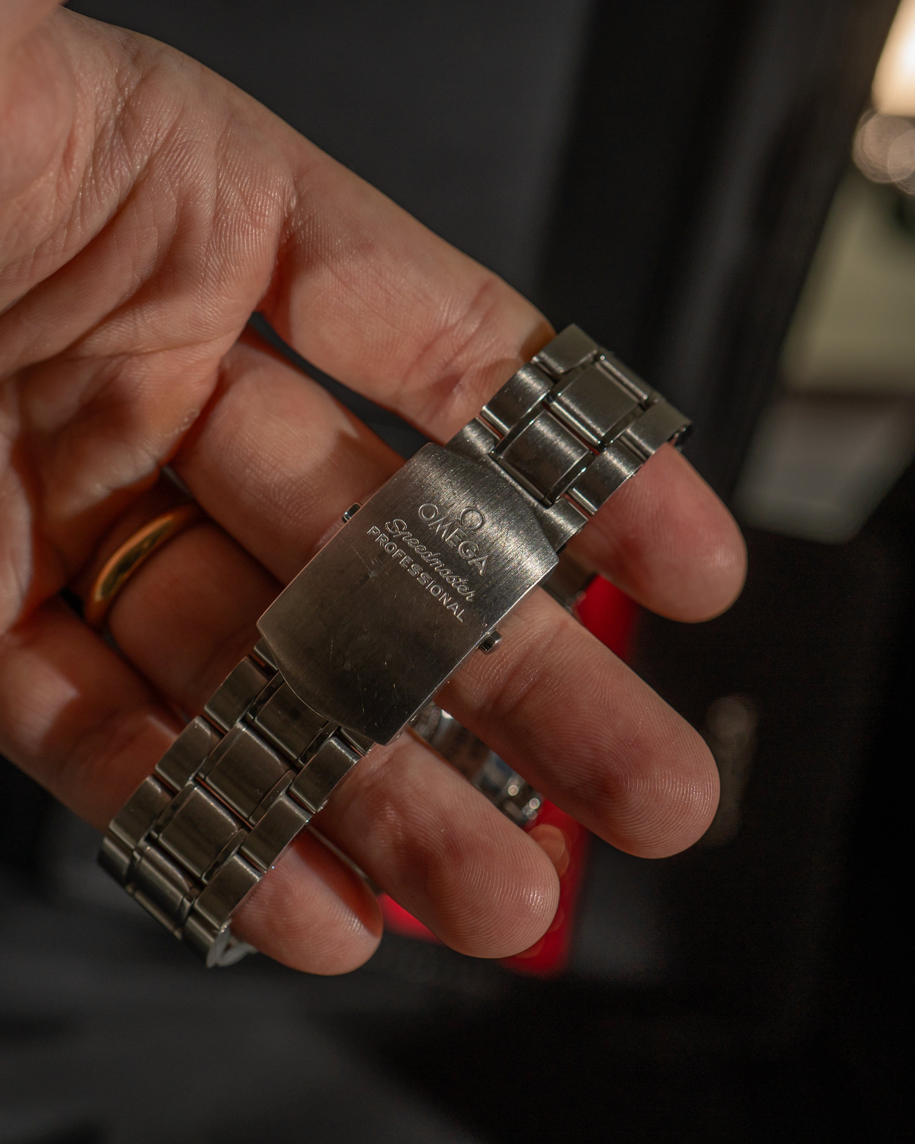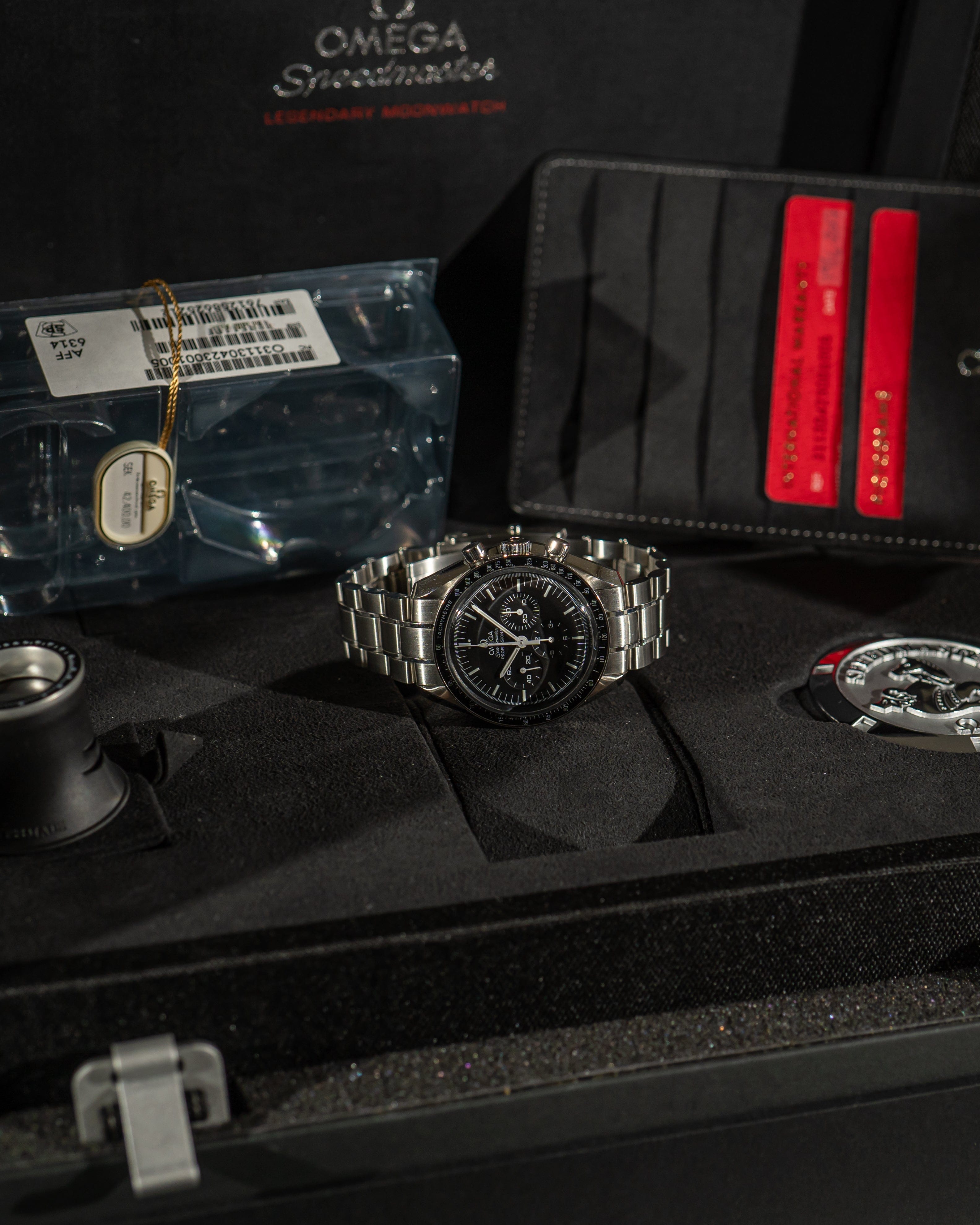 A classic Omega Speedmaster Professional “Moonwatch,” sold in Sweden in 2017 and presented as a complete full set. The watch is in very good condition with normal signs of wear, featuring the iconic black dial, Hesalite crystal, and hand-wound chronograph movement.