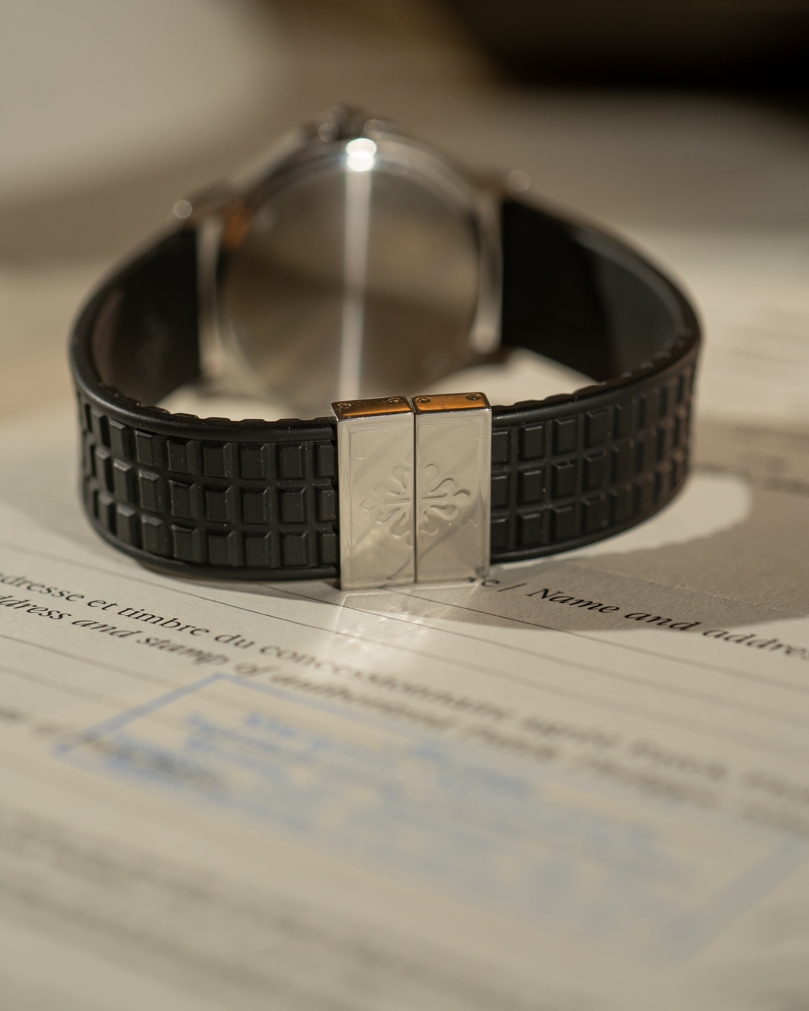 A sporty yet refined Patek Philippe, the Aquanaut 5064A offers a compact and wearable case paired with the unmistakable “tropical” rubber strap and embossed black dial—powered by a precise quartz movement and presented with original certificate.