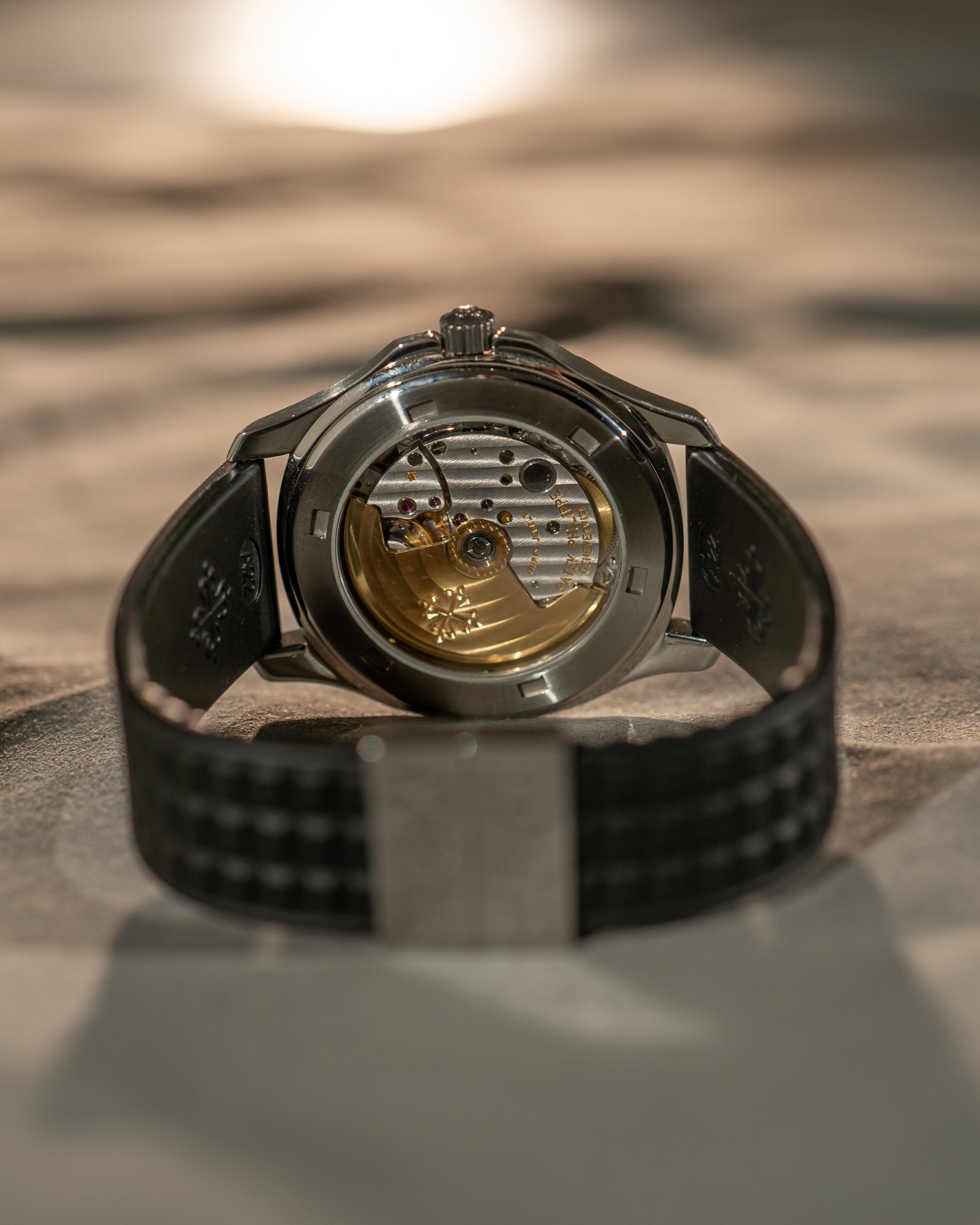 Strap: Black tropical rubber strap with Patek Philippe steel deployant clasp