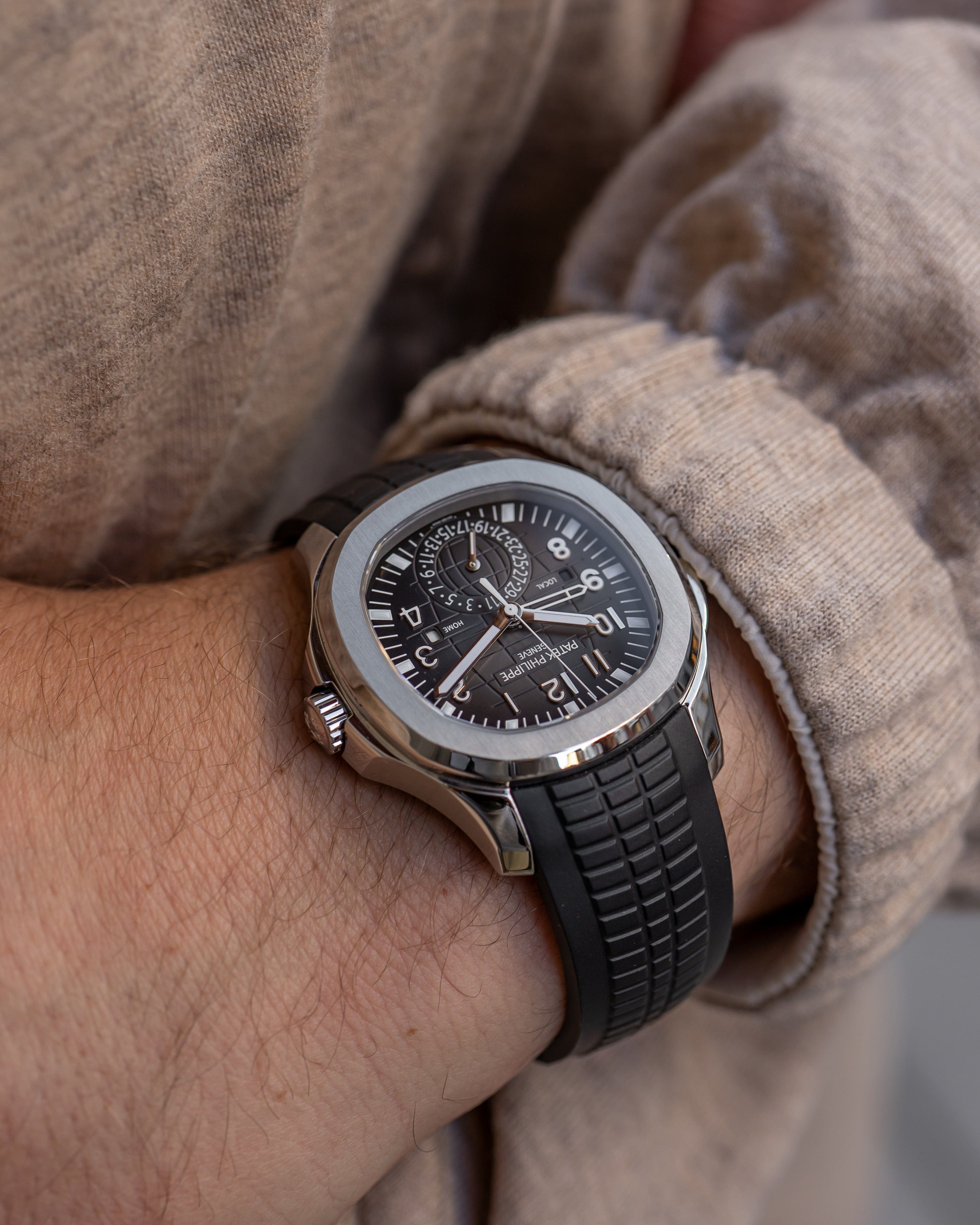A modern travel companion from Patek Philippe, the Aquanaut 5164A combines sporty sophistication with technical functionality—featuring dual time zones, a date subdial, and a tropical rubber strap in a highly wearable stainless steel case.