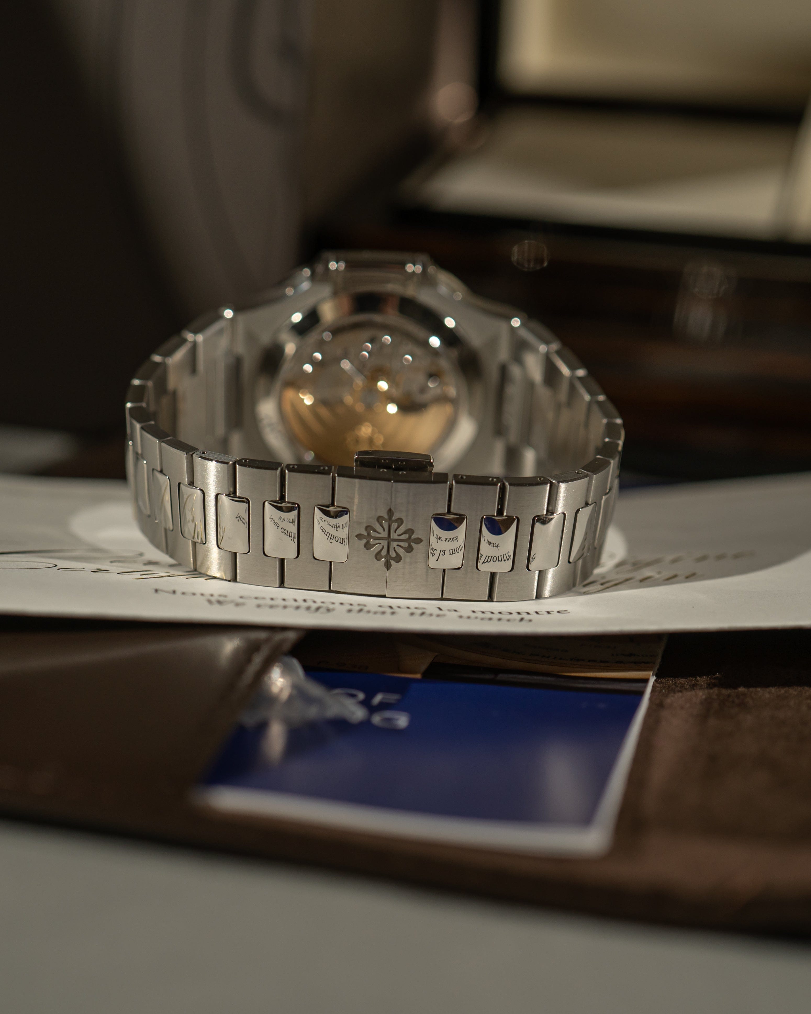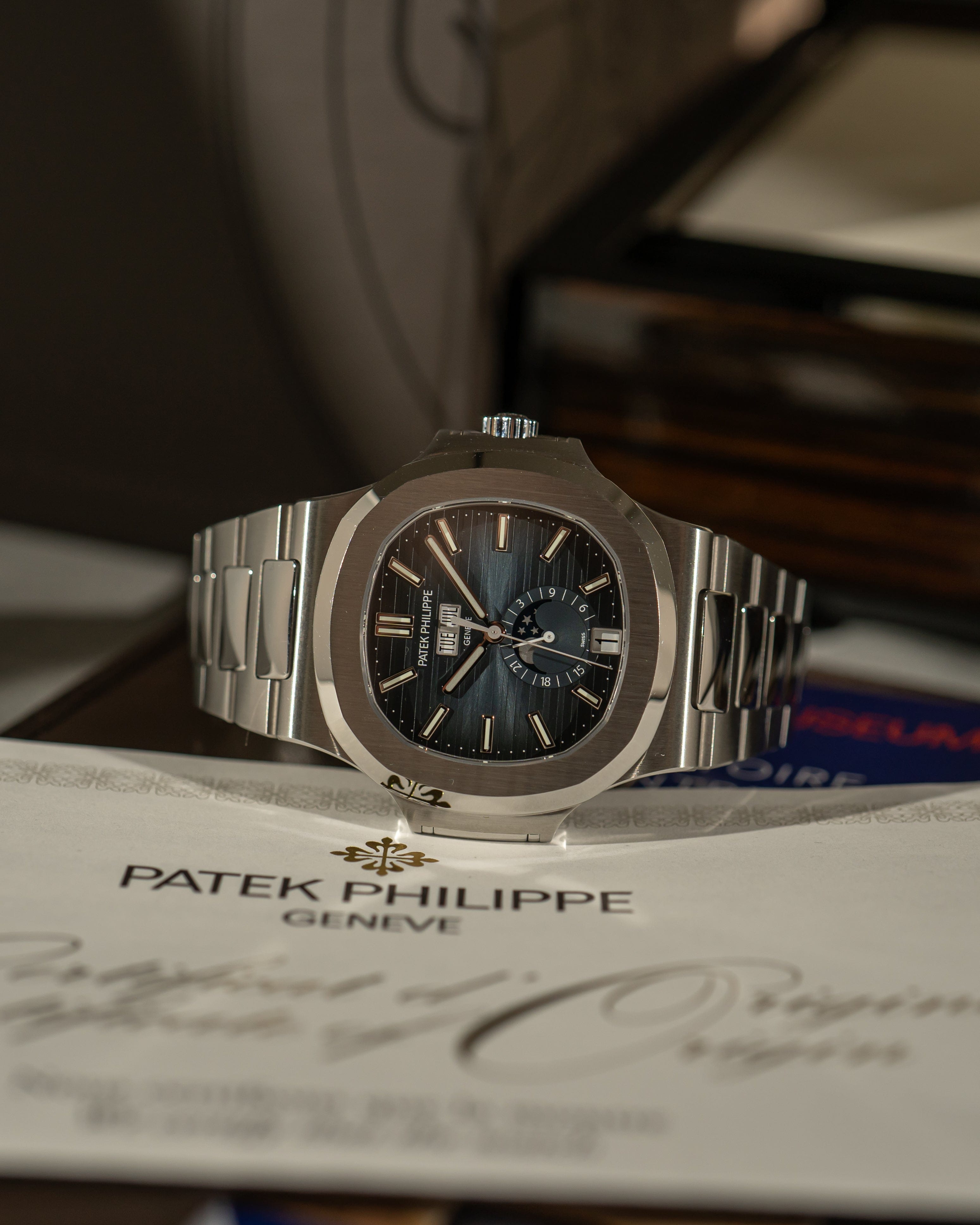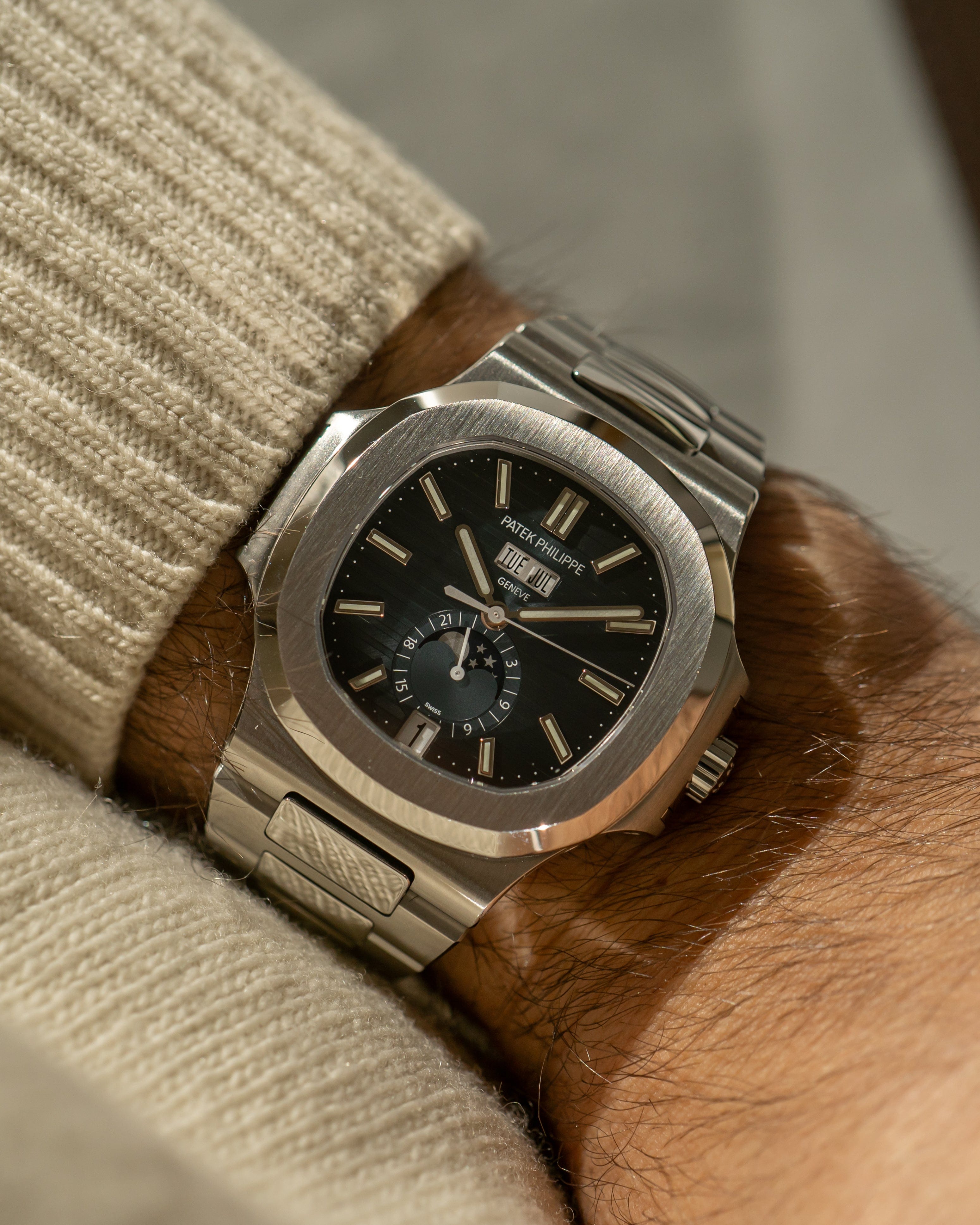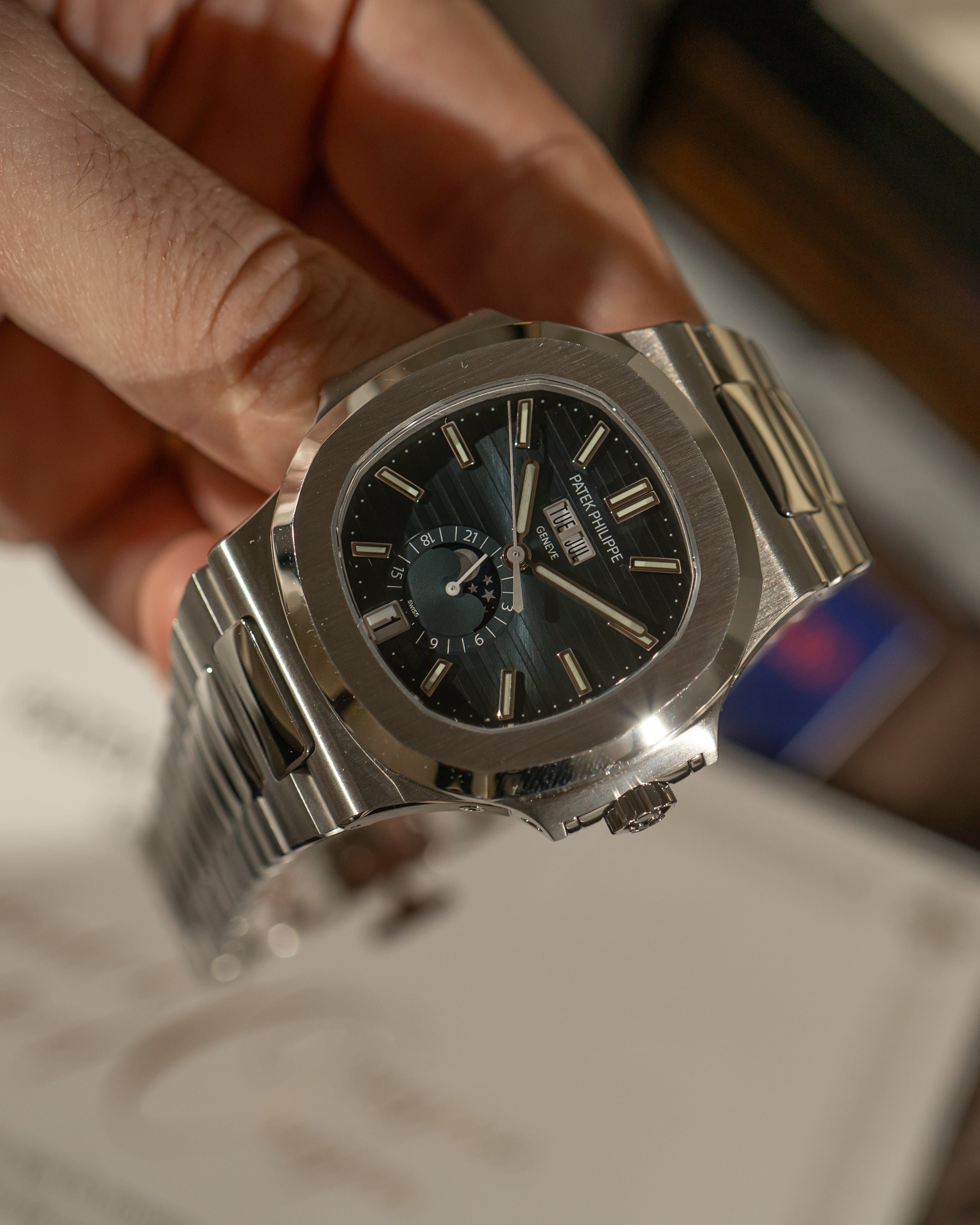 Stainless steel Nautilus Annual Calendar with moonphase. Iconic design paired with Patek Philippe’s 324 S QA LU 24H/303 movement.
