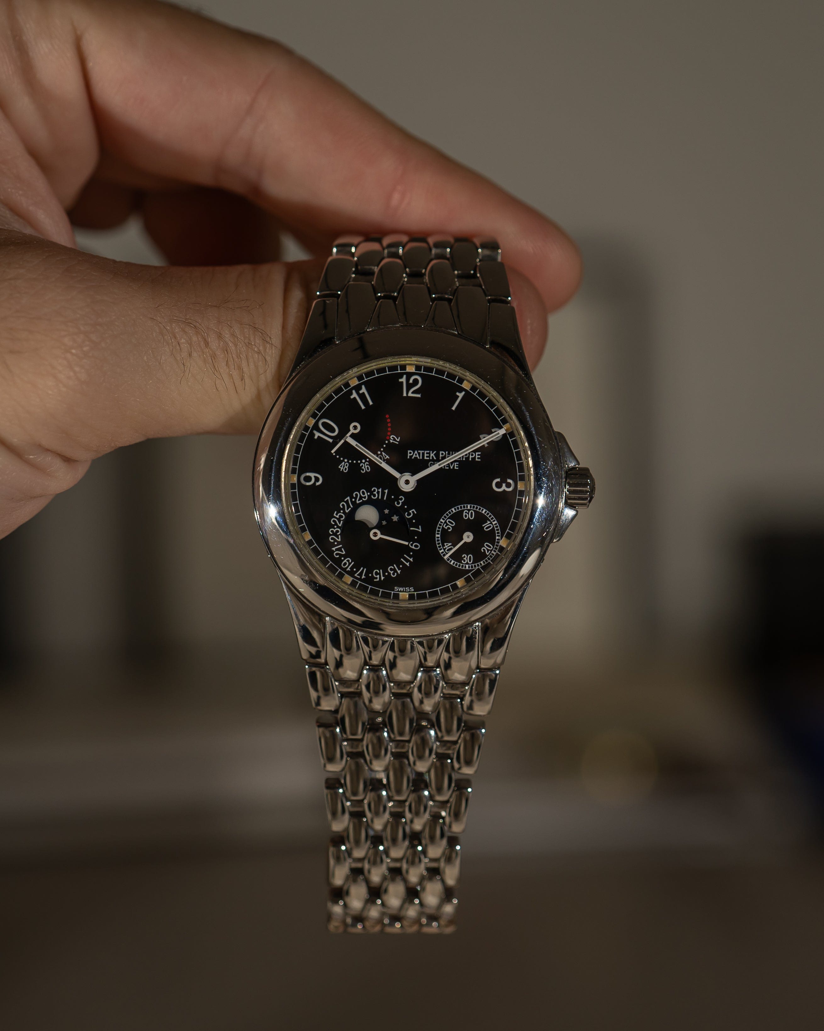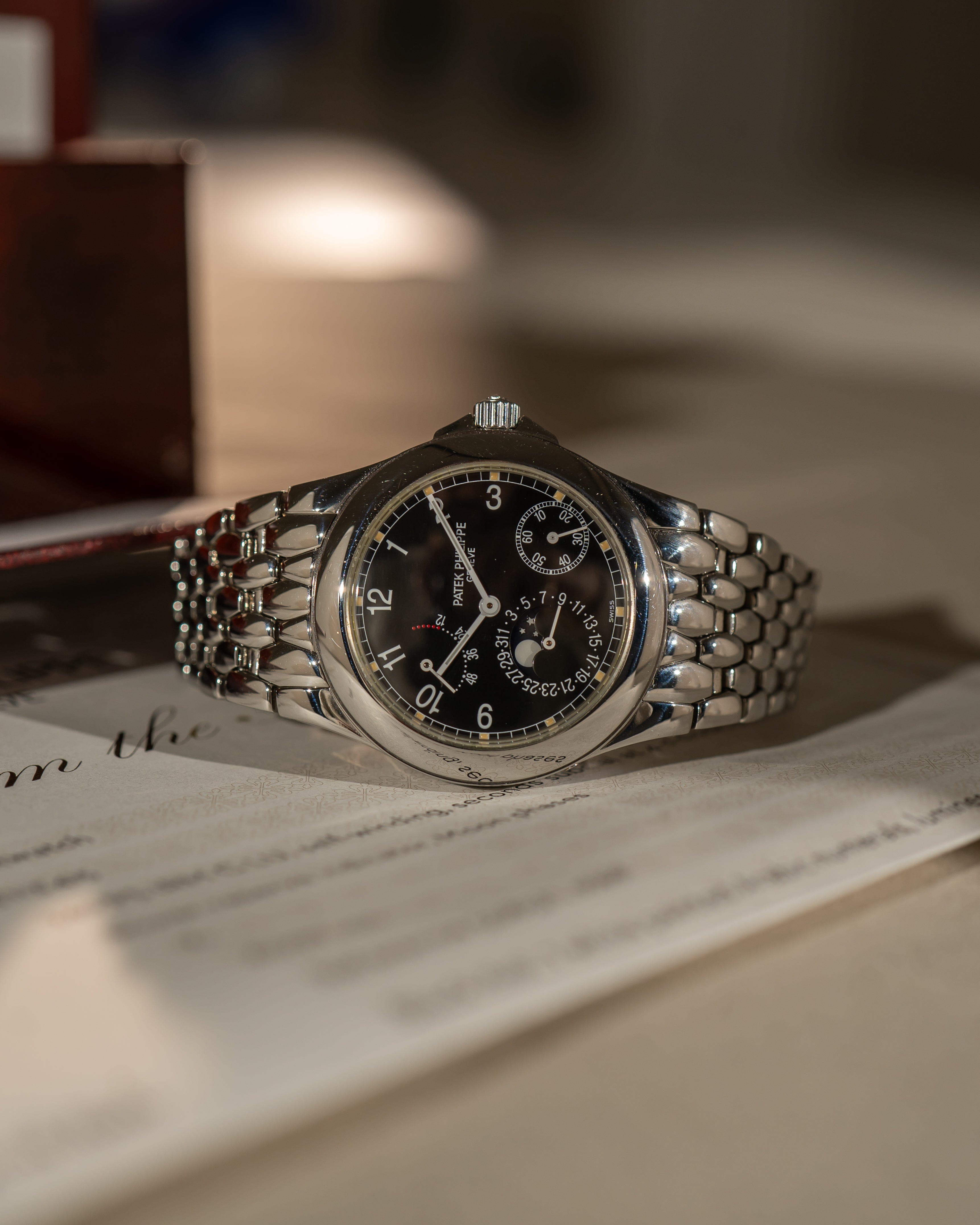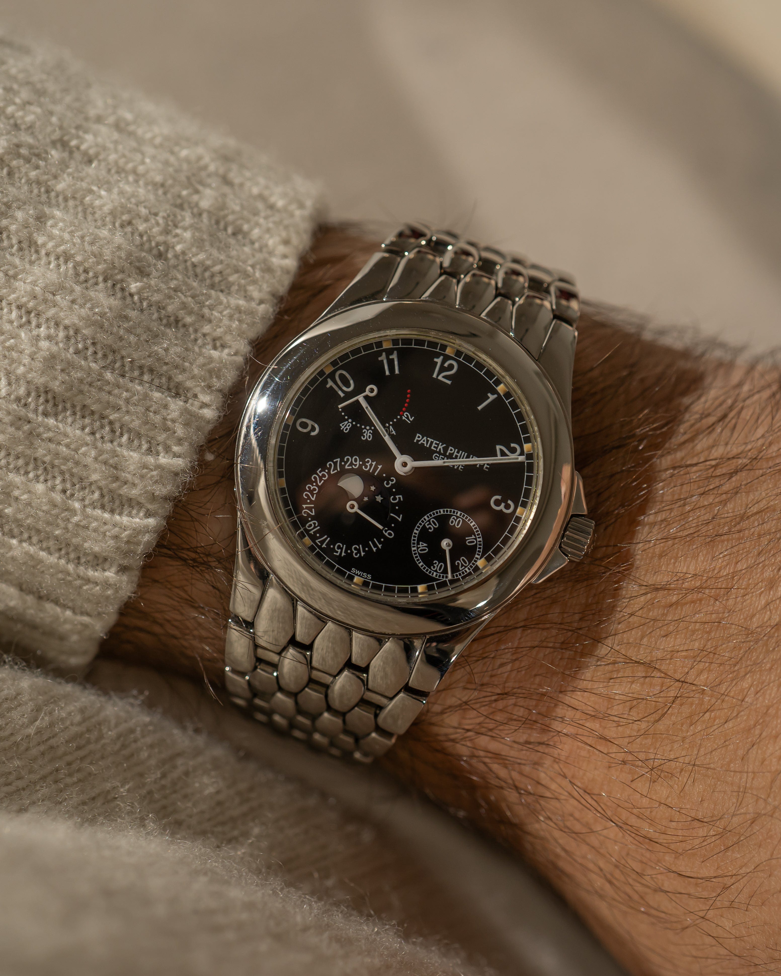 The Patek Philippe Neptune 5085 is one of the maison’s most distinctive designs, blending elegant complications with a bold, sport-luxury aesthetic. With its striking black dial, asymmetrical sub-dials, and unique “fish scale” steel bracelet, it stands as a rare and collectible model from the late 1990s–early 2000s.