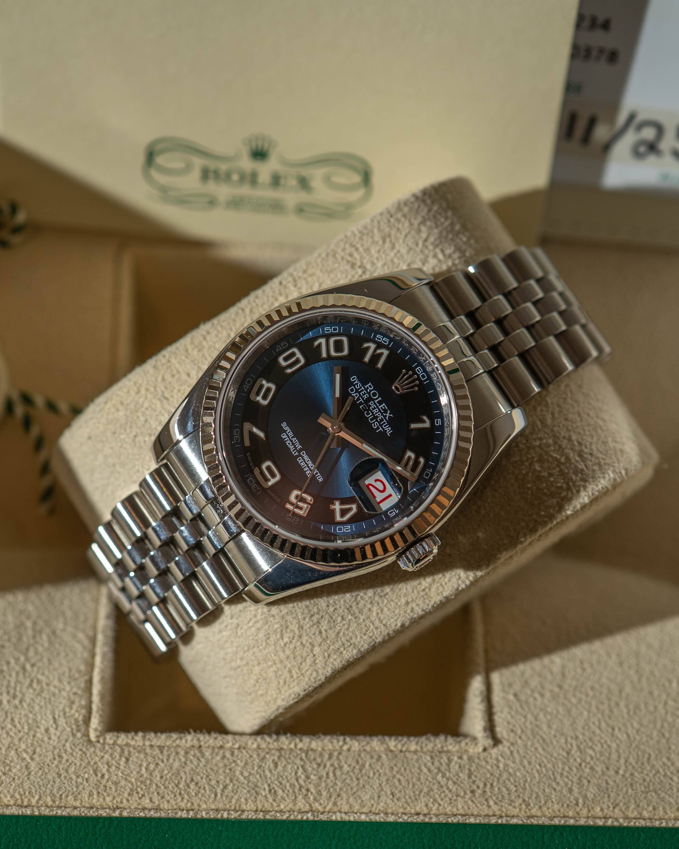 A distinctive and elegant take on the classic Datejust, this ref. 116234 features the sought-after blue concentric dial with applied Arabic numerals, paired with a white gold fluted bezel, Jubilee bracelet, and the desirable roulette date display. A refined yet characterful configuration that stands out within the Datejust lineup. Each piece is produced in limited quantities, adding to its long-term appeal.
