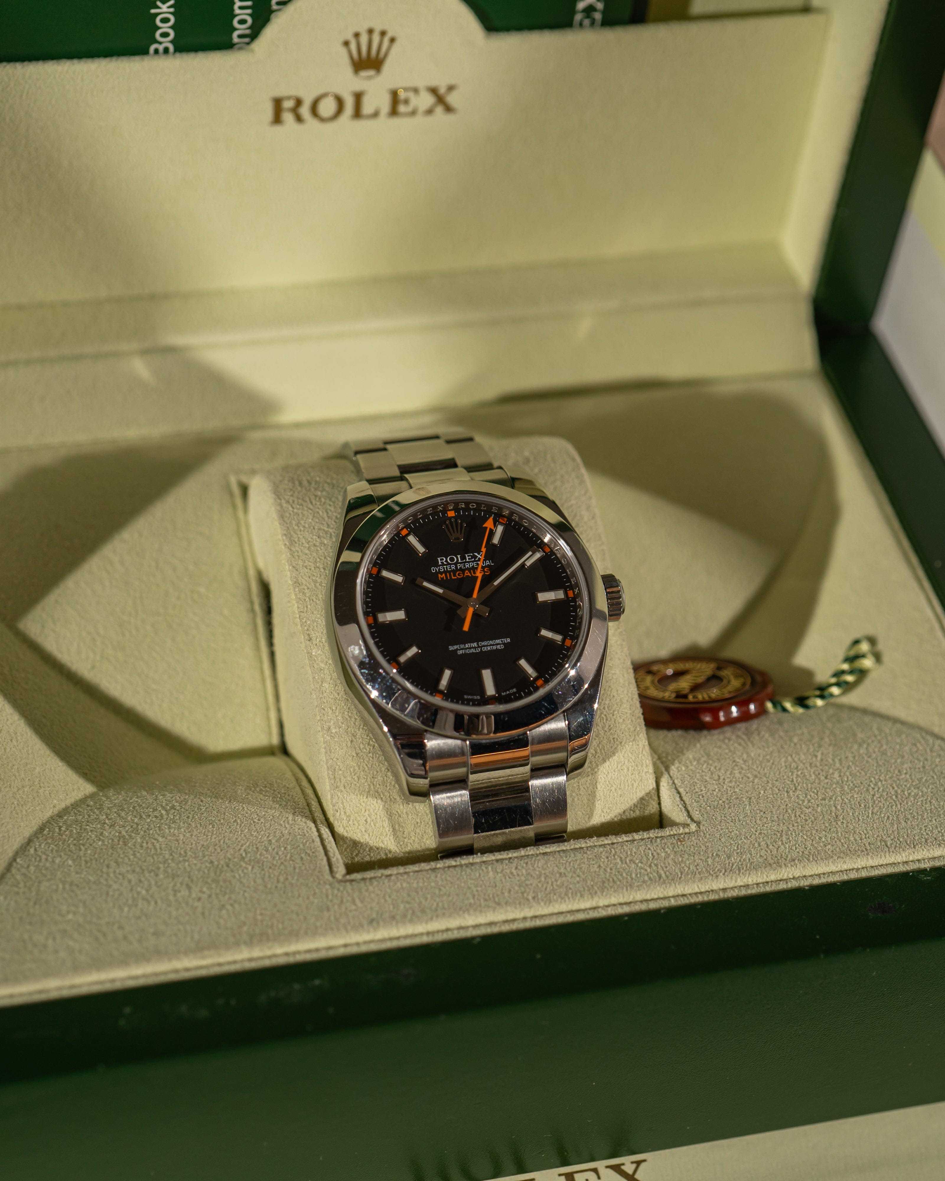Engineered for magnetic resistance and defined by its signature lightning bolt seconds hand, the Rolex Milgauss 116400 is a modern icon with scientific roots and clean, contemporary aesthetics.
