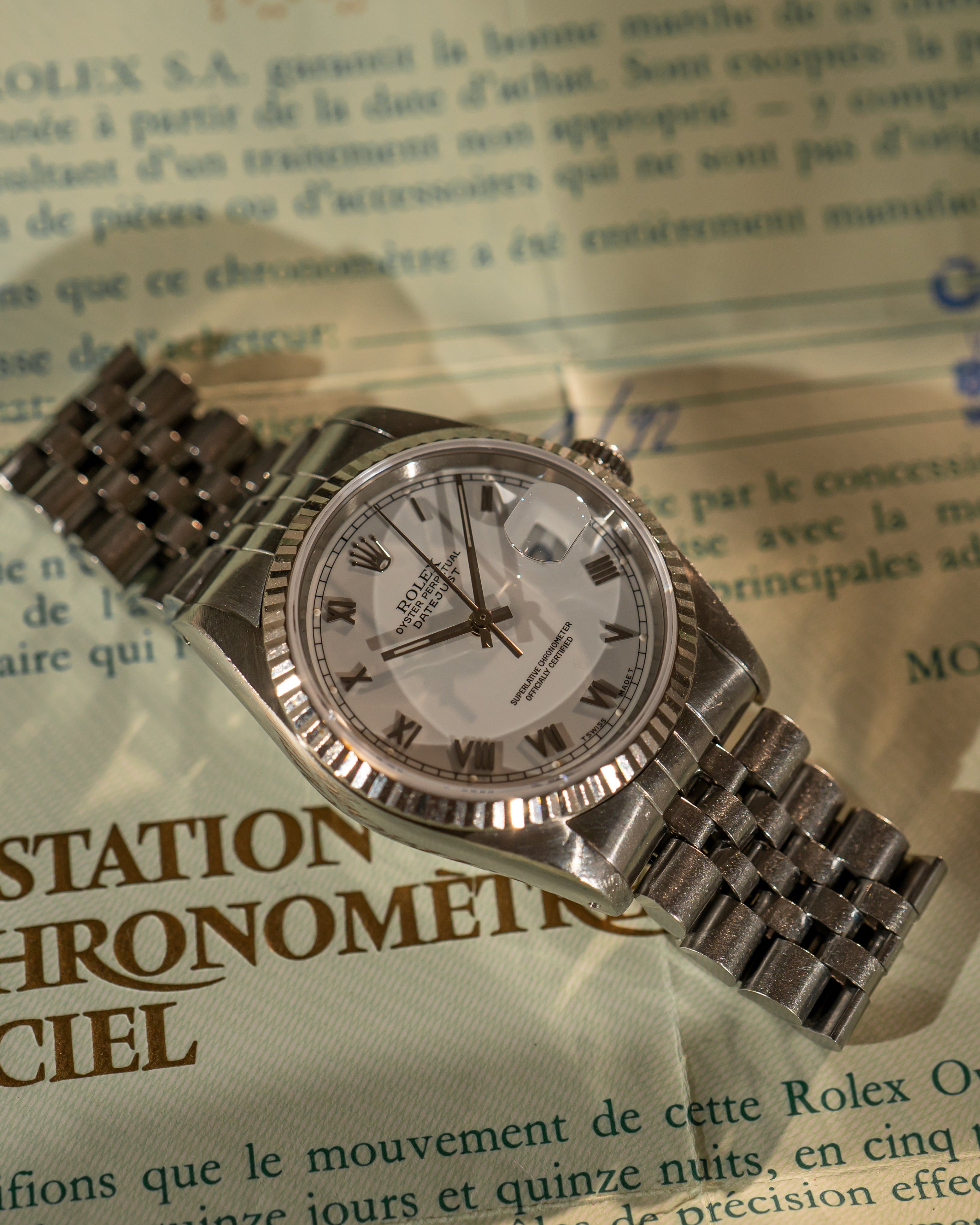 A classic execution of the Rolex Datejust, this ref. 16234 pairs the elegance of a fluted white gold bezel with a clean white Roman numeral dial—timeless and versatile in every way.