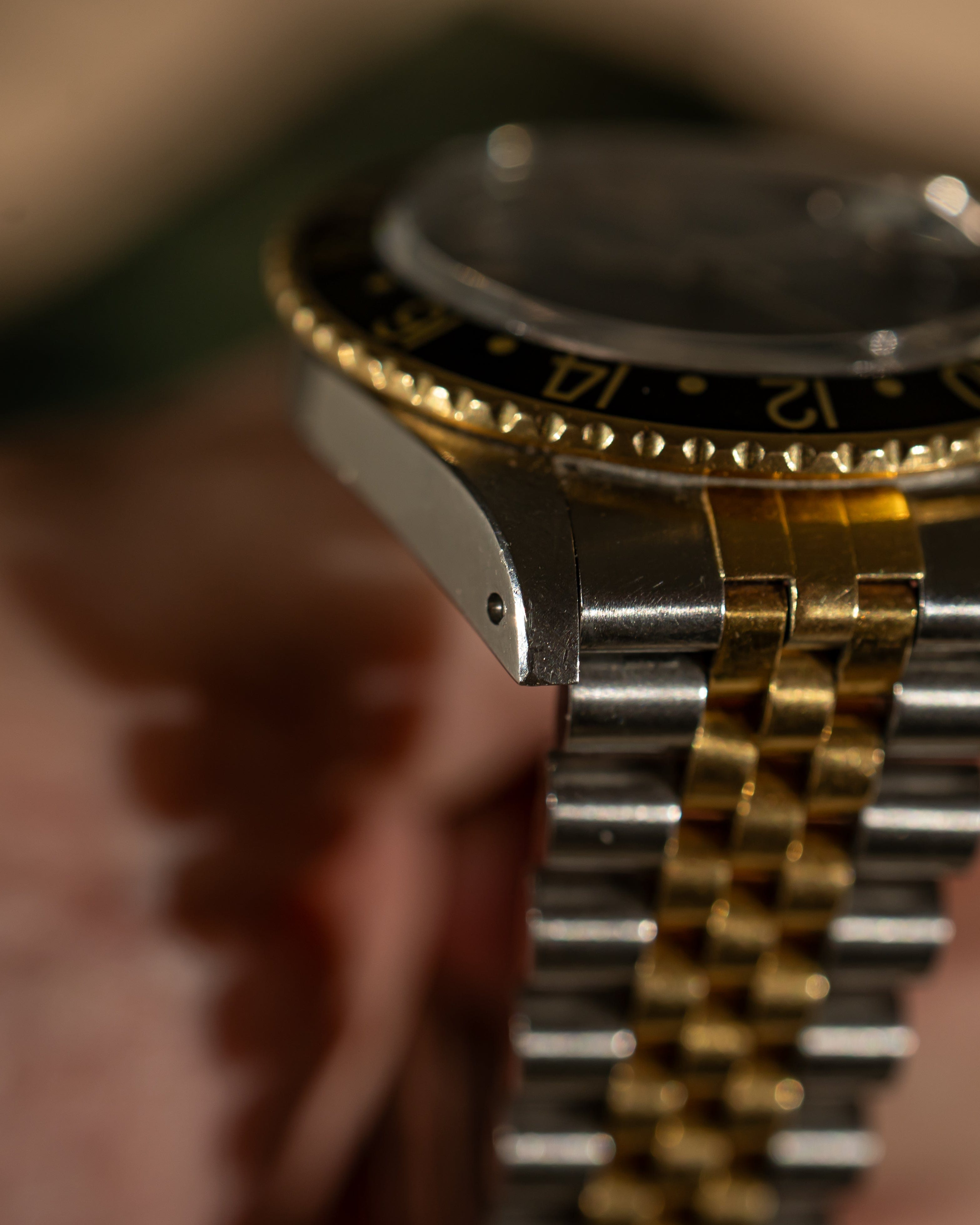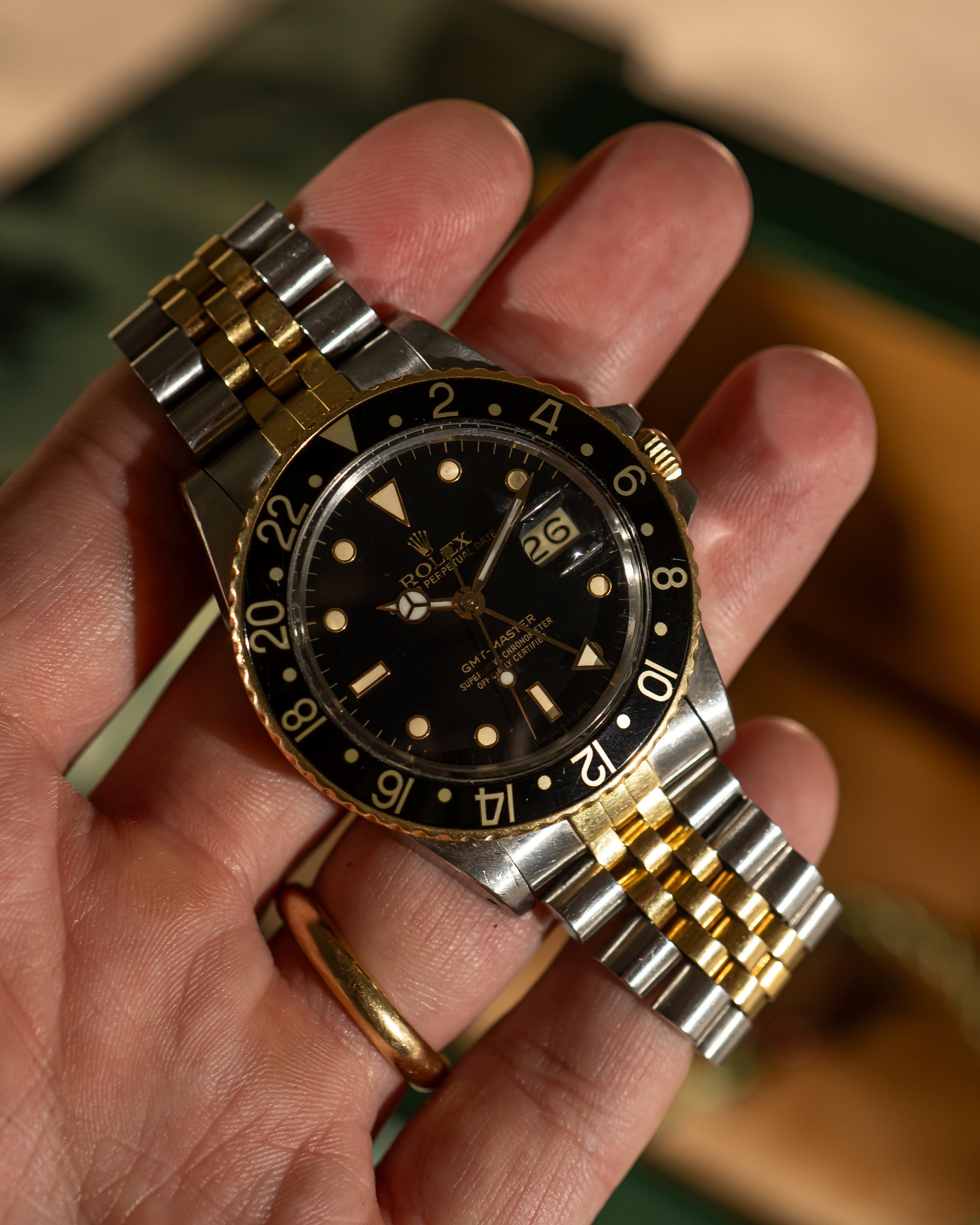 This 16753 GMT-Master captures the charm of late-80s Rolex design with its black and gold aesthetic, now enhanced by a full set and documented Rolex service history.