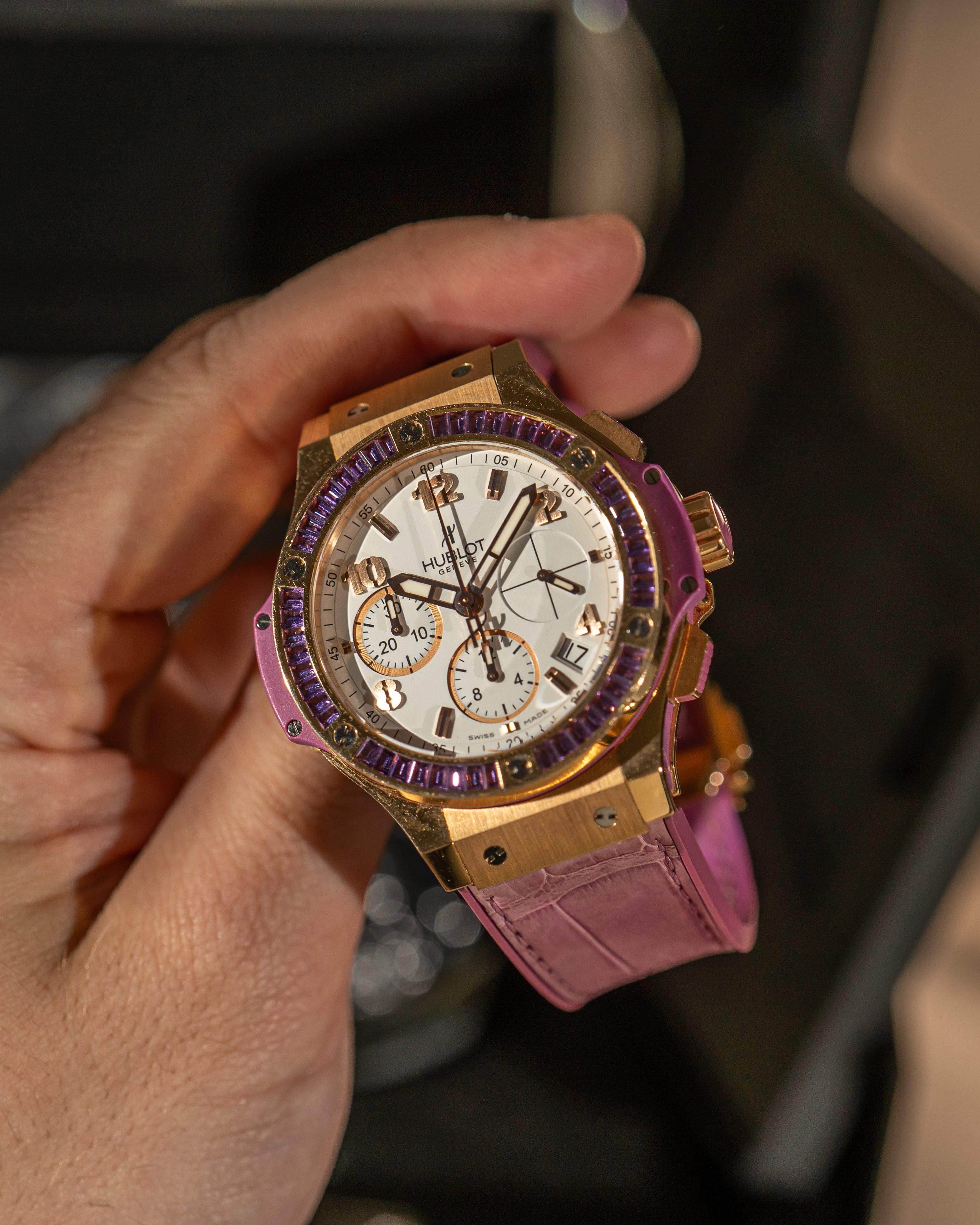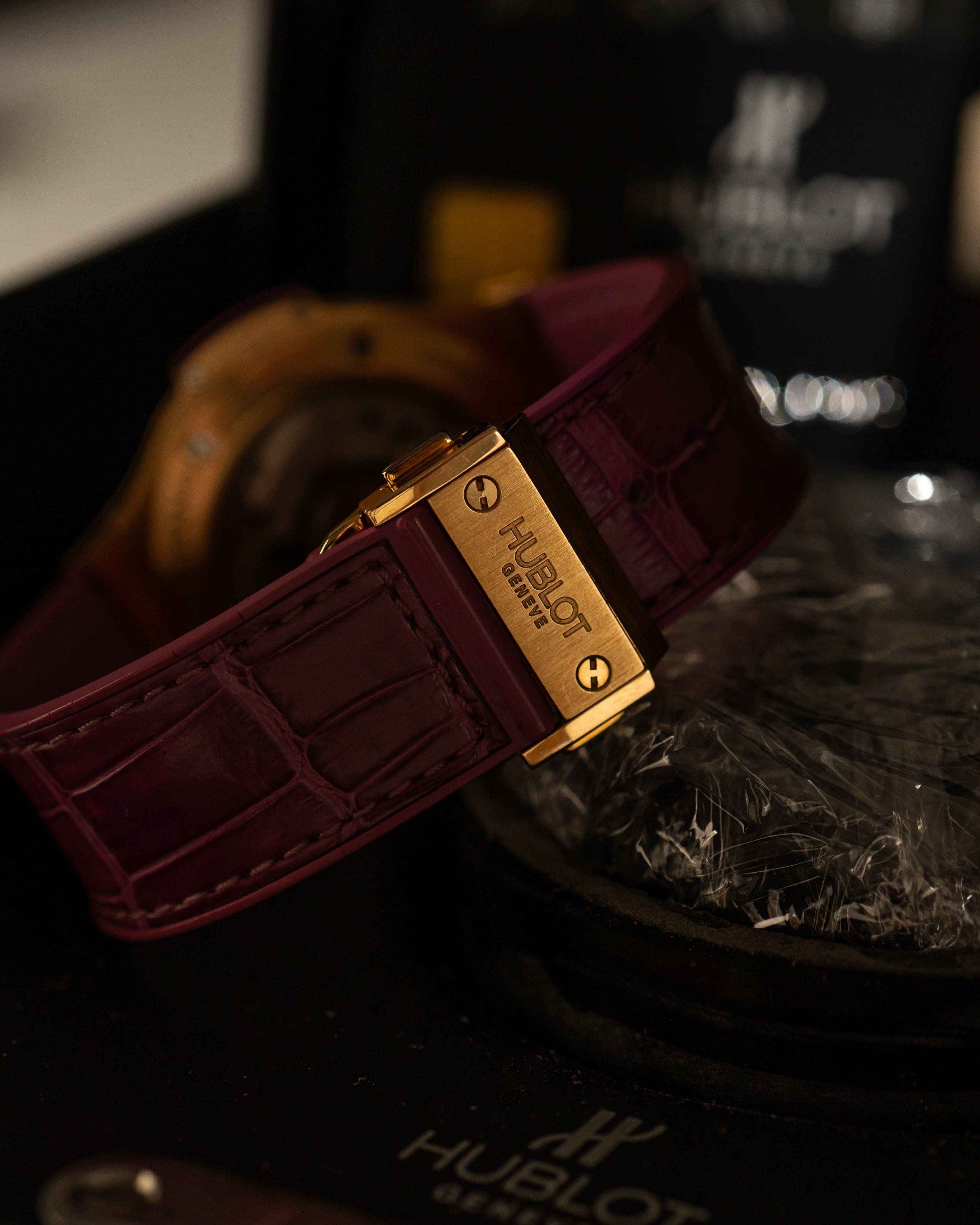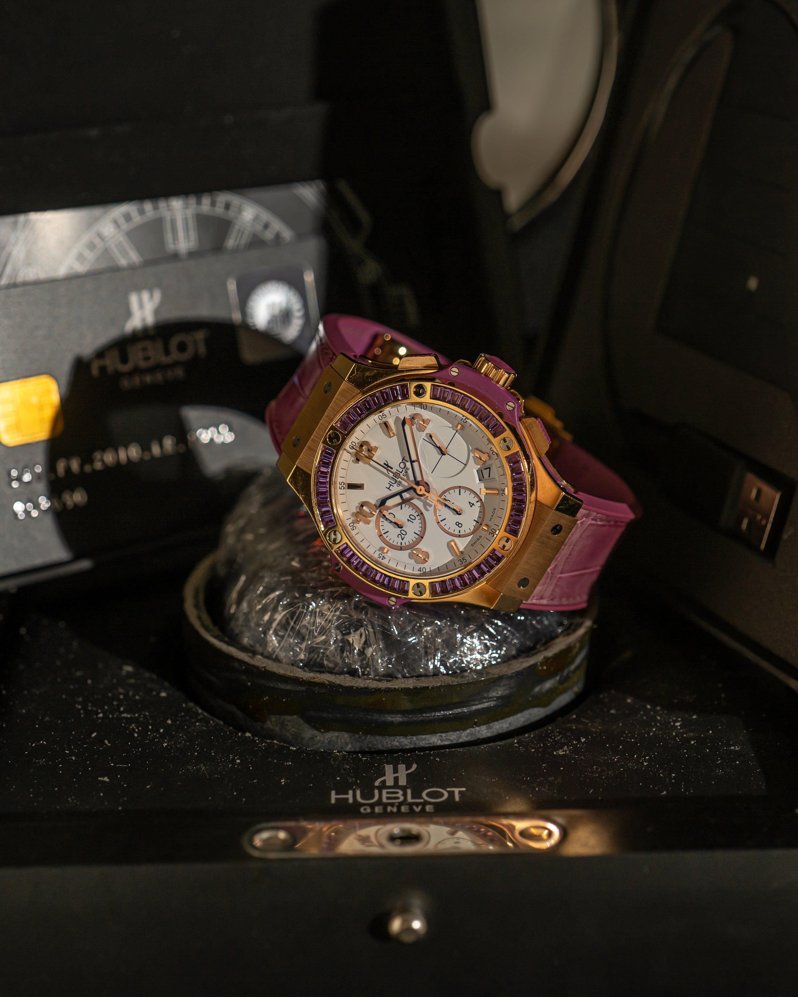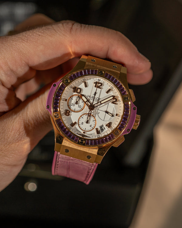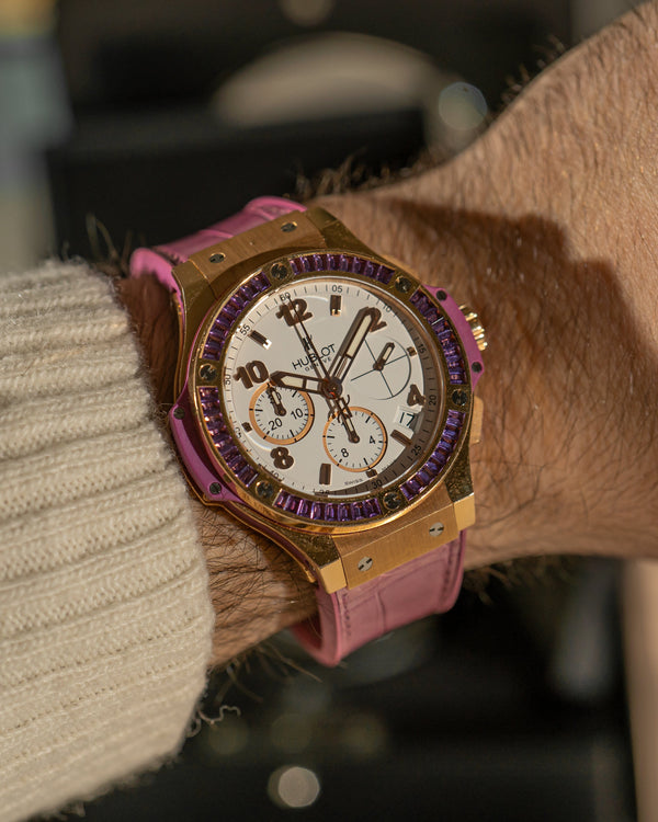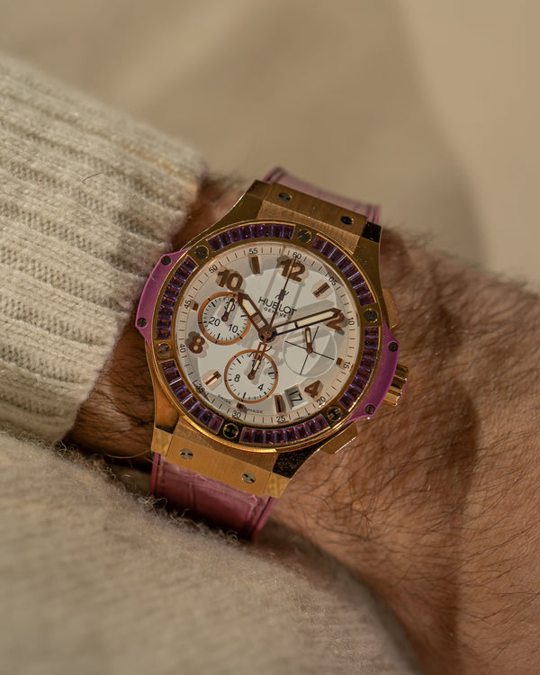 A vibrant and luxurious take on the Big Bang silhouette, the Tutti Frutti 341.PV.2010.LR.1905 combines polished rose gold with a striking amethyst-set bezel and pink alligator strap, making a bold statement with unmistakable Hublot flair.