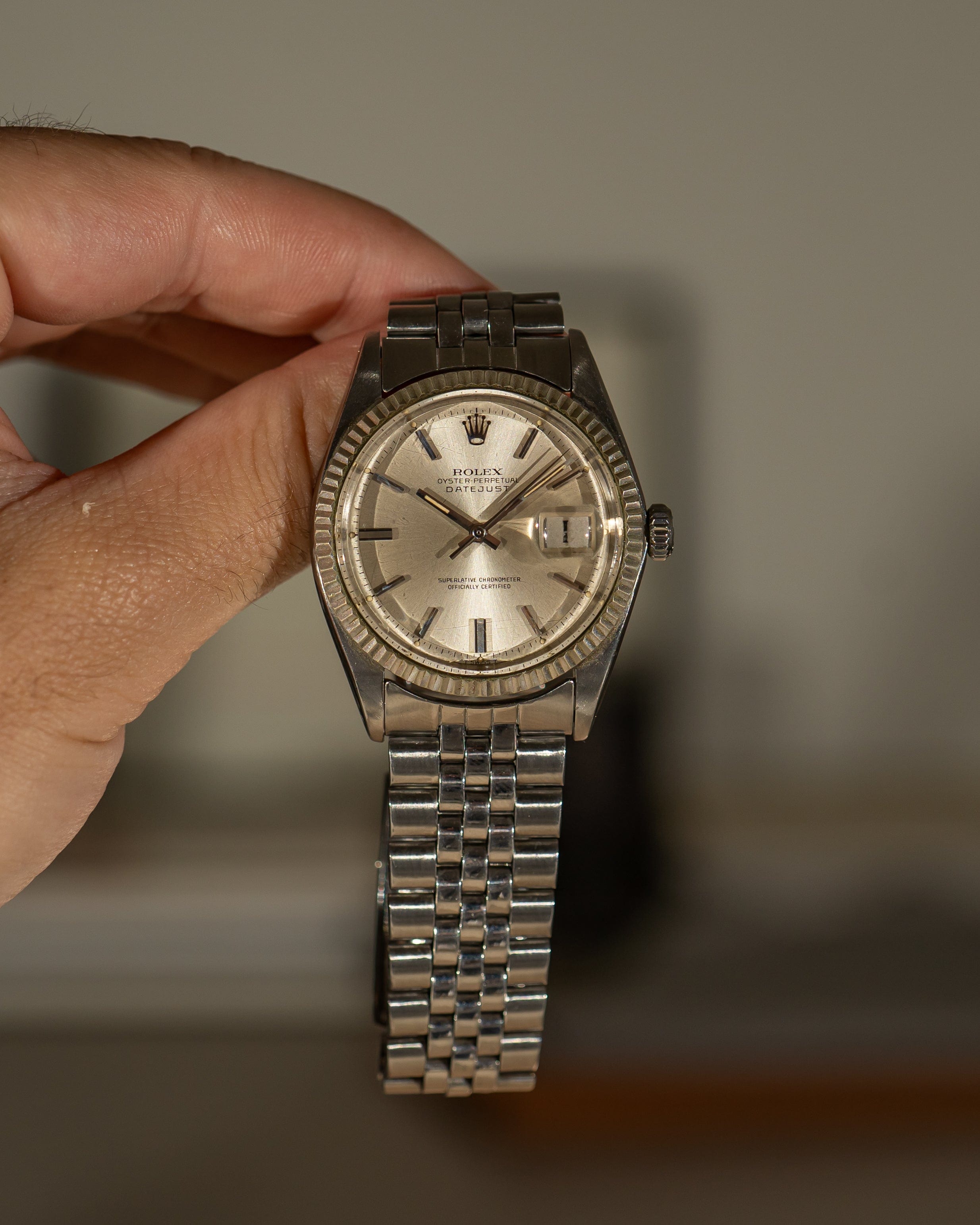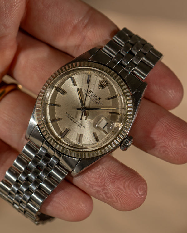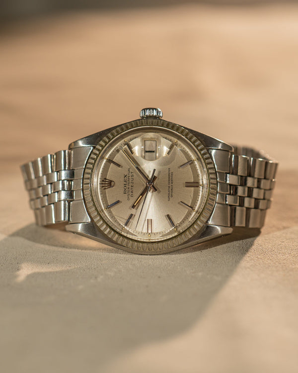 A charming vintage Datejust with character, this 1603 features an upgraded 18k white gold fluted bezel from a ref. 1601, blending the classic stainless steel case with a touch of precious metal refinement.