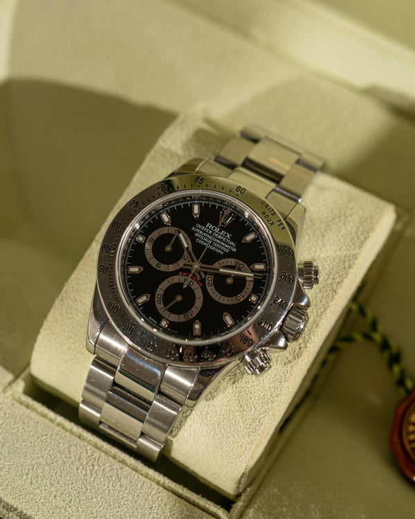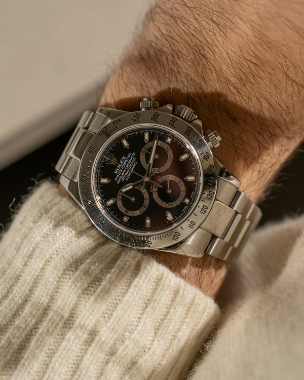 An iconic steel chronograph, the Rolex Daytona 116520 with black dial is renowned for its clean aesthetics and in-house Caliber 4130. This Z-series example represents one of the final years before the switch to the engraved rehaut.