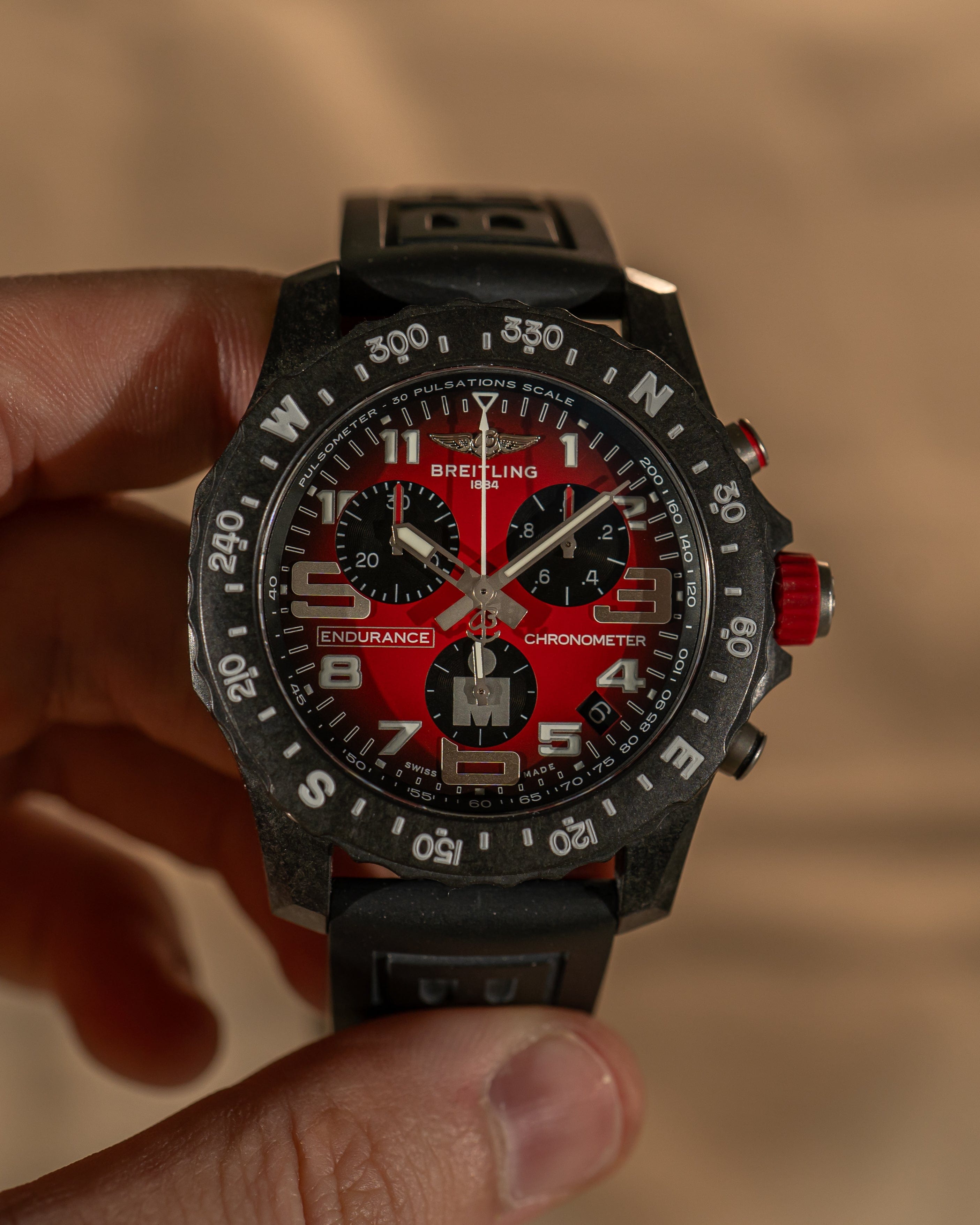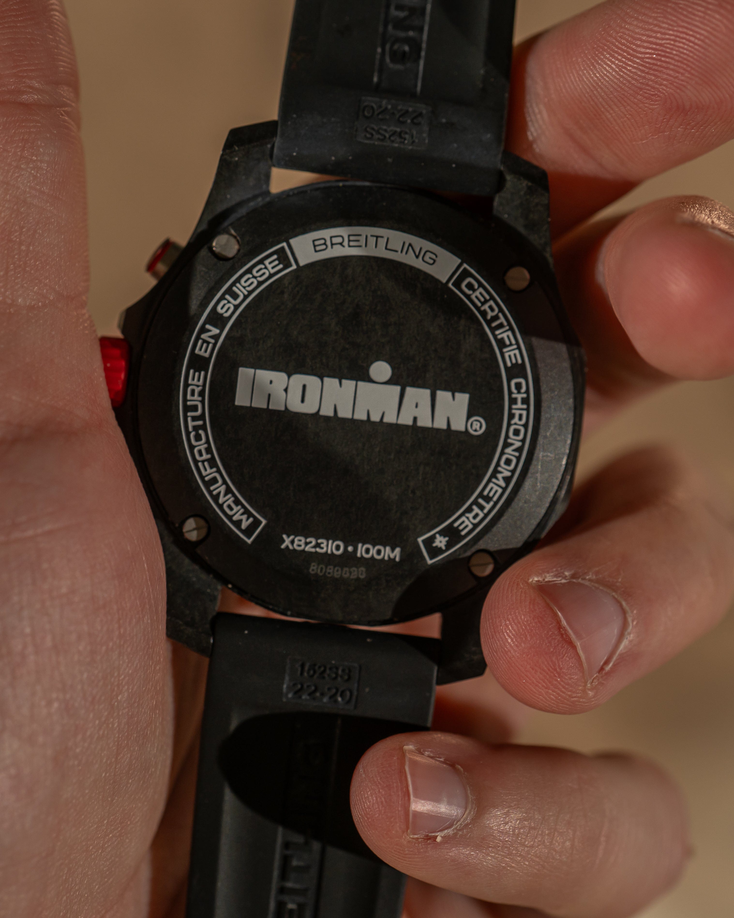 Dial: Red dial with black subdials, “IRONMAN” logo at 6 o’clock