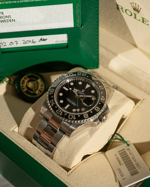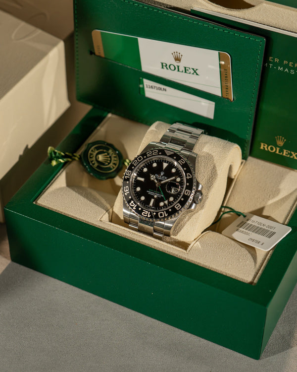 The 116710LN represents the end of an era as the last GMT-Master II with a monochrome bezel—blending Rolex's modern ceramic technology with the classic utility of the travel-time complication.