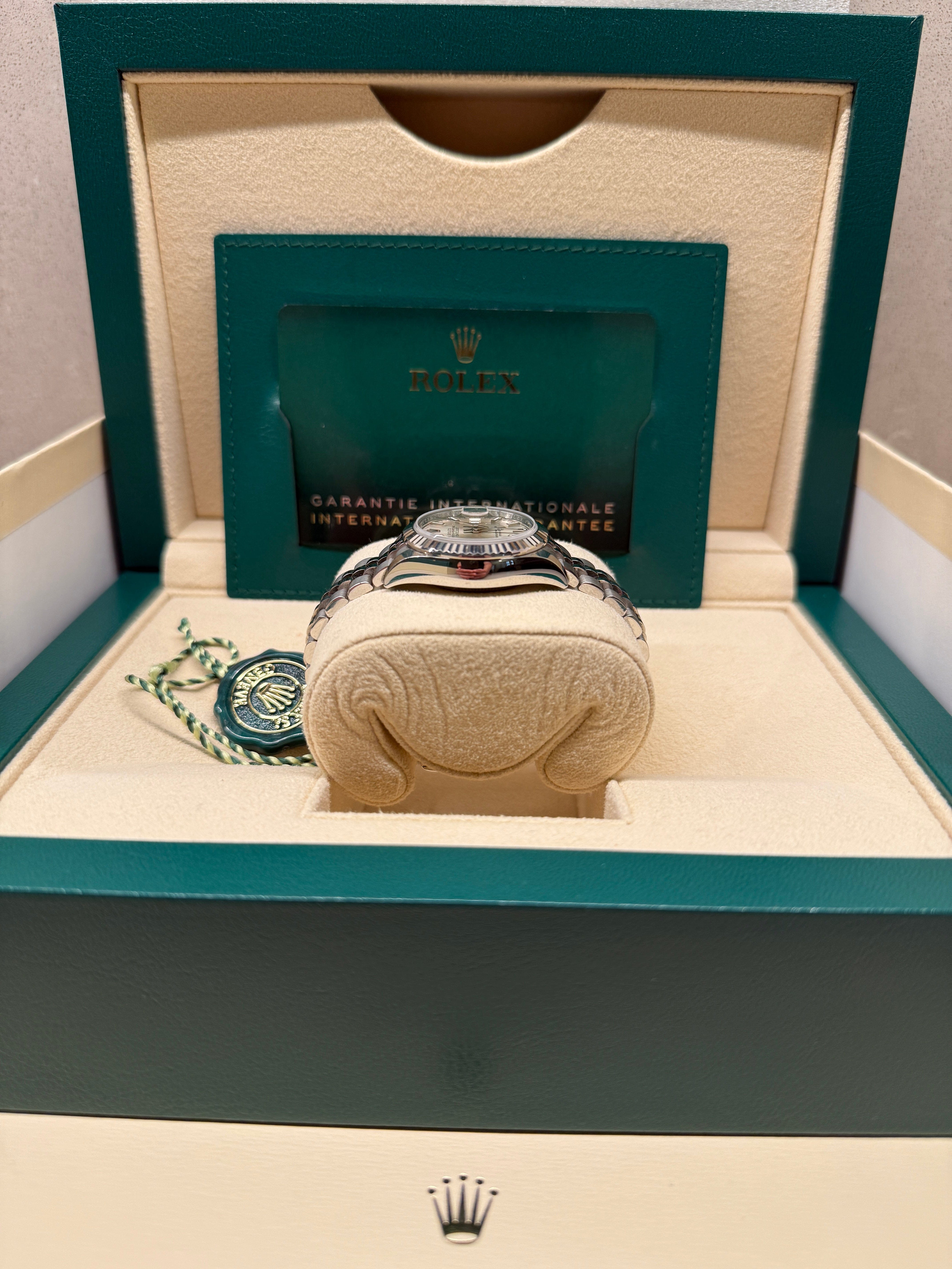 A sleek new addition to the GMT-Master II lineup, the ref. 126710GRNR—nicknamed the “Bruce Wayne”—features a stealthy black and grey Cerachrom bezel paired with a Jubilee bracelet. This 2024 example comes as a complete collector’s set and remains in mint condition.