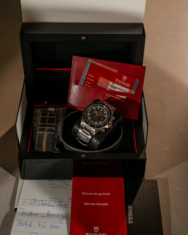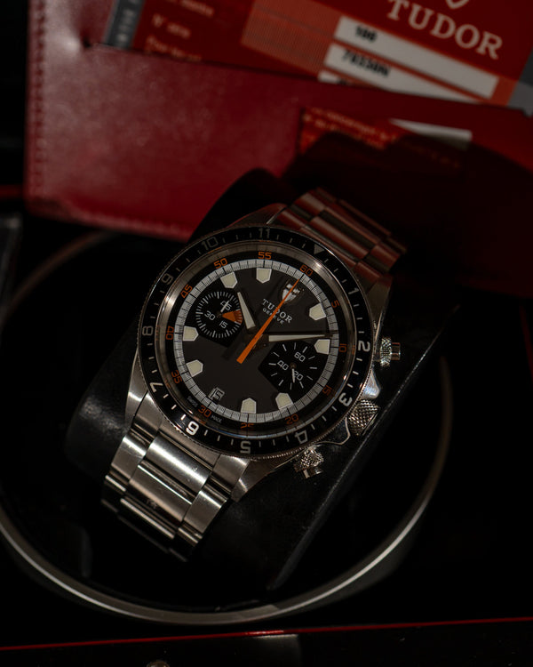A striking Tudor Heritage Chrono 70330N, inspired by the classic 1970s Monte Carlo chronographs. This model features a bold black and grey dial with orange accents, embodying the perfect blend of vintage aesthetics and modern craftsmanship.