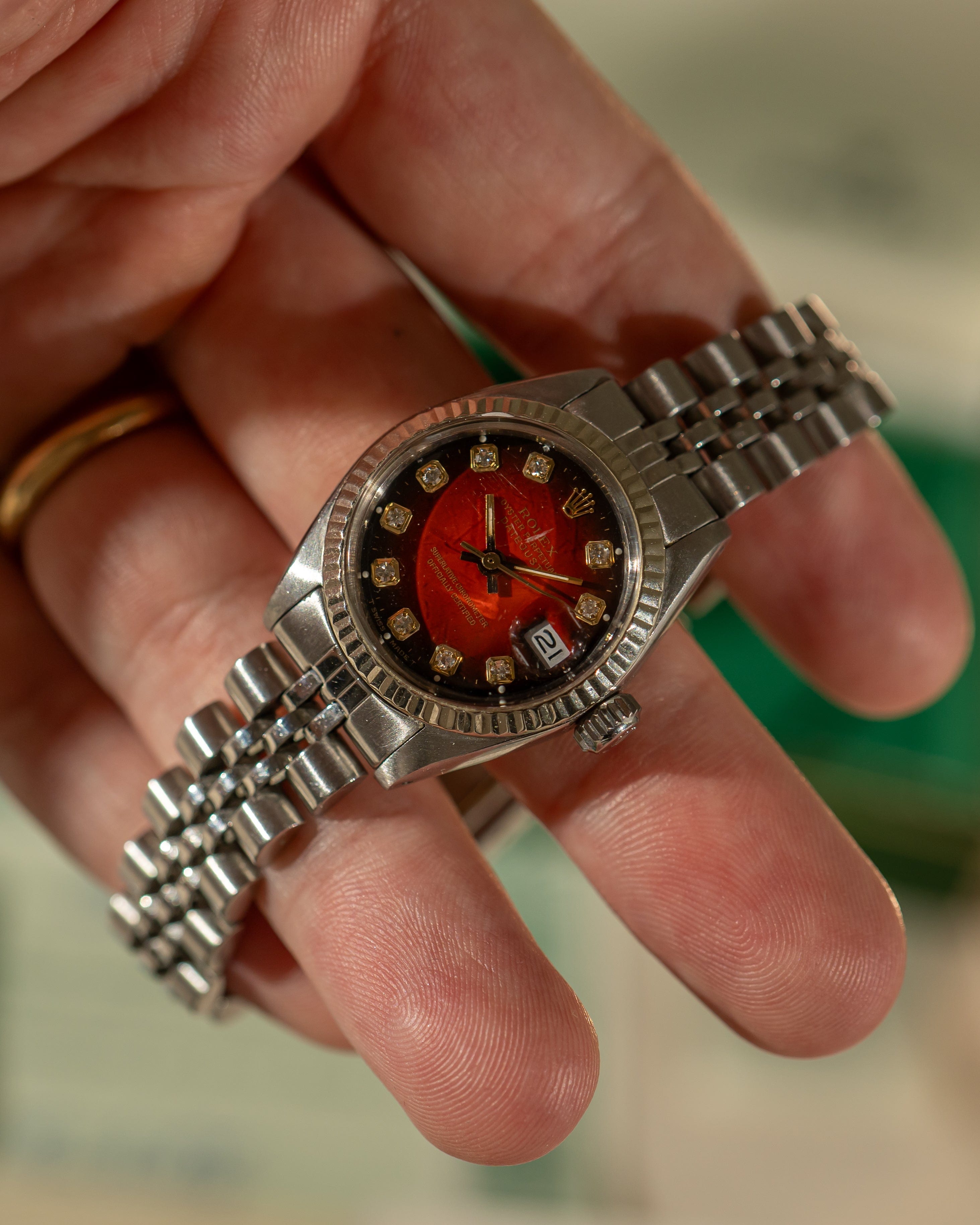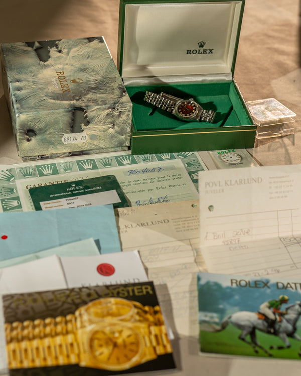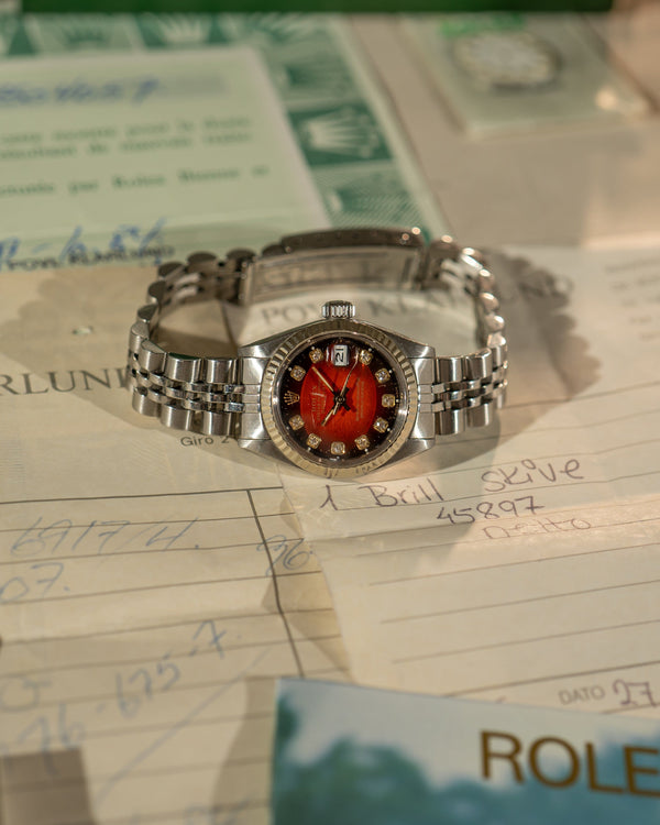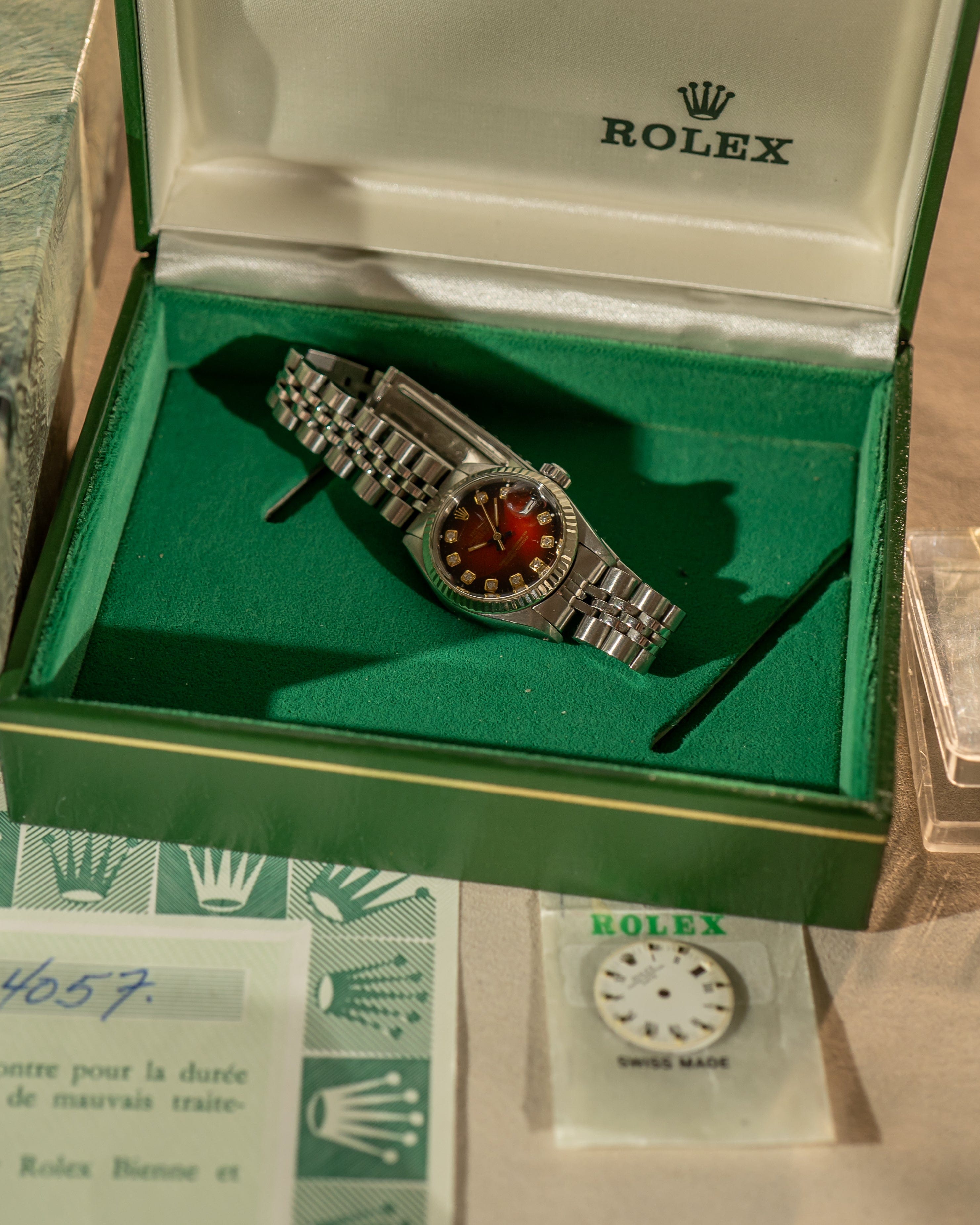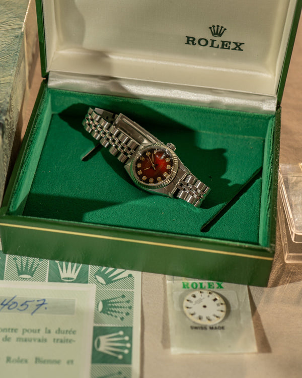 A rare and striking vintage Lady-Datejust, this reference 6917/4 stands out with a vivid factory red vignette diamond dial, complete with original box, papers, service history, and an additional dial.