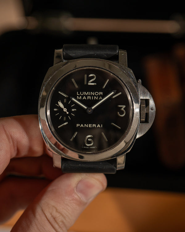 A classic from Panerai’s Historic Collection, the PAM00111 features a minimalist black dial, hand-wound movement, and signature Luminor crown guard. A collector favorite with full box and papers.