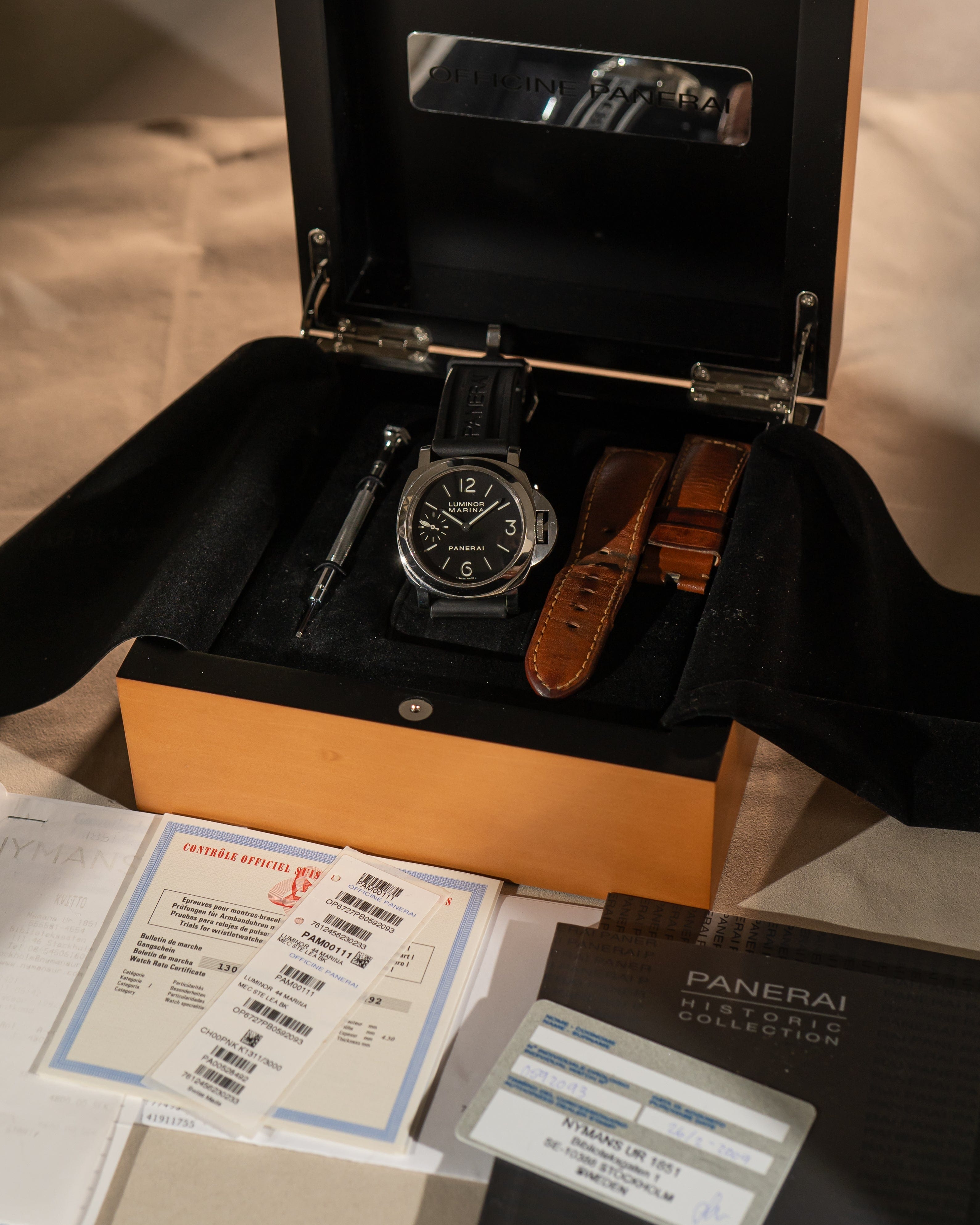 The PAM00111 is an essential reference in Panerai’s history—simple, bold, and mechanically robust. With full set provenance and service history, it’s a timeless piece for enthusiasts of the brand.