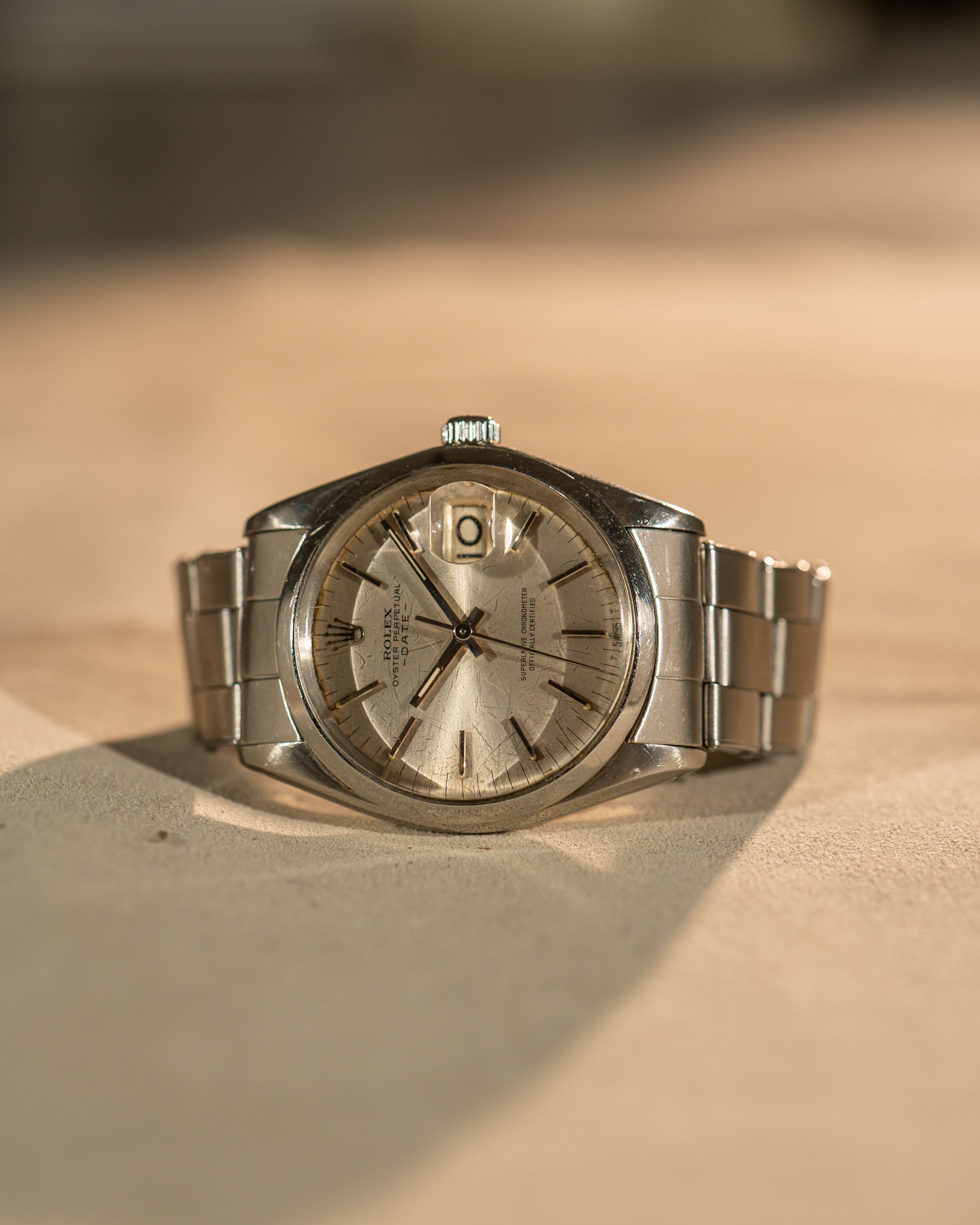 A classic mid-century Rolex with timeless proportions, the Oyster Perpetual Date ref. 1500 features a silver sunburst dial and automatic movement—an elegant daily wearer with vintage charm.