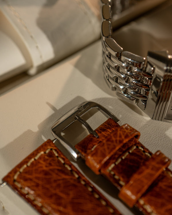 Bracelet: Stainless steel bracelet with signed clasp (includes additional brown leather strap with pin buckle)