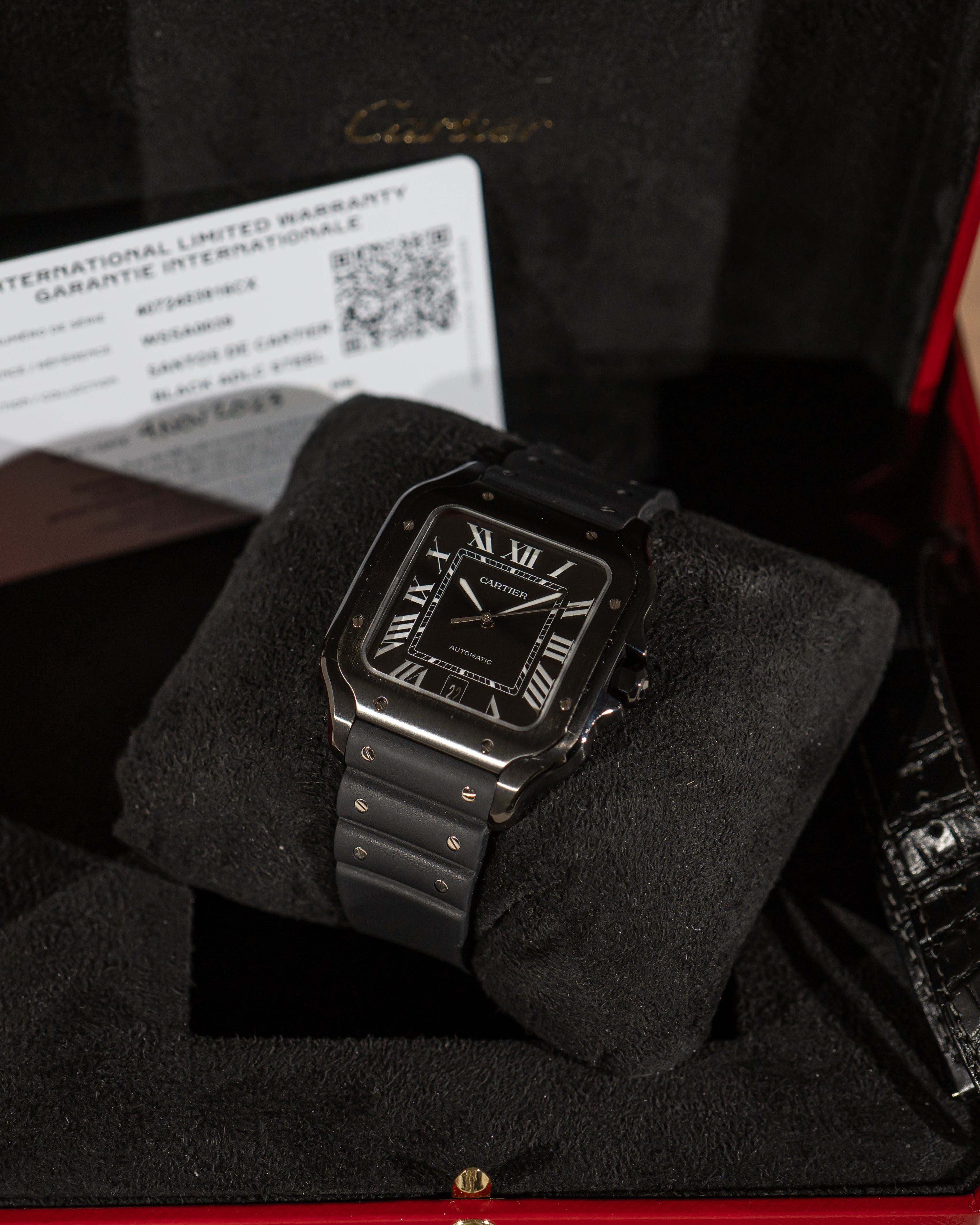 A bold take on the iconic Santos design, this Cartier WSSA0039 features a sleek black ADLC-coated case and sporty rubber strap—modern luxury with everyday versatility.