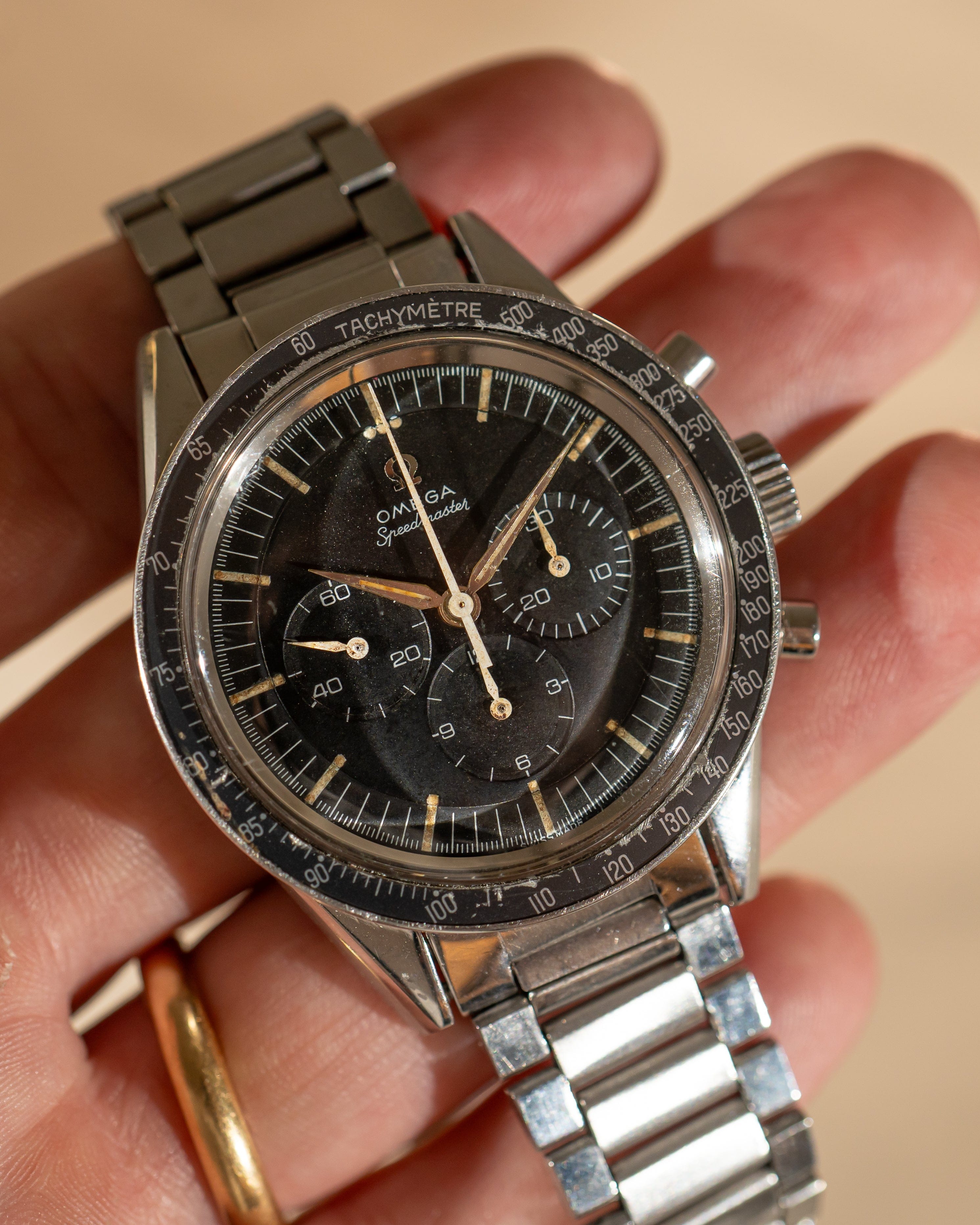Dial: Matte black stepped dial with applied Omega logo and aged tritium lume