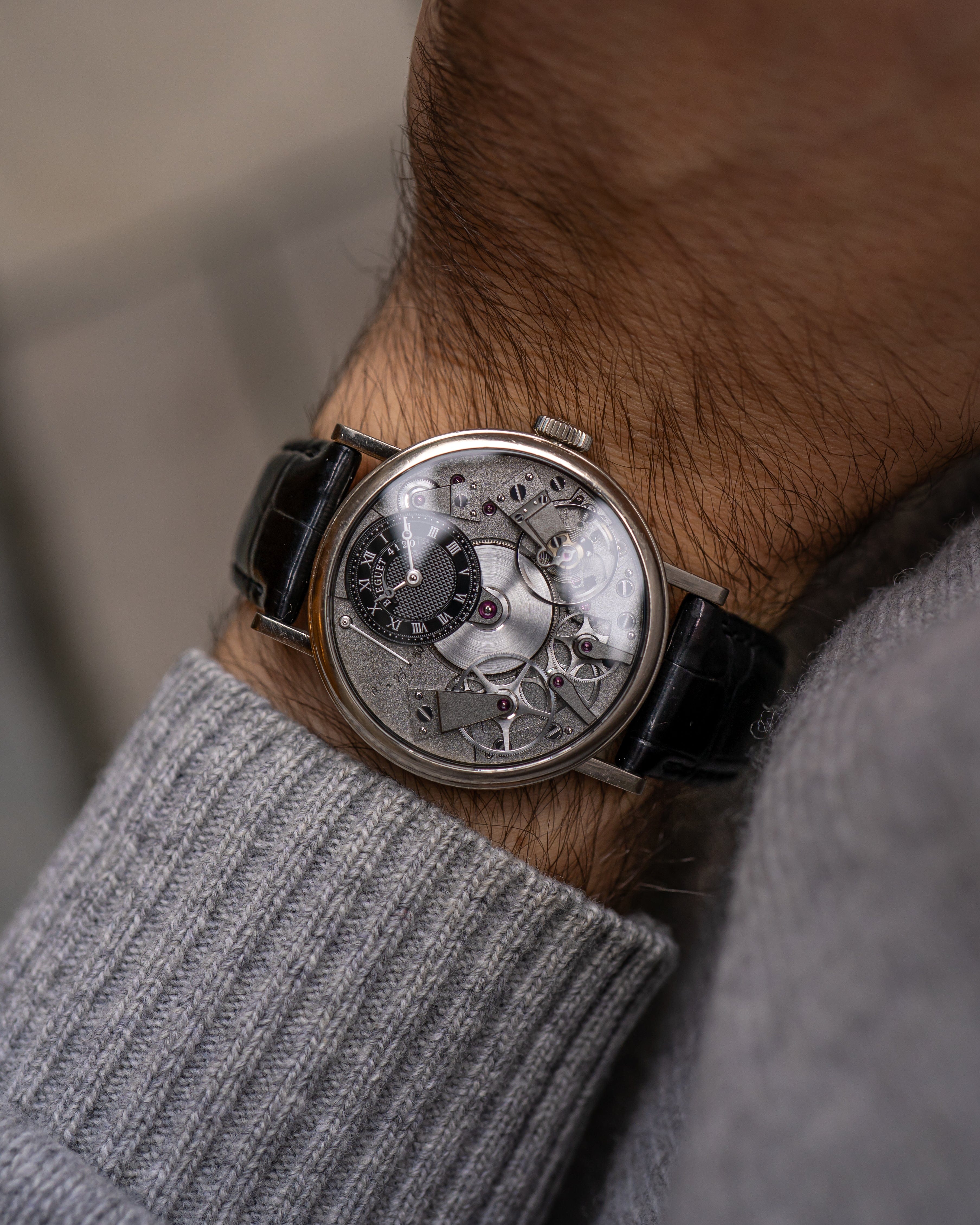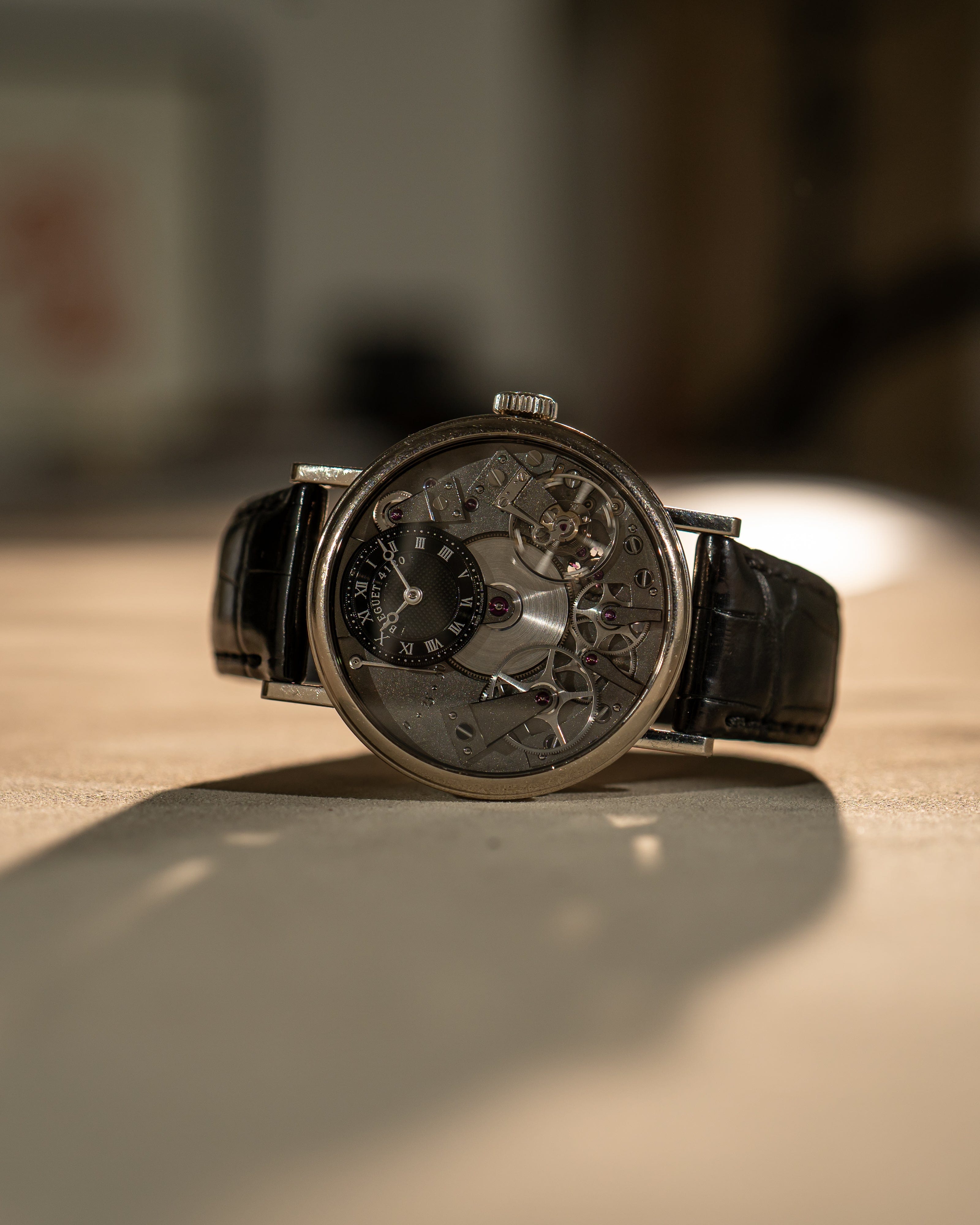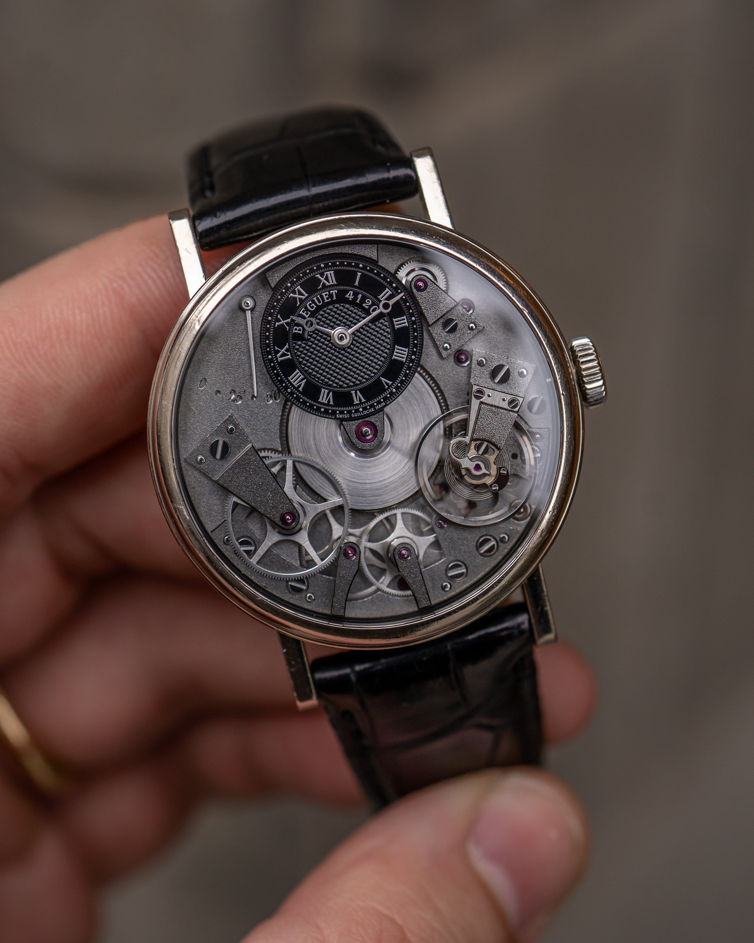 • Movement: Breguet Caliber 507DR, manual-winding, visible gear train and pare-chute shock protection